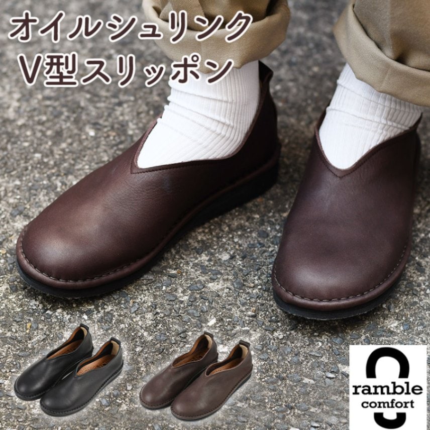 V型スリッポンシューズ 日本製 革靴 レザーシューズ レディース 女性用 歩きやすい フラットシューズ 足が痛くなりにくい ramble comfort ランブルコンフォート【サイズ交換送料半額負担】