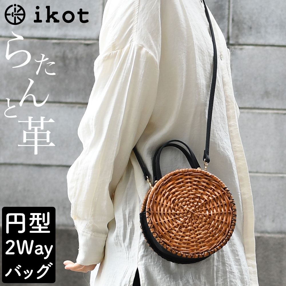籐 ラタン とう 円型ショルダーバッグ ラウンド型 カゴバッグ ポシェット 2Wayバッグ ミニショルダーバッグ ハンドバッグ レザー 本革 ikot イコット