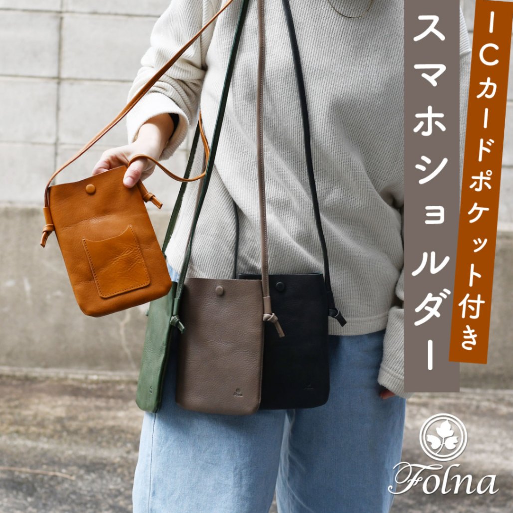 スマホショルダー Folna フォルナ 日本製 本革 スマホポシェット シュリンクレザー ICカードポケット付き コンパクト ミニマリスト 日本の革