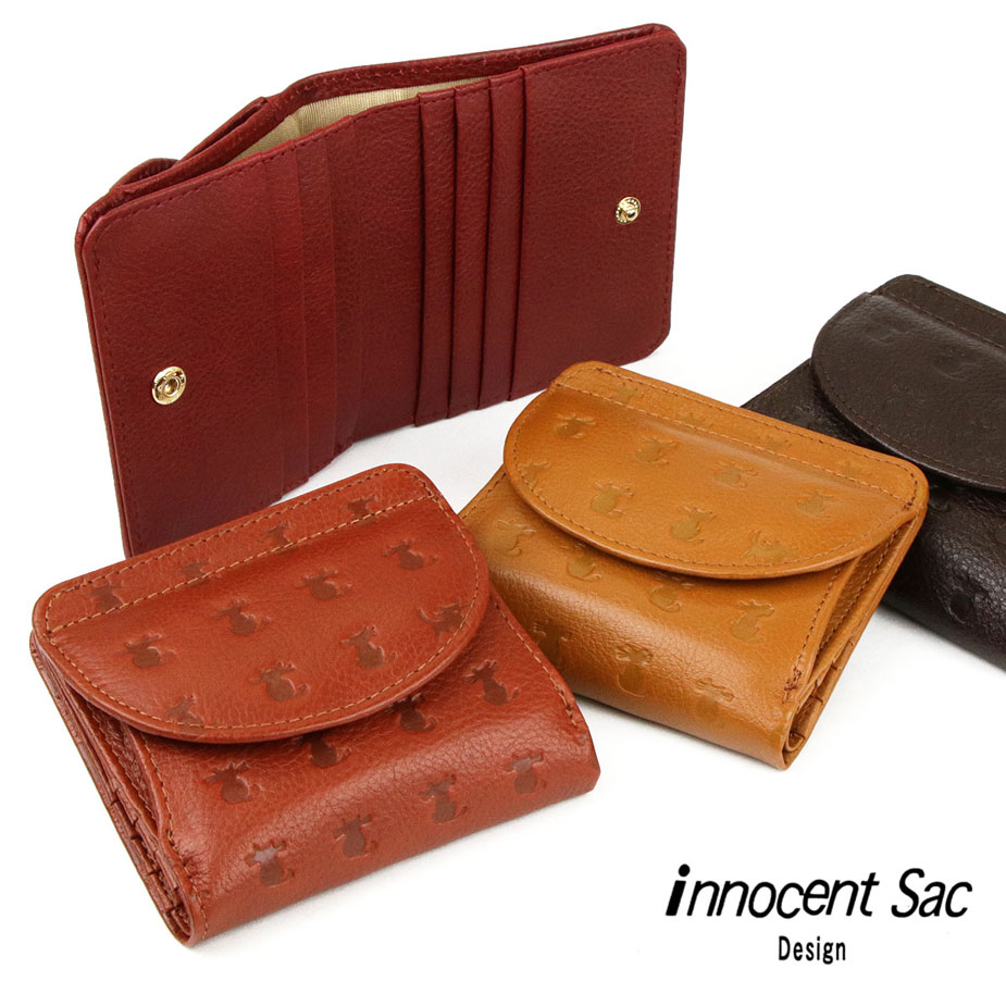 三つ折りがま口財布 コンパクトウォレット ミニ財布 型押し 猫柄 CAT ネコ 本革 日本製 innocent Sac イノセントサック