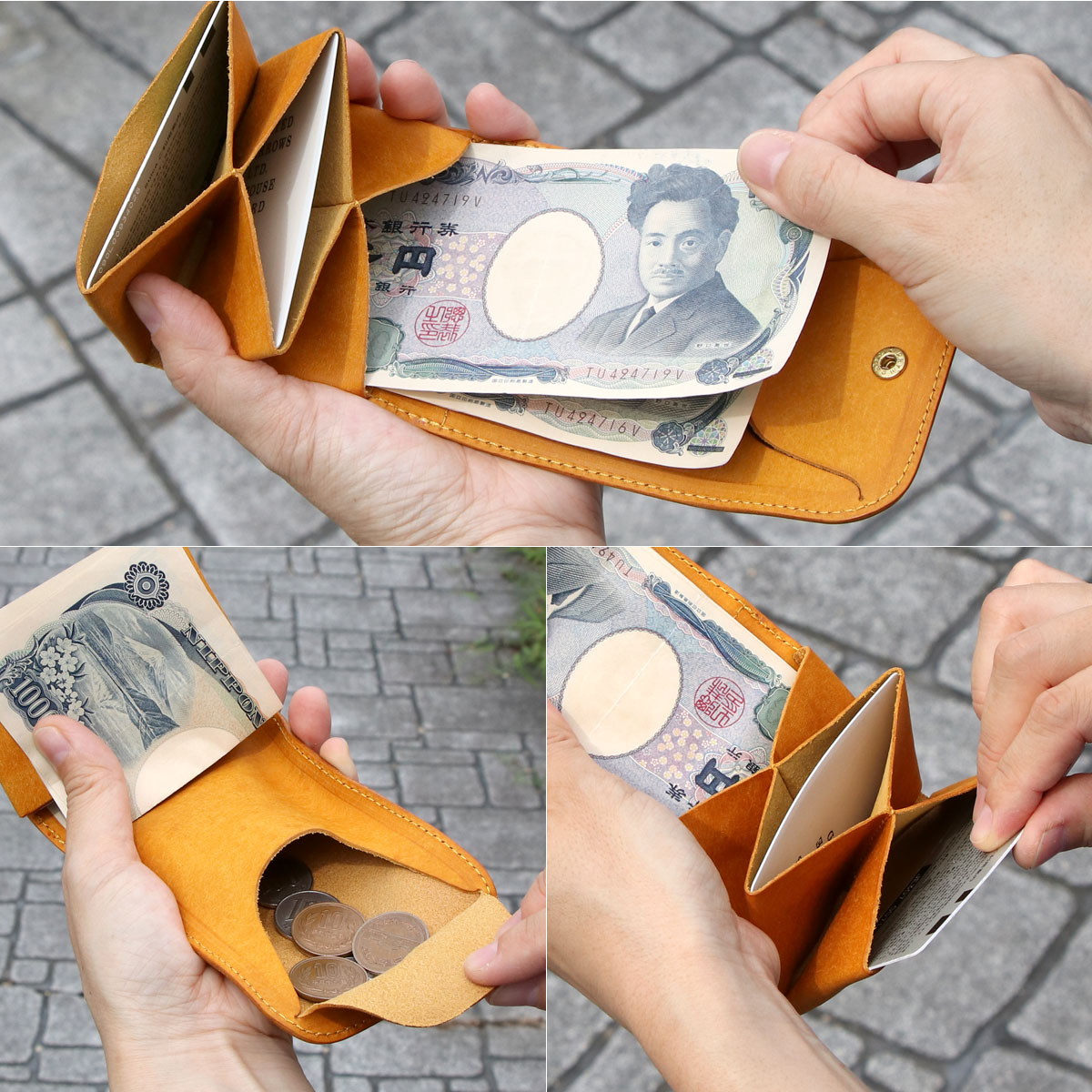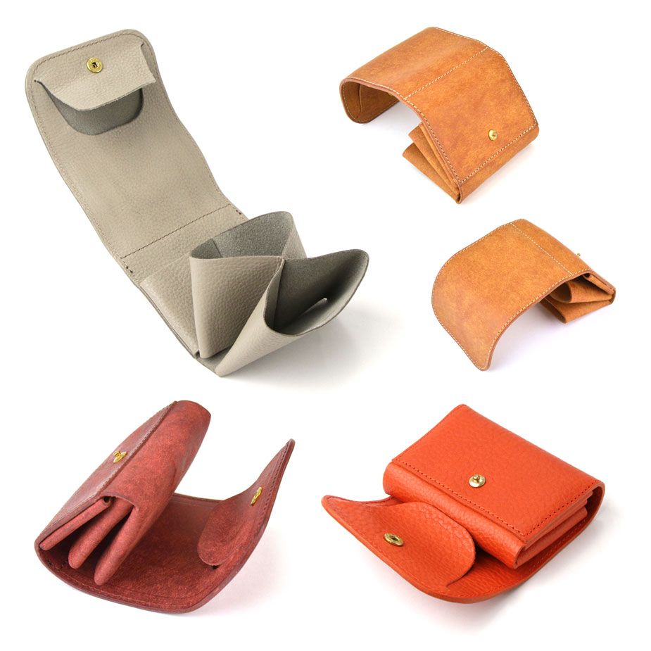 LITSTAが初めて実用新案を取得した意欲作、Tiny Walletです。本体のフラップ(かぶせ)そのものを小銭入れとして利用することで、ポケット部分の省スペース化に成功しています。コインがゼロの状態では、ポケット自体がなかったかのようにコンパクト。コイン収納時には、逆さにすると硬貨がジャラッと広がってスムーズに取り出せる、とても効率的な構造になっています。