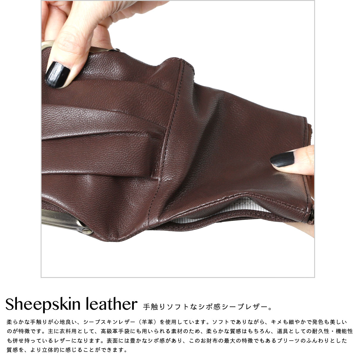 柔らかな手触りが心地良い、シープスキンレザー(羊革)を使用しています。ソフトでありながら、キメも細やかで発色も美しいのが特徴です。主に衣料用として、高級革手袋にも用いられる素材のため、柔らかな質感はもちろん、道具としての耐久性・機能性も併せ持っているレザーになります。表面には豊かなシボ感があり、このお財布の最大の特徴でもあるプリーツのふんわりとした質感を、より立体的に感じることができます。