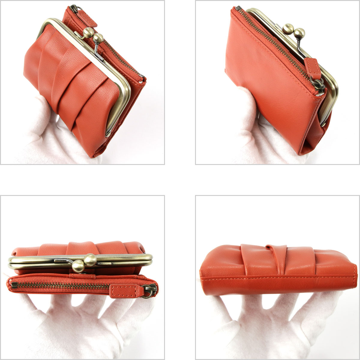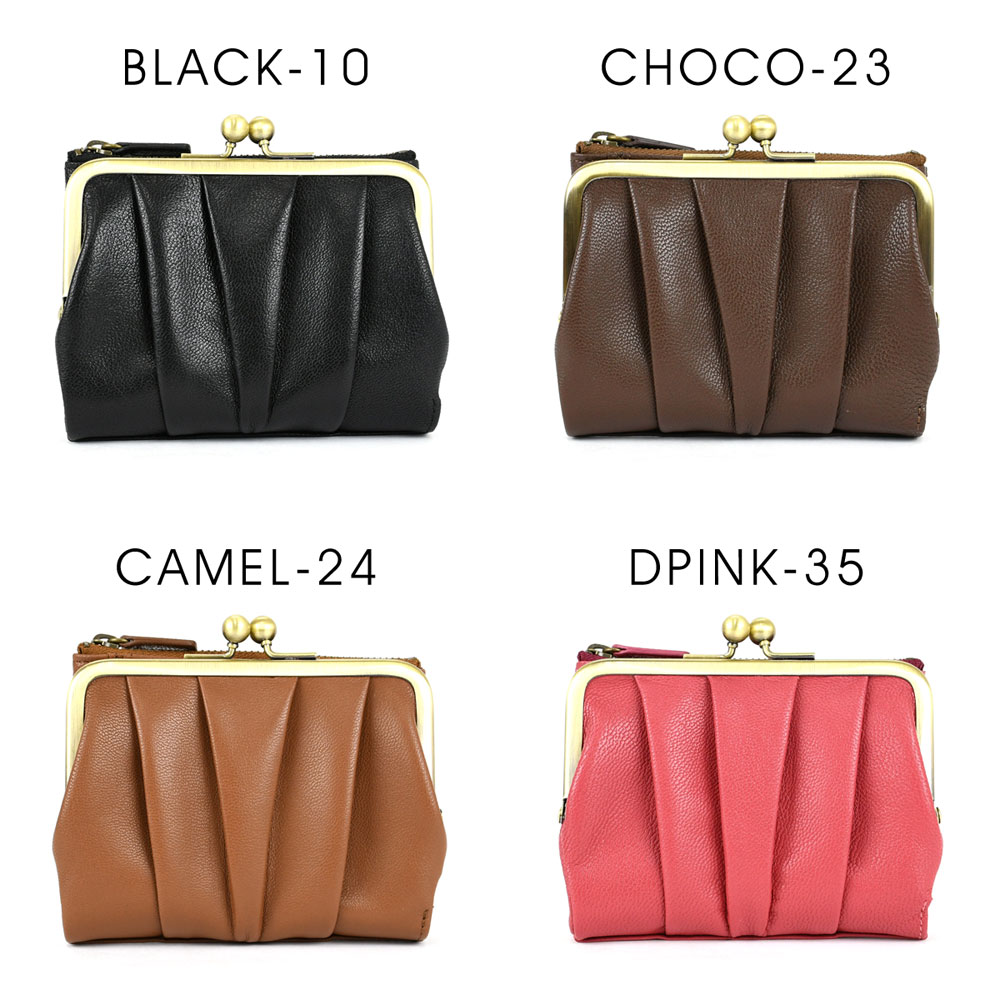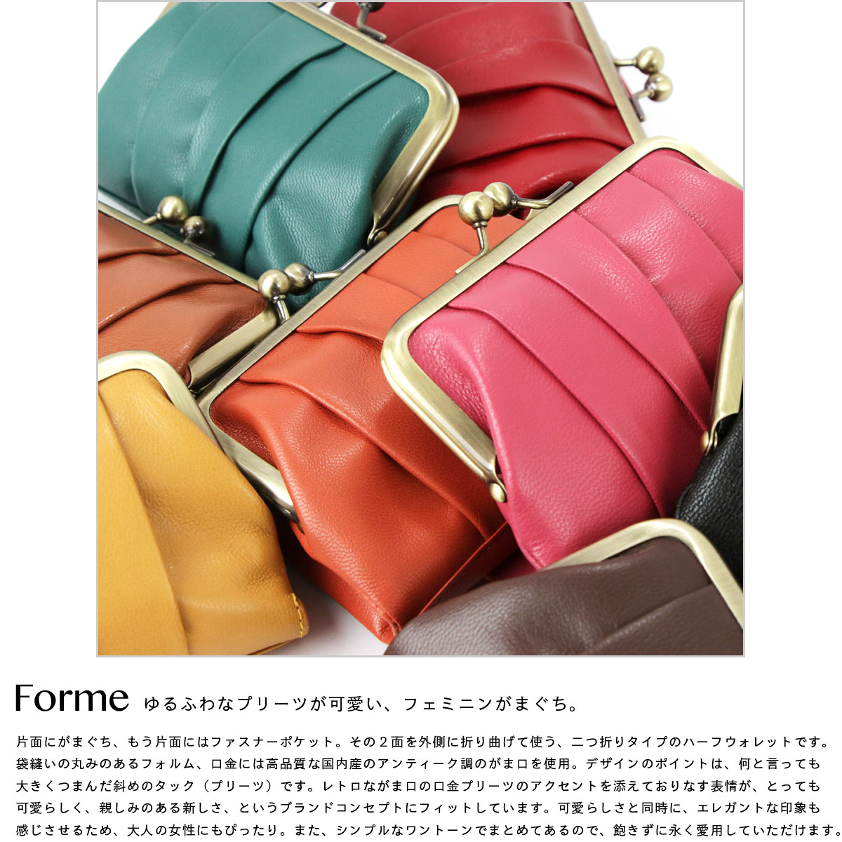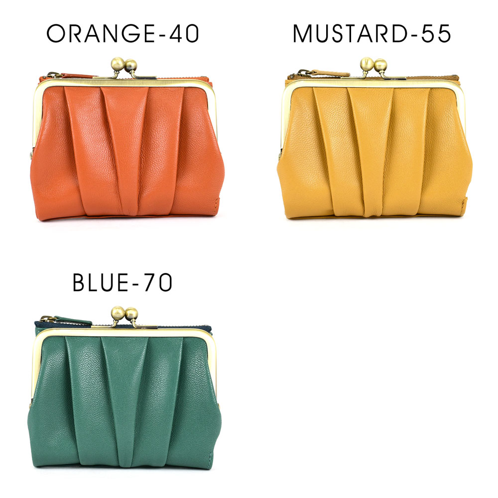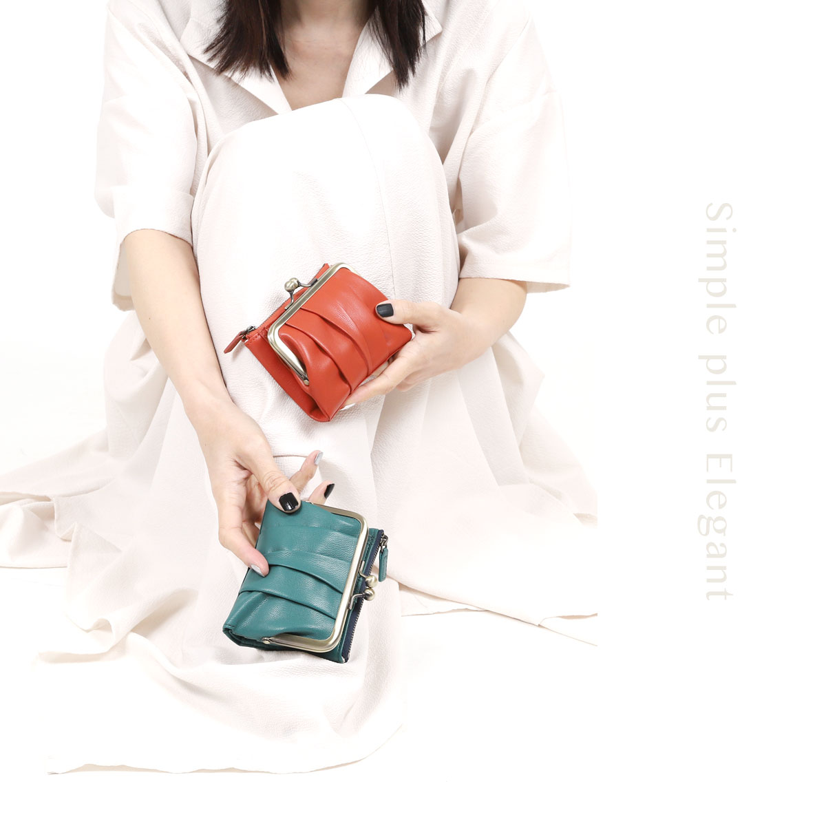 片面にがまぐち、もう片面にはファスナーポケット。その2面を外側に折り曲げて使う、二つ折りタイプのハーフウォレットです。袋縫いの丸みのあるフォルム、口金には高品質な国内産のアンティーク調のがま口を使用。デザインのポイントは、何と言っても 大きくつまんだ斜めのタック(プリーツ)です。レトロながま口の口金プリーツのアクセントを添えておりなす表情が、とっても可愛らしく、親しみのある新しさ、というブランドコンセプトにフィットしています。可愛らしさと同時に、エレガントな印象も感じさせるため、大人の女性にもぴったり。また、シンプルなワントーンでまとめてあるので、飽きずに永く愛用していただけます。