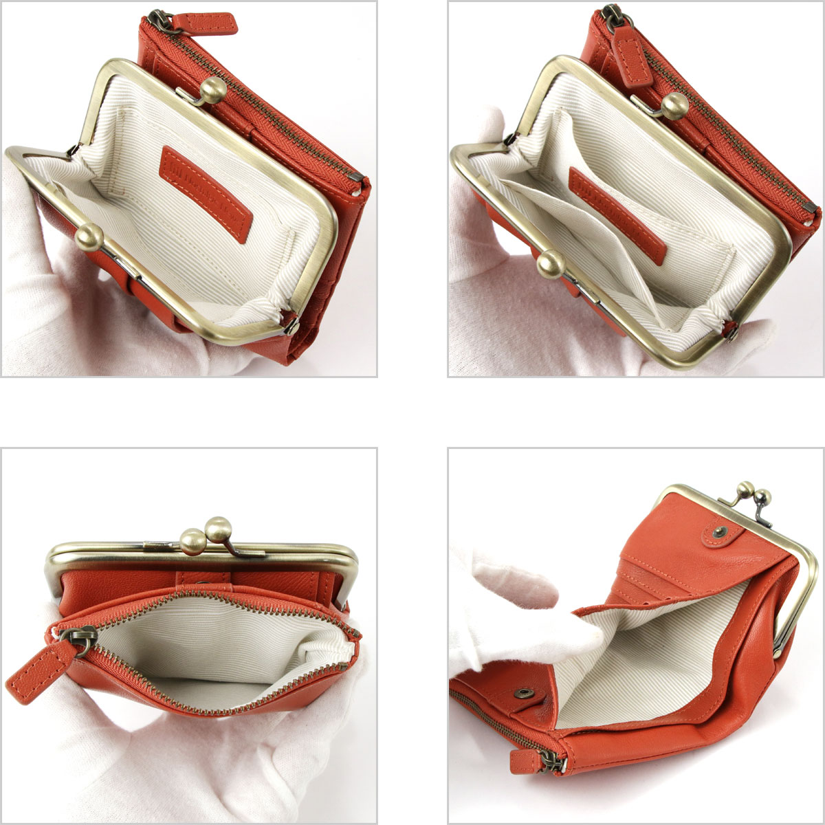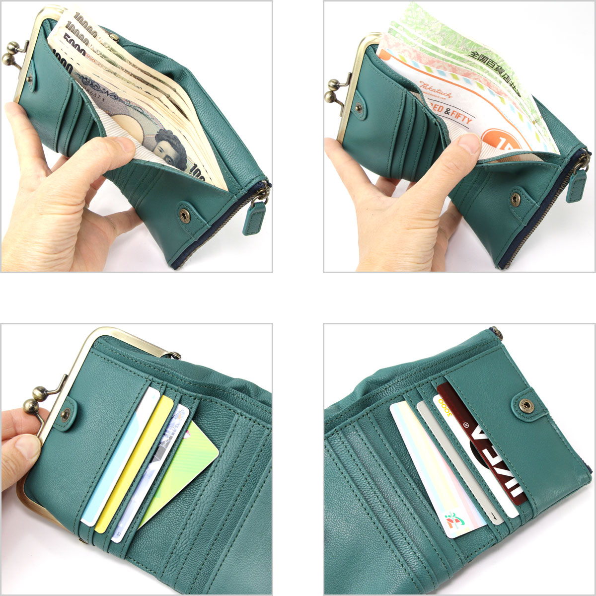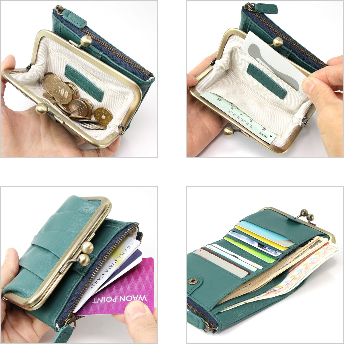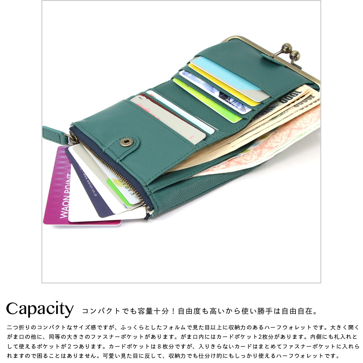 二つ折りのコンパクトなサイズ感ですが、ふっくらとしたフォルムで見た目以上に収納力のあるハーフウォレットです。大きく開くがま口の他に、同等の大きさのファスナーポケットがあります。がま口内にはカードポケット2枚分があります。内側にも札入れとして使えるポケットが2つあります。カードポケットは8枚分ですが、入りきらないカードはまとめてファスナーポケットに入れられますので困ることはありません。可愛い見た目に反して、収納力でも仕分け的にもしっかり使えるハーフウォレットです。