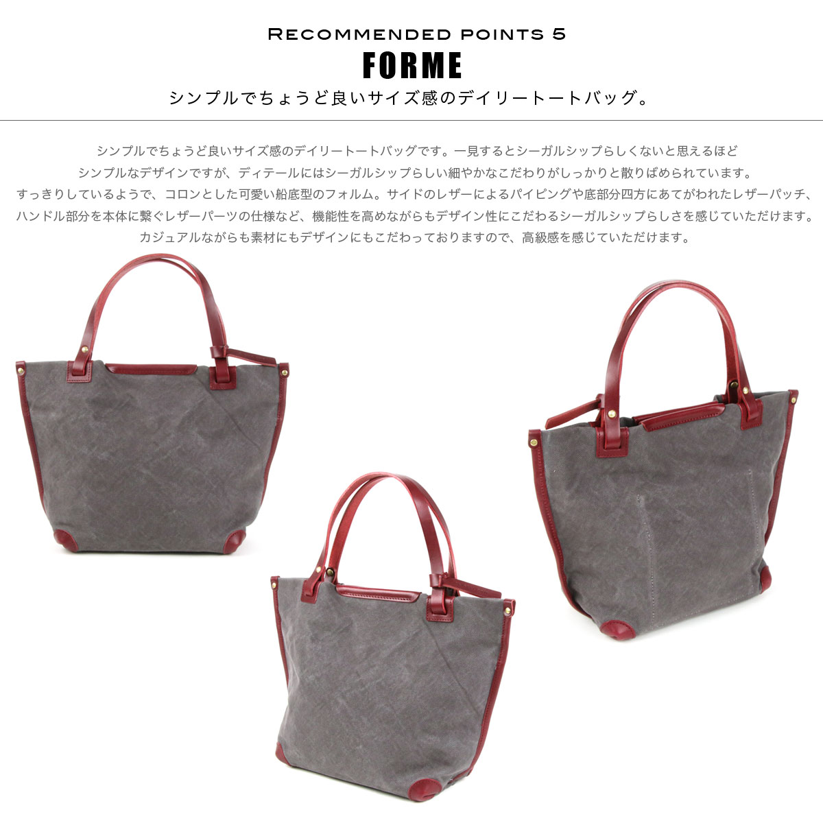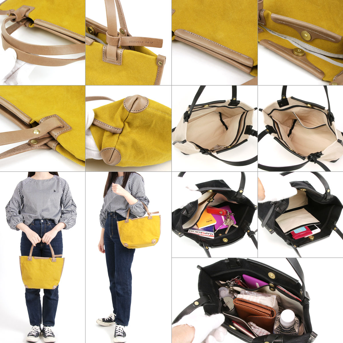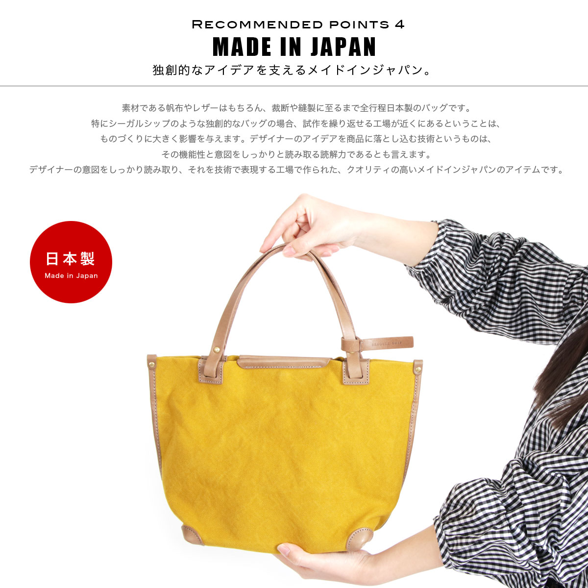 シンプルでちょうど良いサイズ感のデイリートートバッグです。一見するとシーガルシップらしくないと思えるほどシンプルなデザインですが、ディテールにはシーガルシップらしい細やかなこだわりがしっかりと散りばめられています。すっきりしているようで、コロンとした可愛い船底型のフォルム。サイドのレザーによるパイピングや底部分四方にあてがわれたレザーパッチ、ハンドル部分を本体に繋ぐレザーパーツの仕様など、機能性を高めながらもデザイン性にこだわるシーガルシップらしさを感じていただけます。カジュアルながらも素材にもデザインにもこだわっておりますので、高級感を感じていただけます。