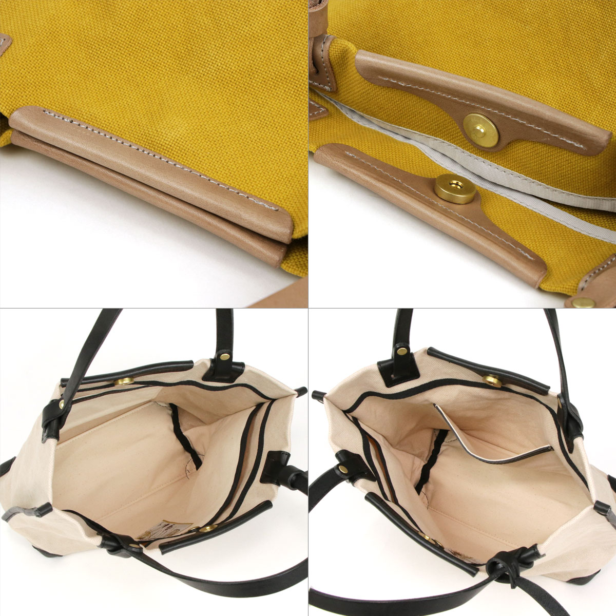 余計な機能性を省いてシンプルな使い勝手にこだわったアクティブな仕様のトートバッグ/ハンドバッグです。外側にはポケットなどのないシンプルな仕様で、メインポケットはマグネットボタンでの開閉となります。メインポケットを開けると、内側にはミニポケットが1つと、ボタン開閉による大きく使えるポケットが1つの仕様となります。必要最低限の仕様となりますので、ご自身でポーチやバッグインバッグを使用してカスタマイズすることにより、自由度高くお使いいただけます。シンプルな仕様で間仕切りも少ないため、非常に軽量で快適にお使いいただけます。