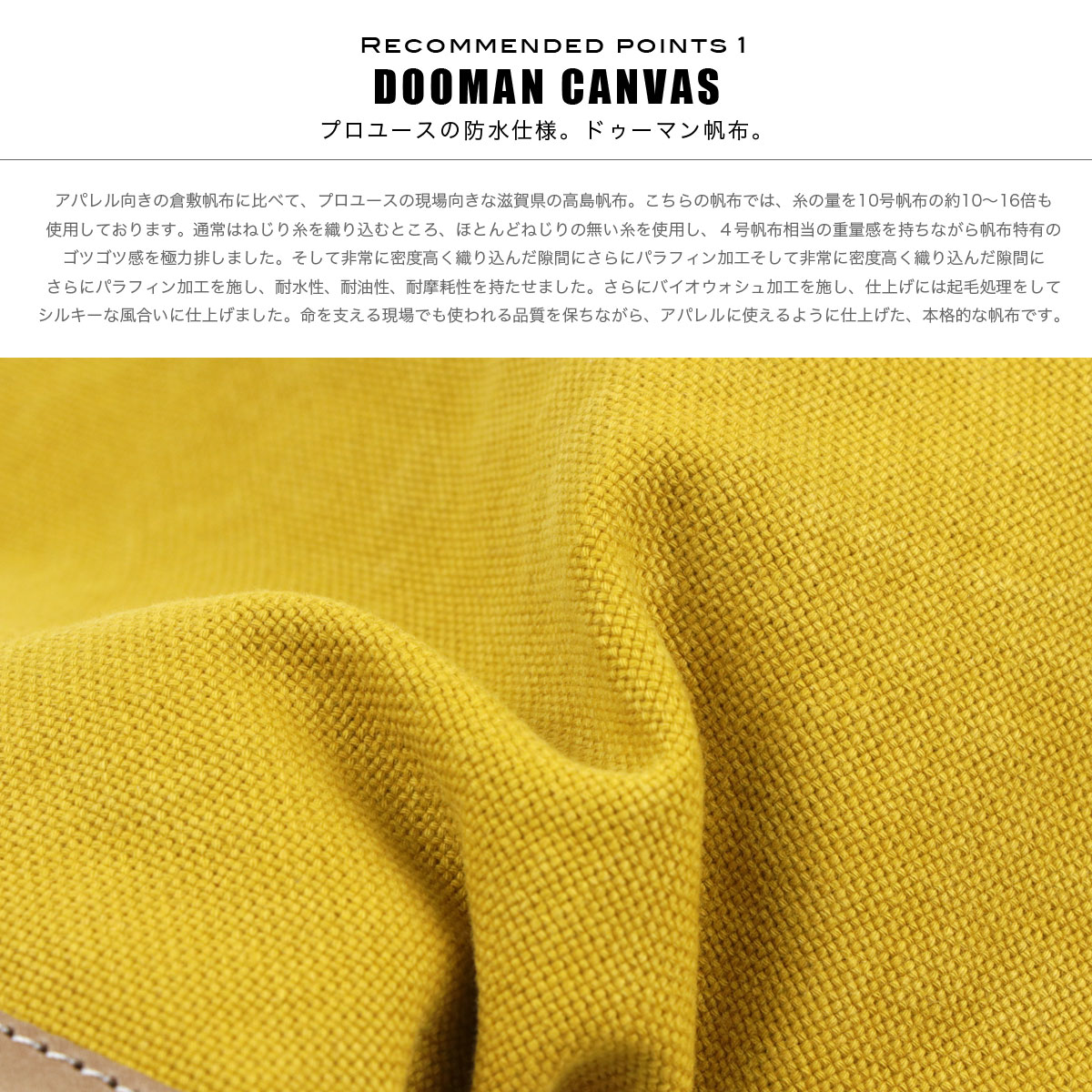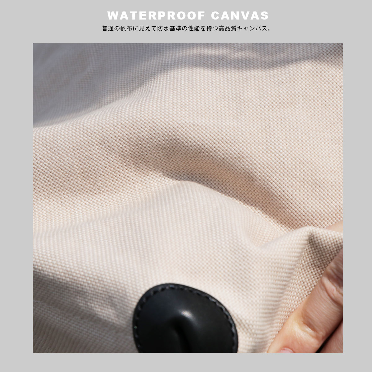 アパレル向きの倉敷帆布に比べて、プロユースの現場向きな滋賀県の高島帆布。こちらの帆布では、糸の量を10号帆布の約10〜16倍も使用しております。通常はねじり糸を織り込むところ、ほとんどねじりの無い糸を使用し、4号帆布相当の重量感を持ちながら帆布特有のゴツゴツ感を極力排しました。そして非常に密度高く織り込んだ隙間にさらにパラフィン加工そして非常に密度高く織り込んだ隙間にさらにパラフィン加工を施し、耐水性、耐油性、耐摩耗性を持たせました。さらにバイオウォシュ加工を施し、仕上げには起毛処理をしてシルキーな風合いに仕上げました。命を支える現場でも使われる品質を保ちながら、アパレルに使えるように仕上げた、本格的な帆布です。