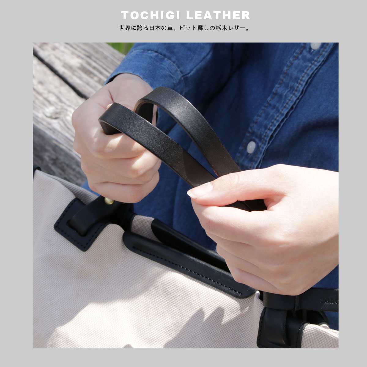 負荷のかかるパーツには繊維の詰まった別注仕様の栃木レザーを使用しております。フルベジタブルタンニン鞣しの名タンナーとして知られる栃木レザーですが、ドラムと呼ばれる巨大な洗濯機のような機械ではなく、ピットと呼ばれる巨大な水槽で時間をかけて鞣されたレザーは、振動や衝撃により繊維が壊される事なく、キメの詰まった硬めの仕上がりになるのが特徴です。強靭で伸びにくい性質を持つ栃木レザーを不可のかかるパーツに使用することは、デザインのアクセントとしてはもちろん、機能的にも理にかなっているのです。
