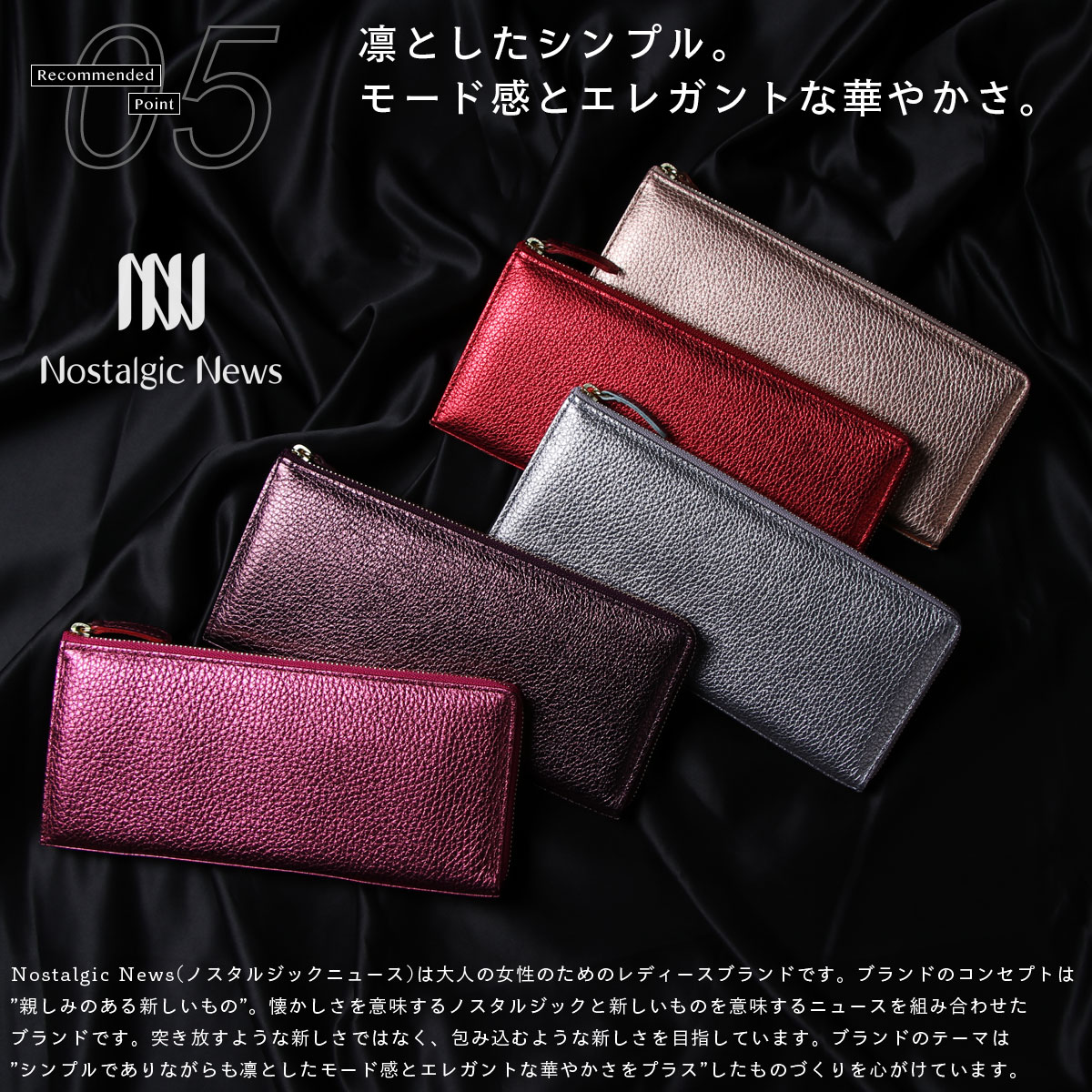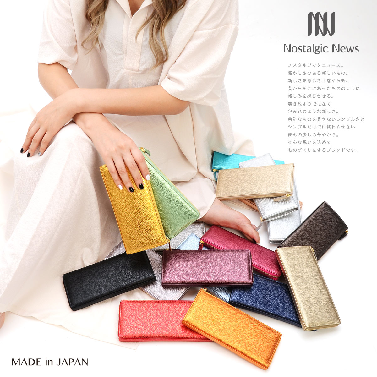 Nostalgic News(ノスタルジックニュース)は大人の女性のためのレディースブランドです。ブランドのコンセプトは”親しみのある新しいもの”。懐かしさを意味するノスタルジックと新しいものを意味するニュースを組み合わせたブランドです。突き放すような新しさではなく、包み込むような新しさを目指しています。ブランドのテーマは”シンプルでありながらも凛としたモード感とエレガントな華やかさをプラス”したものづくりを心がけています。