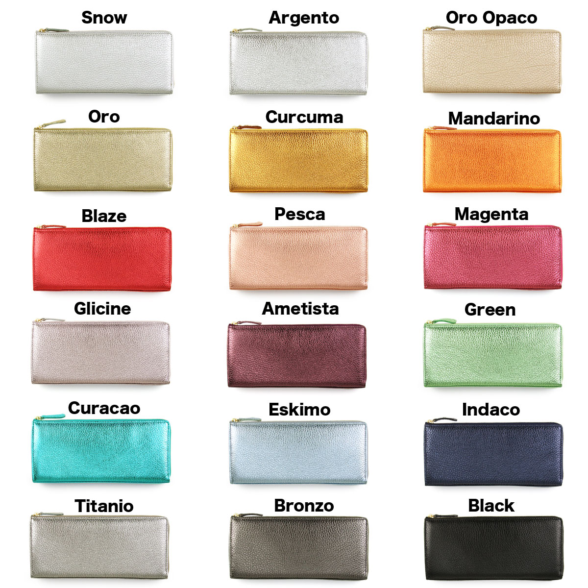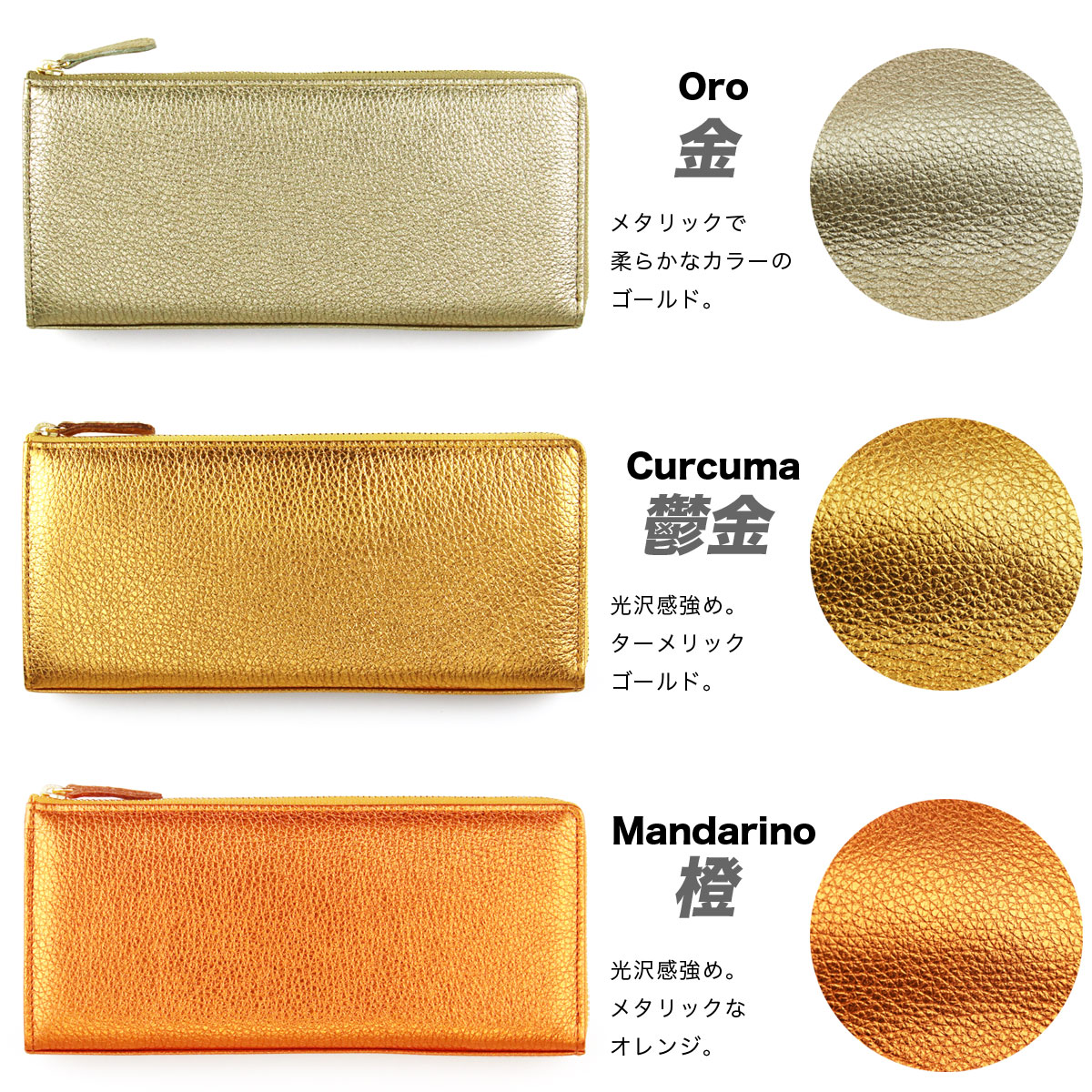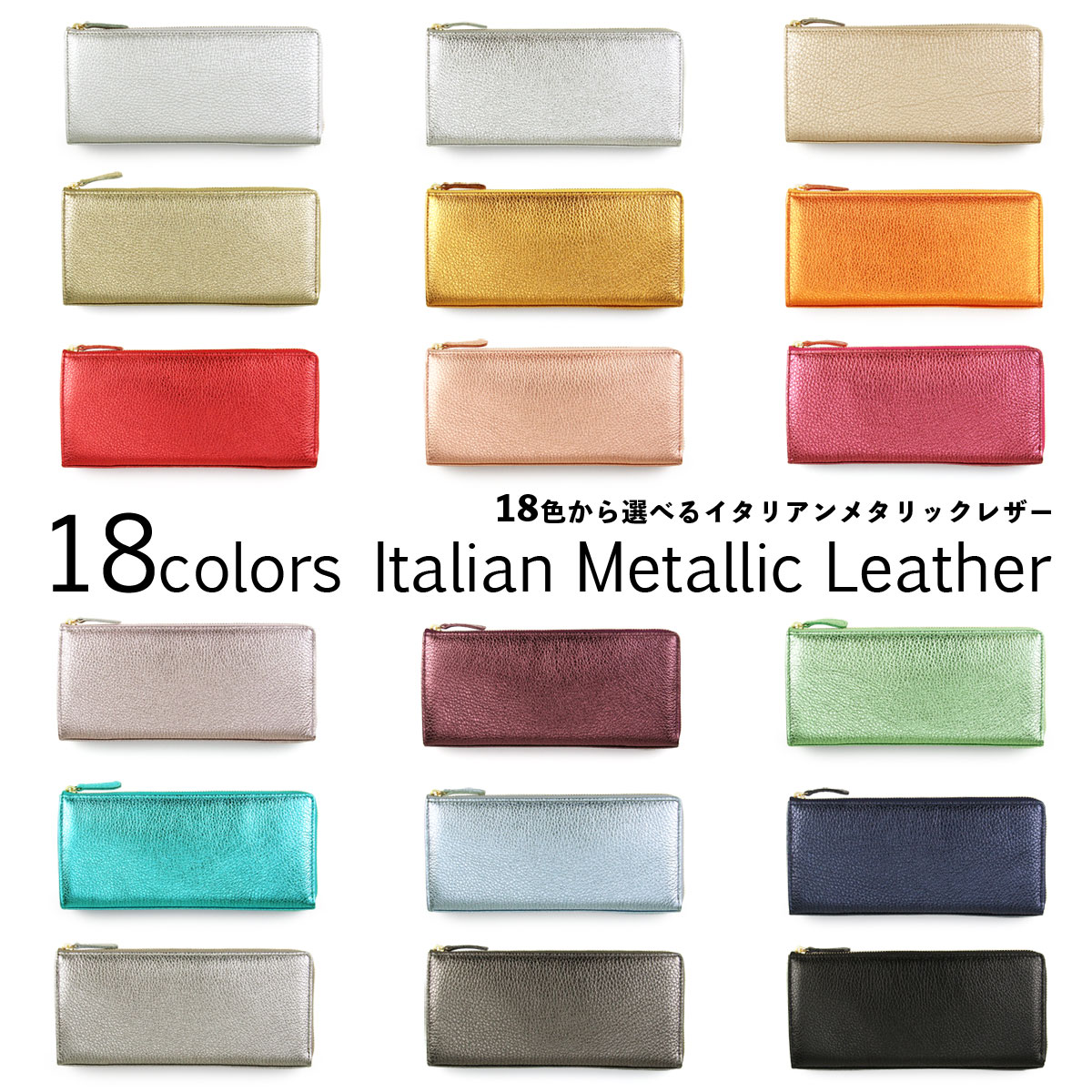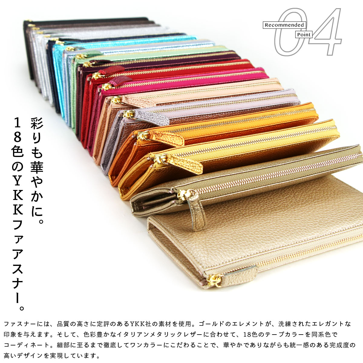 ファスナーには、品質の高さに定評のあるYKK社の素材を使用。ゴールドのエレメントが、洗練されたエレガントな印象を与えます。そして、色彩豊かなイタリアンメタリックレザーに合わせて、18色のテープカラーを同系色でコーディネート。細部に至るまで徹底してワンカラーにこだわることで、華やかでありながらも統一感のある完成度の高いデザインを実現しています。