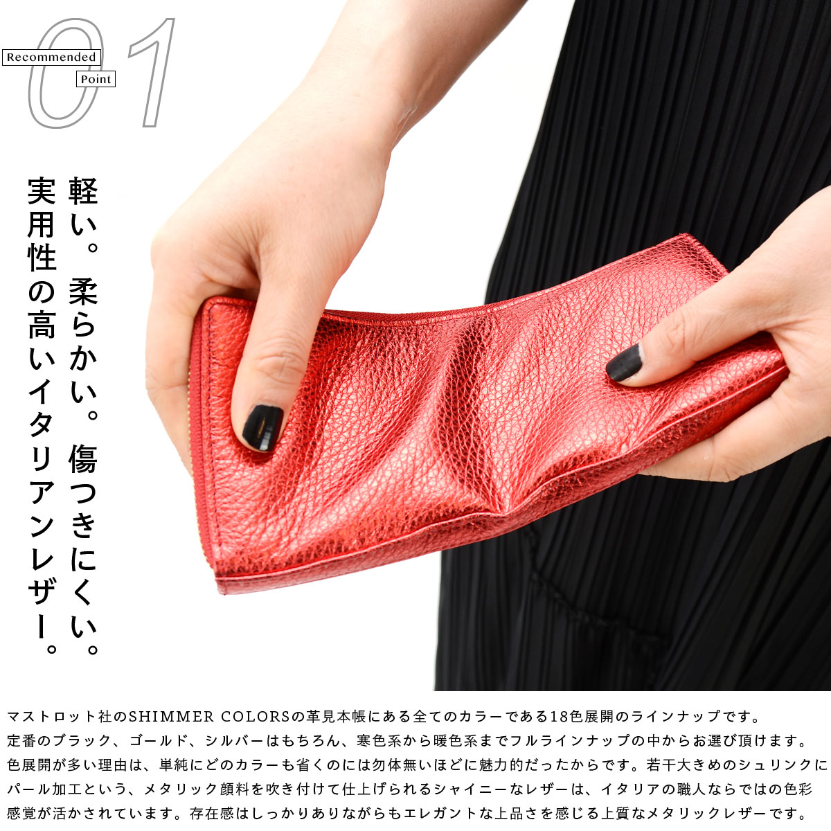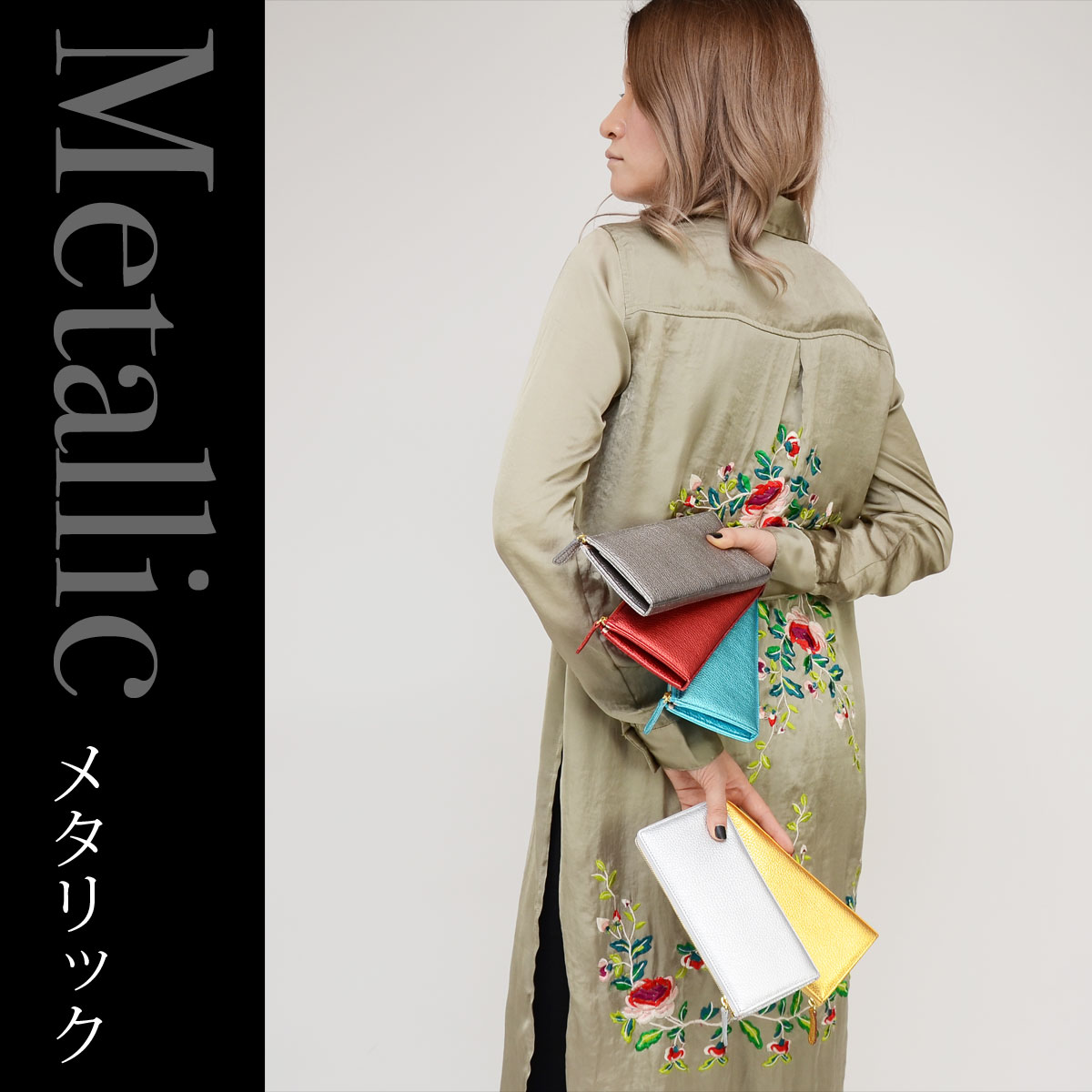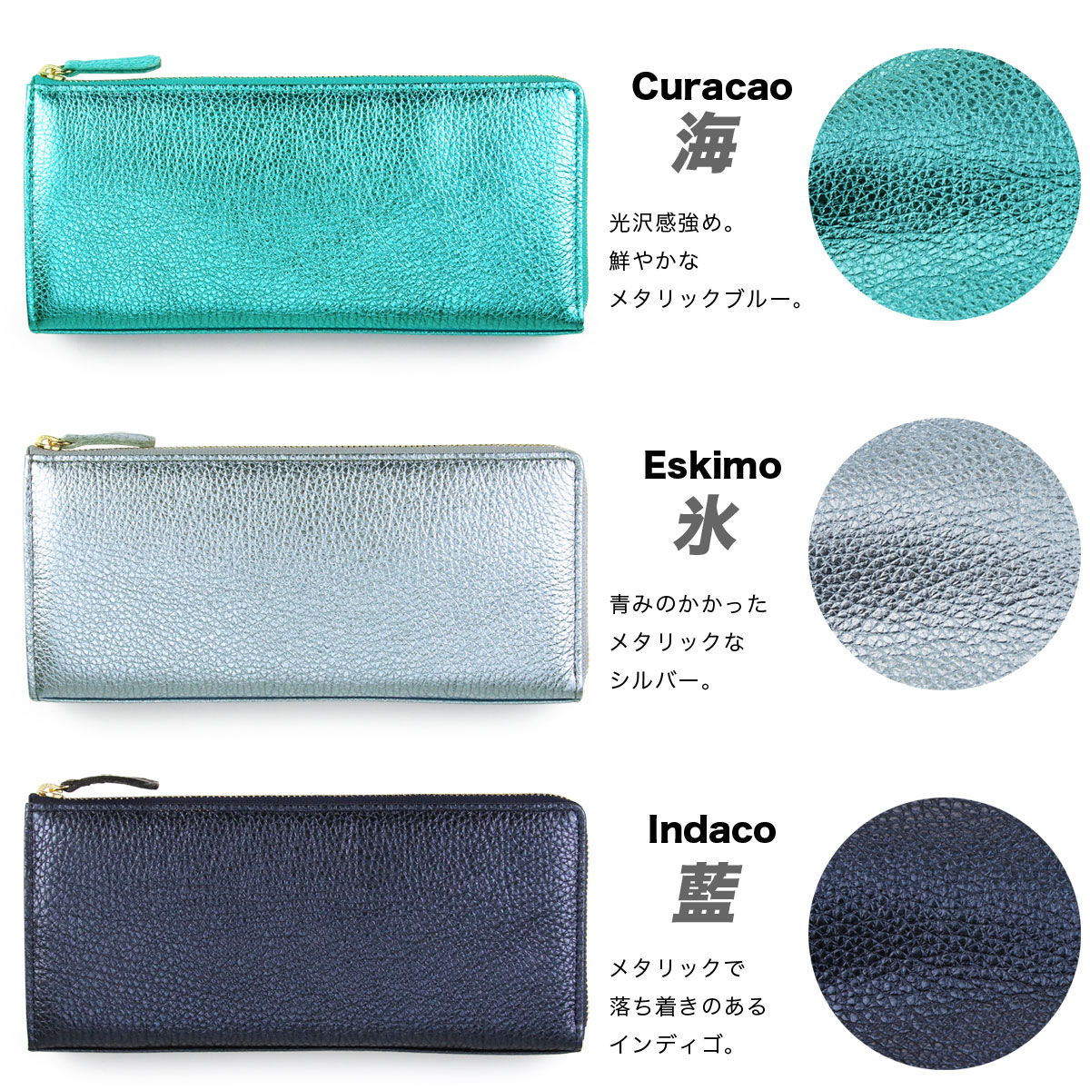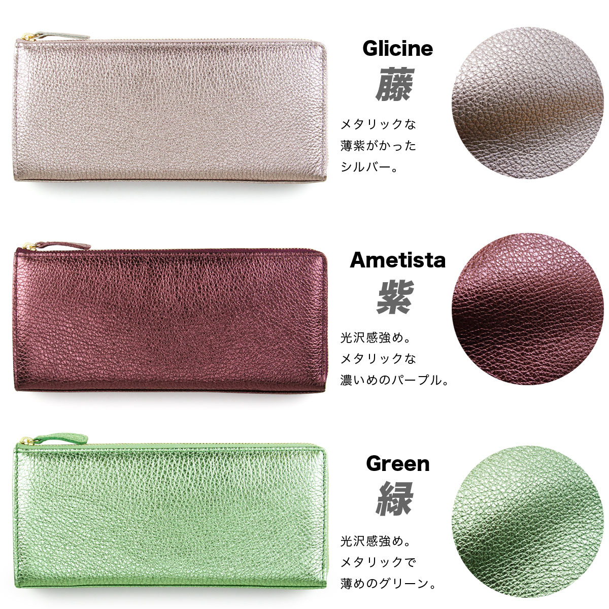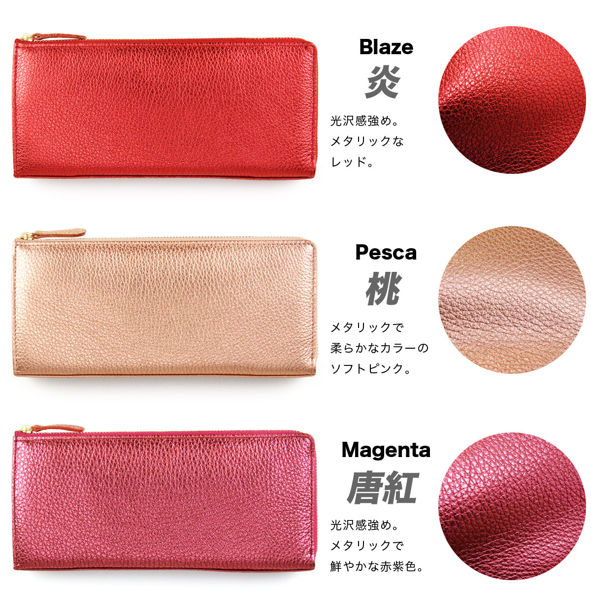 ファスナーには、品質の高さに定評のあるYKK社の素材を使用。ゴールドのエレメントが、洗練されたエレガントな印象を与えます。そして、色彩豊かなイタリアンメタリックレザーに合わせて、18色のテープカラーを同系色でコーディネート。細部に至るまで徹底してワンカラーにこだわることで、華やかでありながらも統一感のある完成度の高いデザインを実現しています。