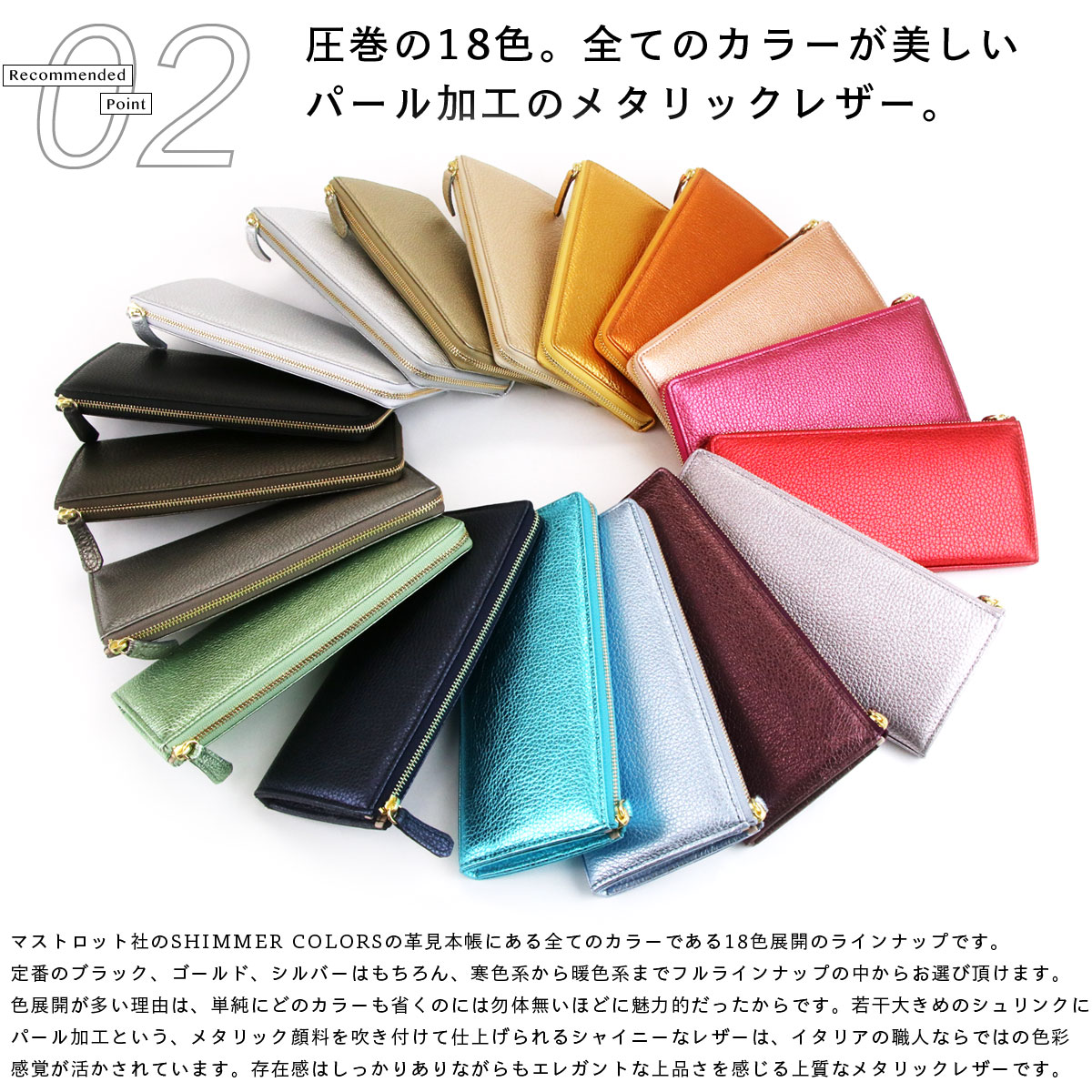 マストロット社のSHIMMER COLORSの革見本帳にある全てのカラーである18色展開のラインナップです。定番のブラック、ゴールド、シルバーはもちろん、寒色系から暖色系までフルラインナップの中からお選び頂けます。色展開が多い理由は、単純にどのカラーも省くのには勿体無いほどに魅力的だったからです。若干大きめのシュリンクにパール加工という、メタリック顔料を吹き付けて仕上げられるシャイニーなレザーは、イタリアの職人ならではの色彩感覚が活かされています。存在感はしっかりありながらもエレガントな上品さを感じる上質なメタリックレザーです。