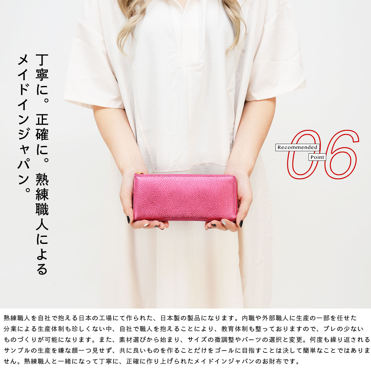 熟練職人を自社で抱える日本の工場にて作られた、日本製の製品になります。内職や外部職人に生産の一部を任せた分業による生産体制も珍しくない中、自社で職人を抱えることにより、教育体制も整っておりますので、ブレの少ないものづくりが可能になります。また、素材選びから始まり、サイズの微調整やパーツの選択と変更。何度も繰り返されるサンプルの生産を嫌な顔一つ見せず、共に良いものを作ることだけをゴールに目指すことは決して簡単なことではありません。熟練職人と一緒になって丁寧に、正確に作り上げられたメイドインジャパンのお財布です。