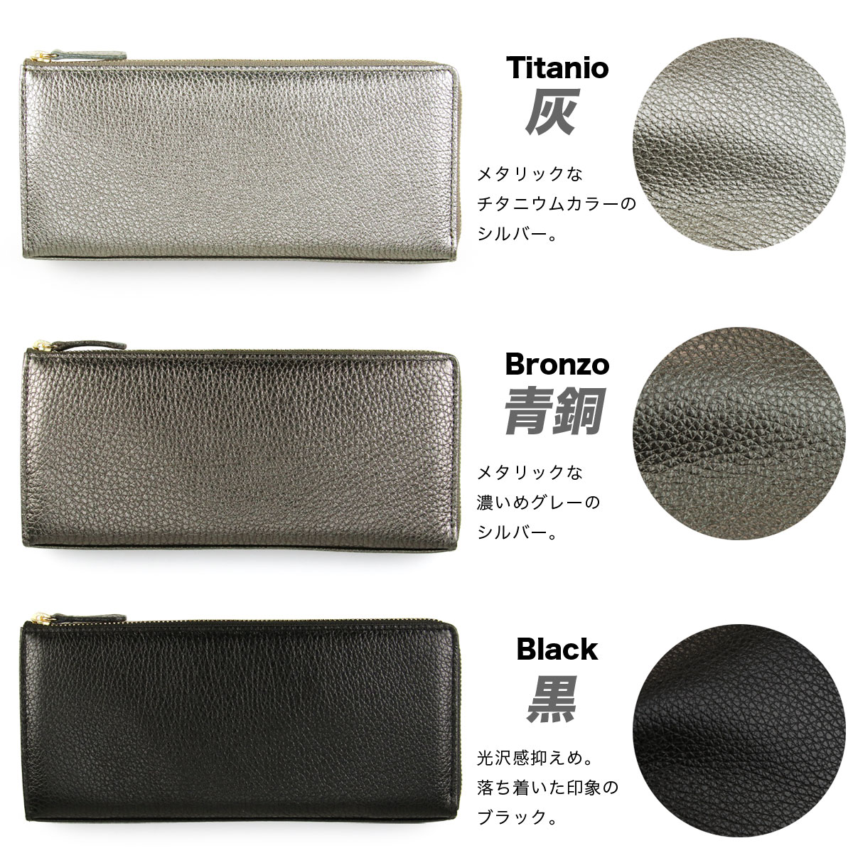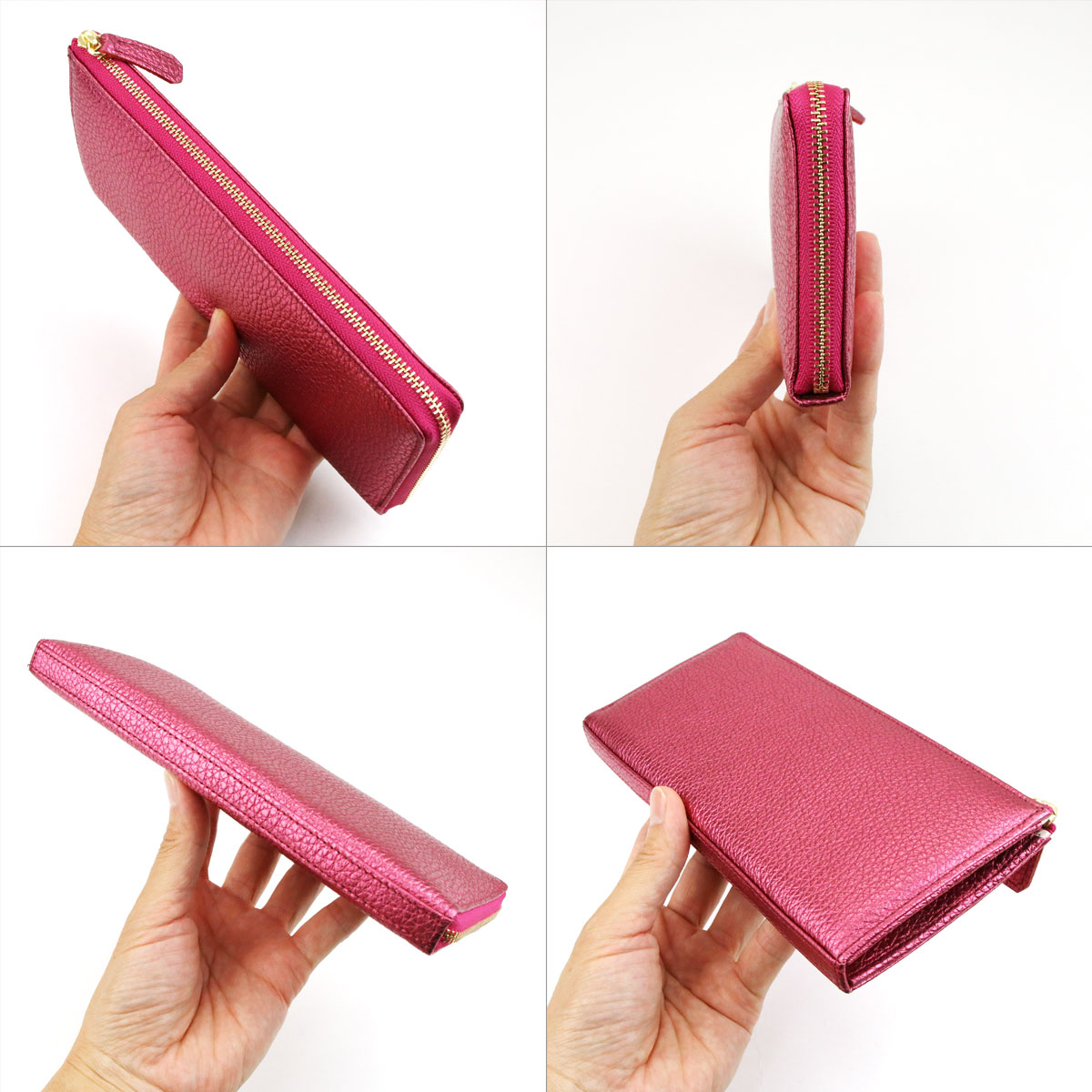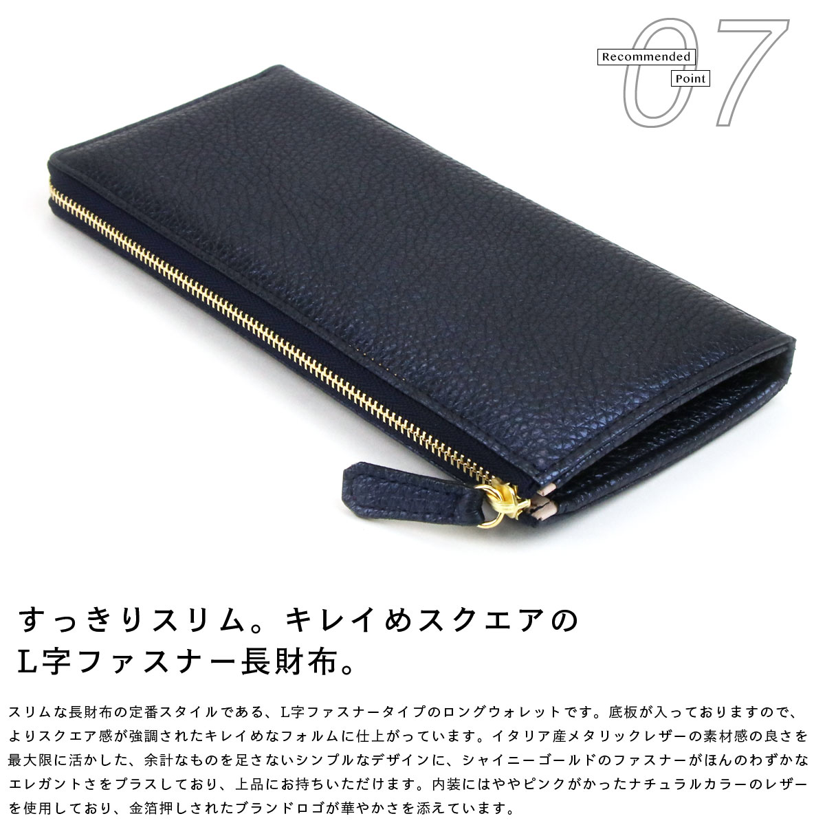 スリムな長財布の定番スタイルである、L字ファスナータイプのロングウォレットです。底板が入っておりますので、よりスクエア感が強調されたキレイめなフォルムに仕上がっています。イタリア産メタリックレザーの素材感の良さを最大限に活かした、余計なものを足さないシンプルなデザインに、シャイニーゴールドのファスナーがほんのわずかなエレガントさをプラスしており、上品にお持ちいただけます。内装にはややピンクがかったナチュラルカラーのレザーを使用しており、金箔押しされたブランドロゴが華やかさを添えています。