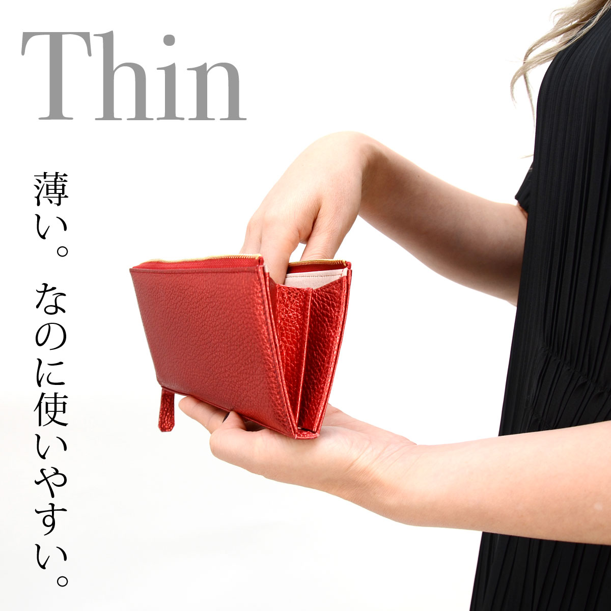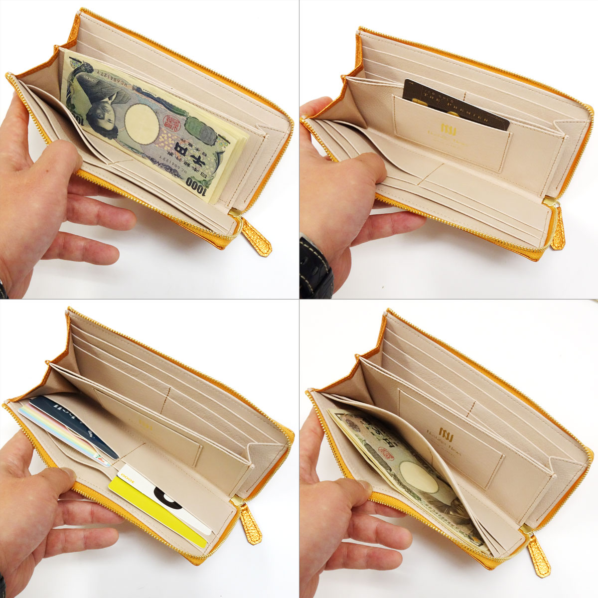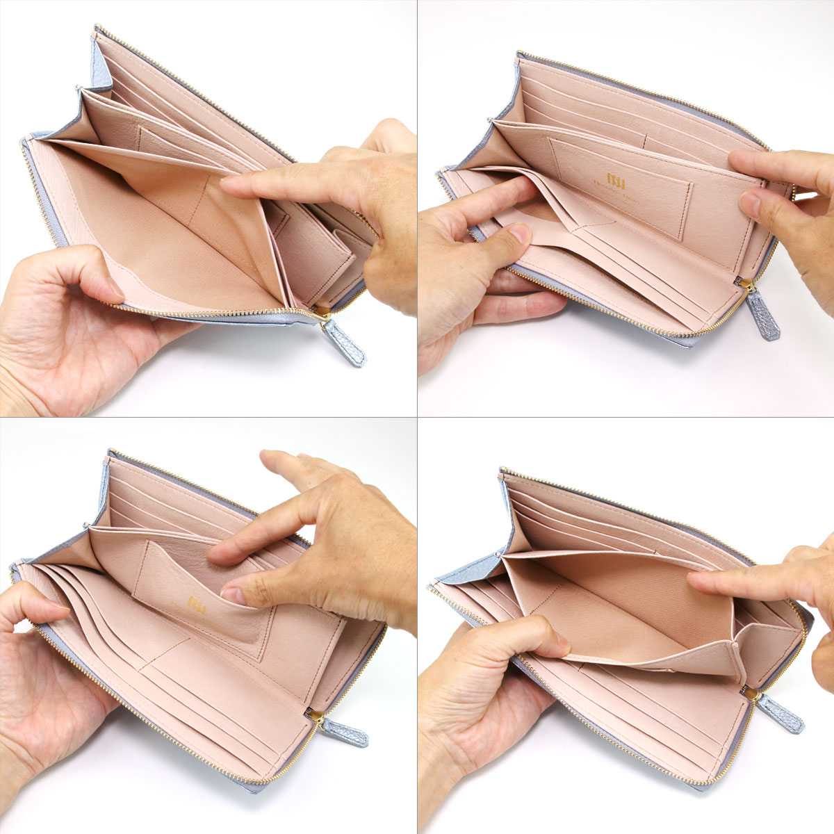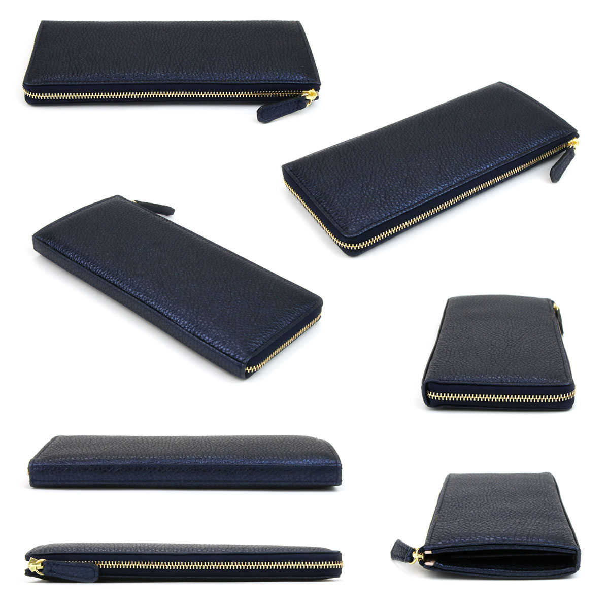 スリムな長財布の定番スタイルである、L字ファスナータイプのロングウォレットです。底板が入っておりますので、よりスクエア感が強調されたキレイめなフォルムに仕上がっています。イタリア産メタリックレザーの素材感の良さを最大限に活かした、余計なものを足さないシンプルなデザインに、シャイニーゴールドのファスナーがほんのわずかなエレガントさをプラスしており、上品にお持ちいただけます。内装にはややピンクがかったナチュラルカラーのレザーを使用しており、金箔押しされたブランドロゴが華やかさを添えています。