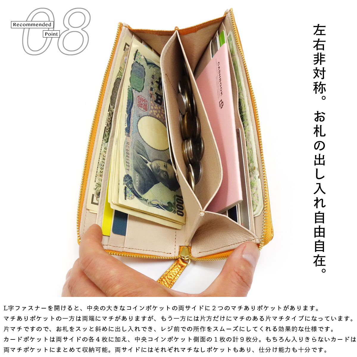 L字ファスナーを開けると、中央の大きなコインポケットの両サイドに2つのマチありポケットがあります。マチありポケットの一方は両端にマチがありますが、もう一方には片方だけにマチのある片マチタイプになっています。片マチですので、お札をスッと斜めに出し入れでき、レジ前での所作をスムーズにしてくれる効果的な仕様です。カードポケットは両サイドの各4枚に加え、中央コインポケット側面の1枚の計9枚分。もちろん入りきらないカードは両マチポケットにまとめて収納可能。両サイドにはそれぞれマチなしポケットもあり、仕分け能力も十分です。