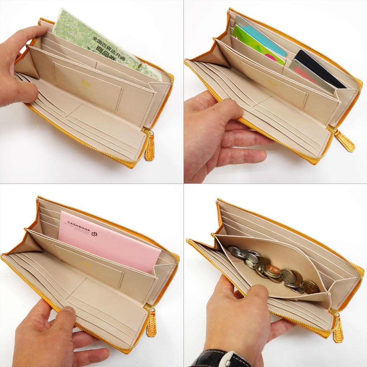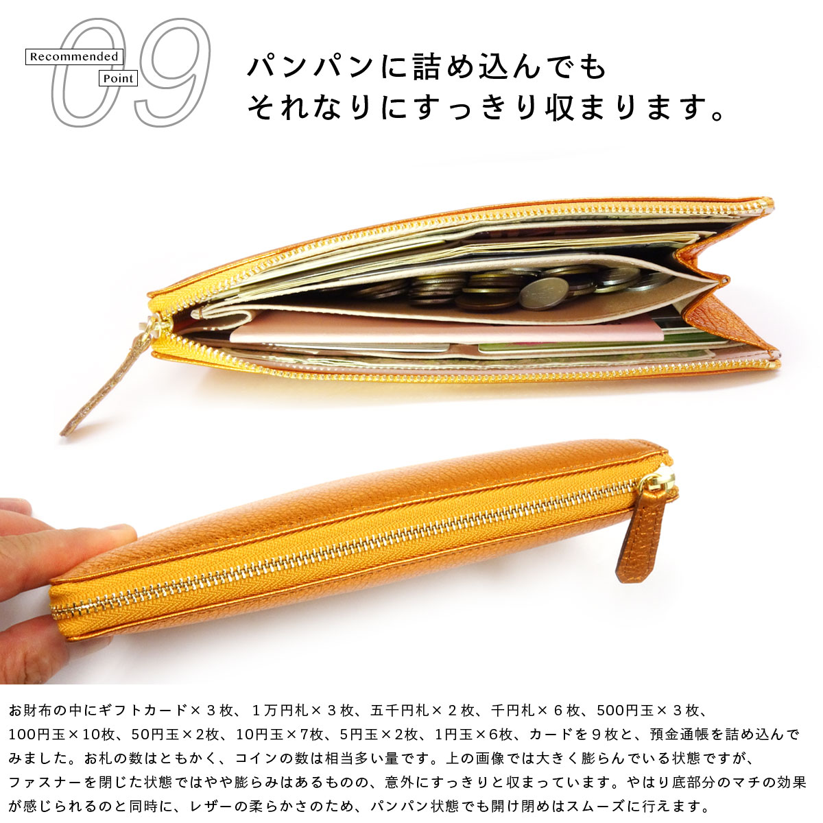 お財布の中にギフトカード×3枚、1万円札×3枚、五千円札×2枚、千円札×6枚、500円玉×3枚、100円玉×10枚、50円玉×2枚、10円玉×7枚、5円玉×2枚、1円玉×6枚、カードを9枚と、預金通帳を詰め込んでみました。お札の数はともかく、コインの数は相当多い量です。ファスナーを閉じる前は大きく膨らんでいる状態ですが、ファスナーを閉じた状態ではやや膨らみはあるものの、意外にすっきりと収まっています。やはり底部分のマチの効果が感じられるのと同時に、レザーの柔らかさのため、パンパン状態でも開け閉めはスムーズに行えます。