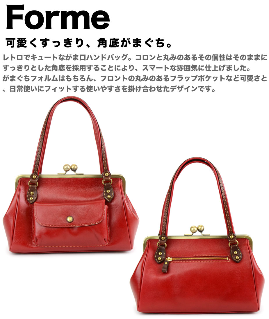 レトロでキュートながま口ハンドバッグ。コロンと丸みのあるその個性はそのままにすっきりとした角底を採用することにより、スマートな雰囲気に仕上げました。がまぐちフォルムはもちろん、フロントの丸みのあるフラップポケットなど可愛さと、日常使いにフィットする使いやすさを掛け合わせたデザインです。懐かしい雰囲気のがま口と光沢感のあるアンティークな雰囲気のレザーがぴったりマッチしています。底面には鋲で補強を施してありますので直接置いてもレザーにダメージを与えにくい仕様になっております。アンティークゴールドの口金を使用しておりますので落ち着いた高級感を感じて頂けます。古き良きデザインを斬新に蘇らせたハンドバッグです。