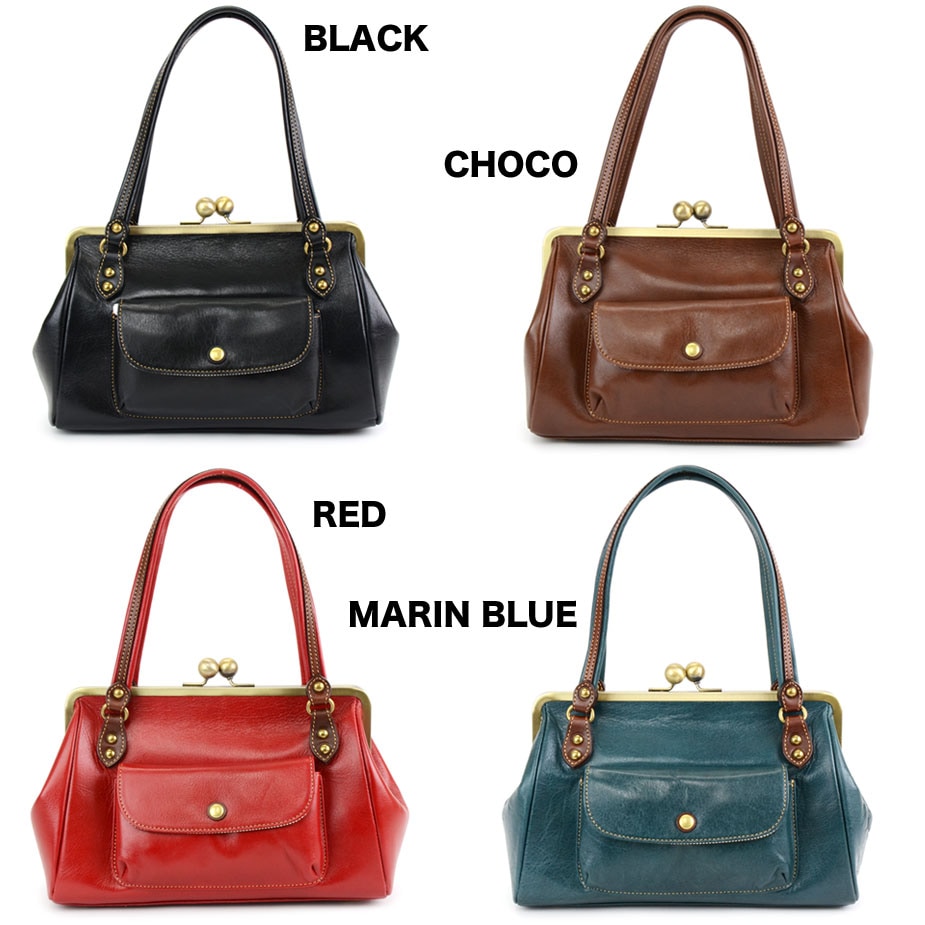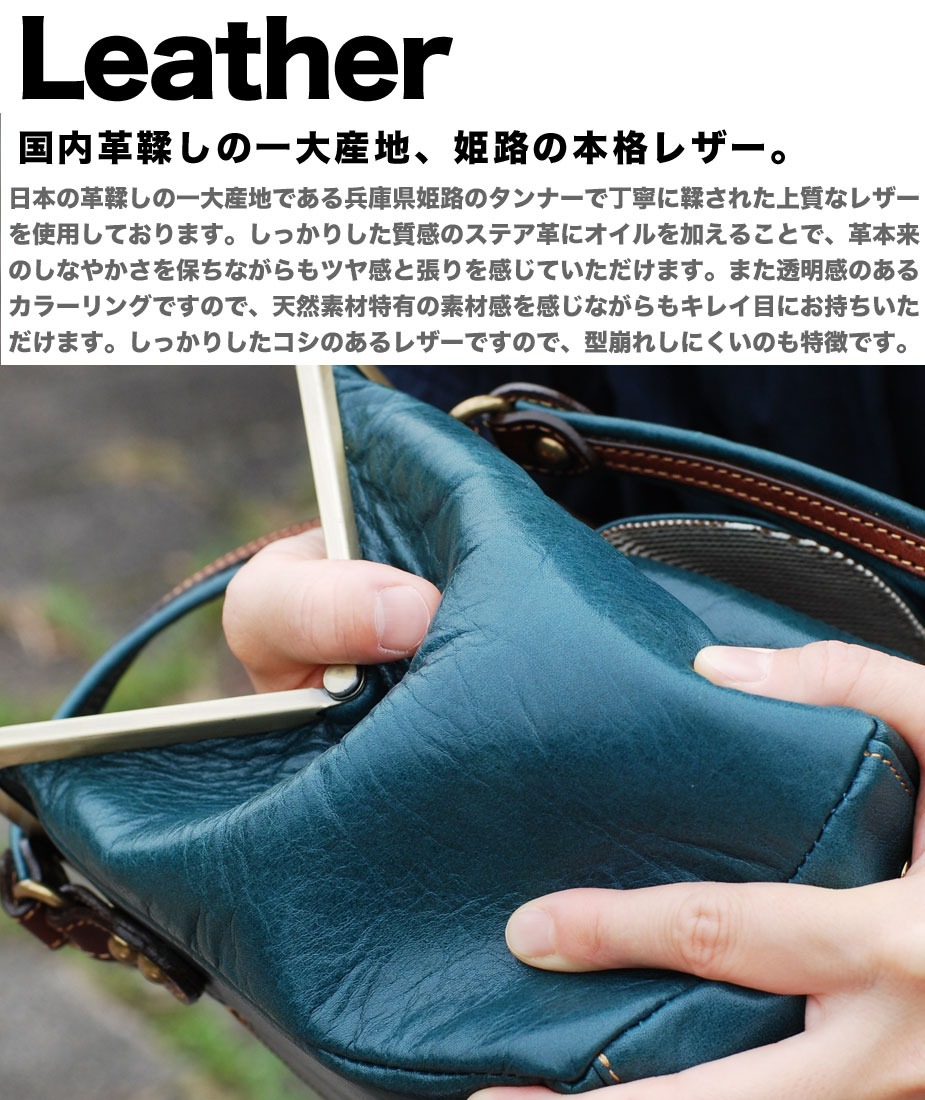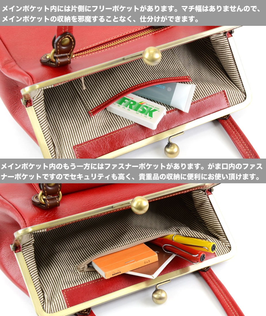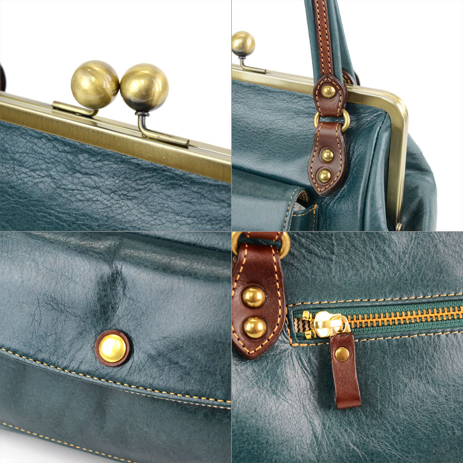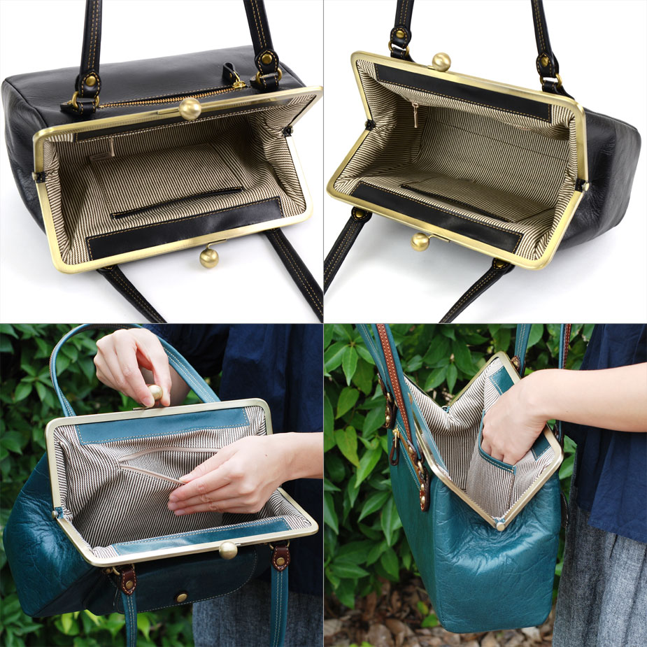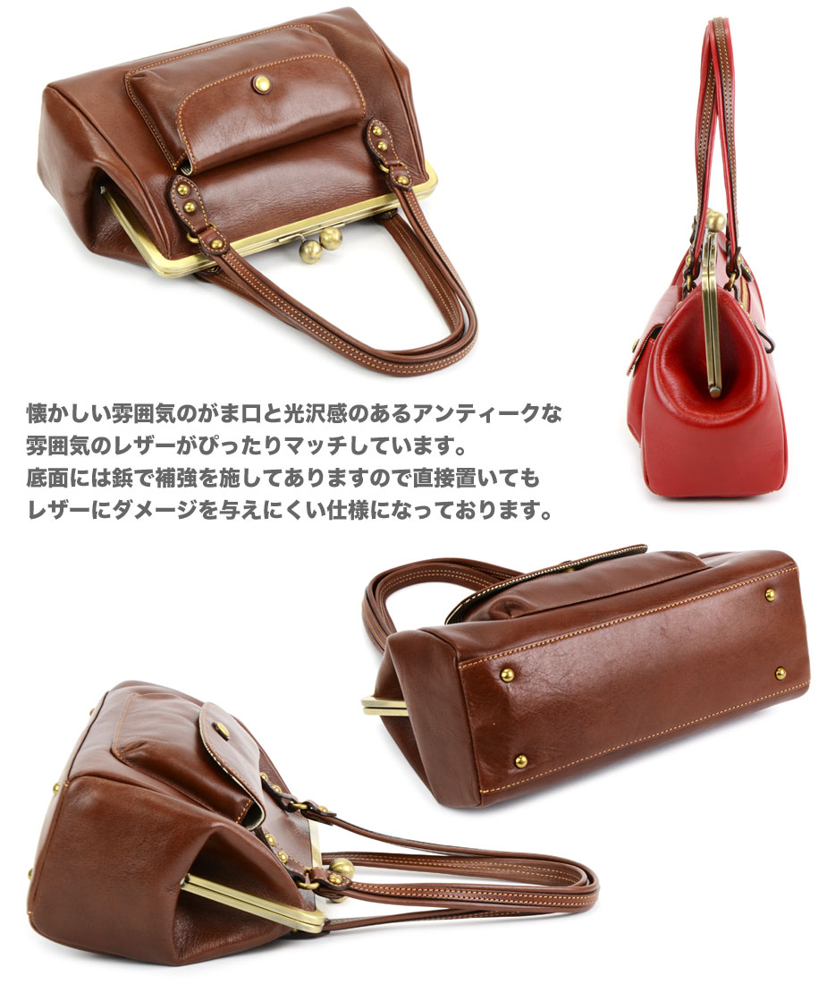 レトロでキュートな雰囲気で大人気のがま口が、存在感抜群のバッグになって登場。インパクトのあるデザインに目が行きがちですが、大きく開いて出し入れしやすい実用性も魅力です。アンティークゴールドの口金を使用しておりますので、レザーとの相性もバッチリで、高級感を持ってお使いいただけます。