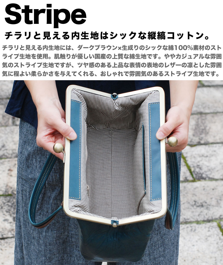チラリと見える内生地には、ダークブラウン×生成りのシックな綿100%素材のストライプ生地を使用。肌触りが優しい国産の上質な綿生地です。ややカジュアルな雰囲気のストライプ生地ですが、ツヤ感のある上品な表情の表地のレザーの凛とした雰囲気に程よい柔らかさを与えてくれる、おしゃれで雰囲気のあるストライプ生地です。