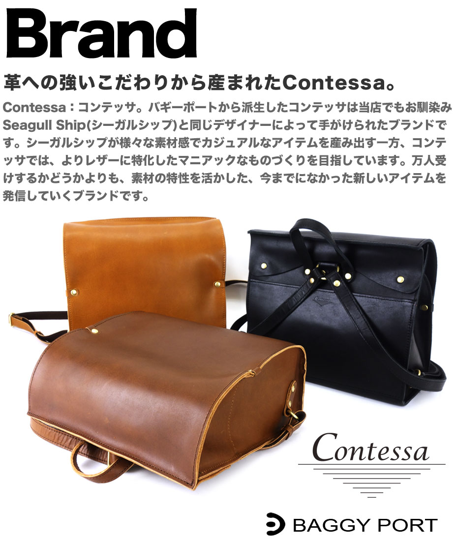Contessa:コンテッサ。バギーポートから派生したコンテッサは当店でもお馴染みSeagull Ship(シーガルシップ)と同じデザイナーによって手がけられたブランドです。シーガルシップが様々な素材感でカジュアルなアイテムを産み出す一方、コンテッサでは、よりレザーに特化したマニアックなものづくりを目指しています。万人受けするかどうかよりも、素材の特性を活かした、今までになかった新しいアイテムを発信していくブランドです。