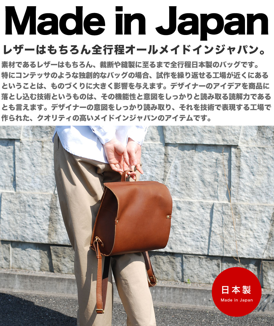素材であるレザーはもちろん、裁断や縫製に至るまで全行程日本製のバッグです。特にコンテッサのような独創的なバッグの場合、試作を繰り返せる工場が近くにあるということは、ものづくりに大きく影響を与えます。デザイナーのアイデアを商品に落とし込む技術というものは、その機能性と意図をしっかりと読み取る読解力であるとも言えます。デザイナーの意図をしっかり読み取り、それを技術で表現する工場で作られた、クオリティの高いメイドインジャパンのアイテムです。