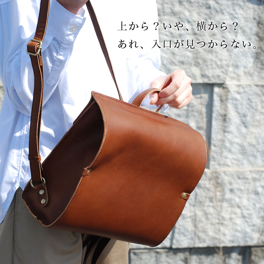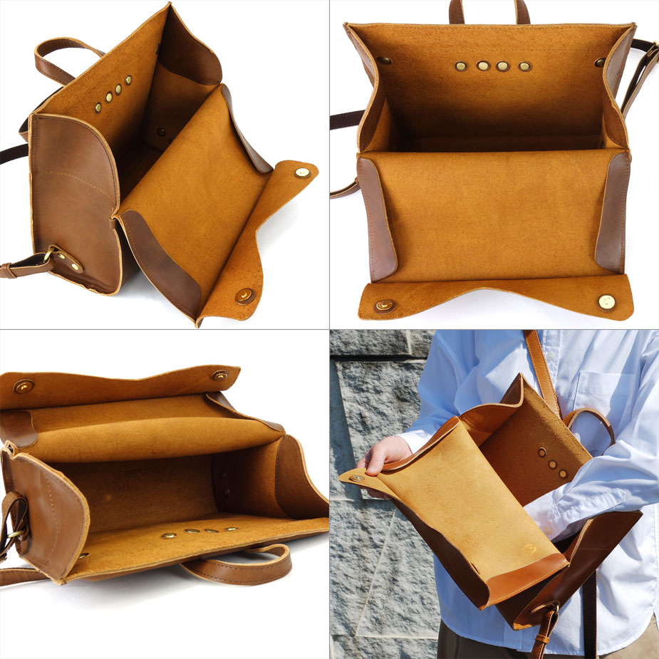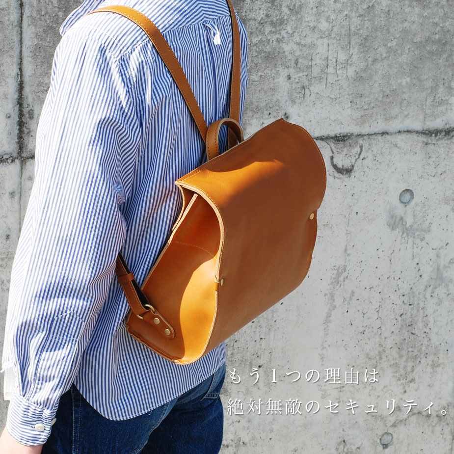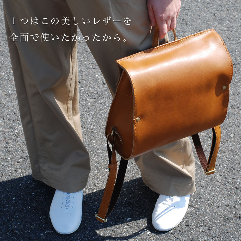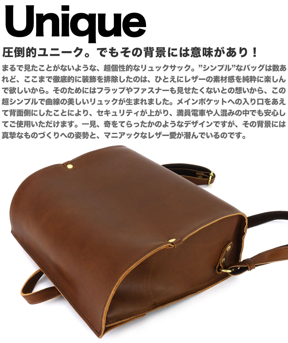 まるで見たことがないような、超個性的なリュックサック。"シンプル"なバッグは数あれど、ここまで徹底的に装飾を排除したのは、ひとえにレザーの素材感を純粋に楽しんで欲しいから。そのためにはフラップやファスナーも見せたくないとの想いから、この超シンプルで曲線の美しいリュックが生まれました。メインポケットへの入り口をあえて背面側にしたことにより、セキュリティが上がり、満員電車や人混みの中でも安心してご使用いただけます。一見、奇をてらったかのようなデザインですが、その背景には真摯なものづくりへの姿勢と、マニアックなレザー愛が潜んでいるのです。
