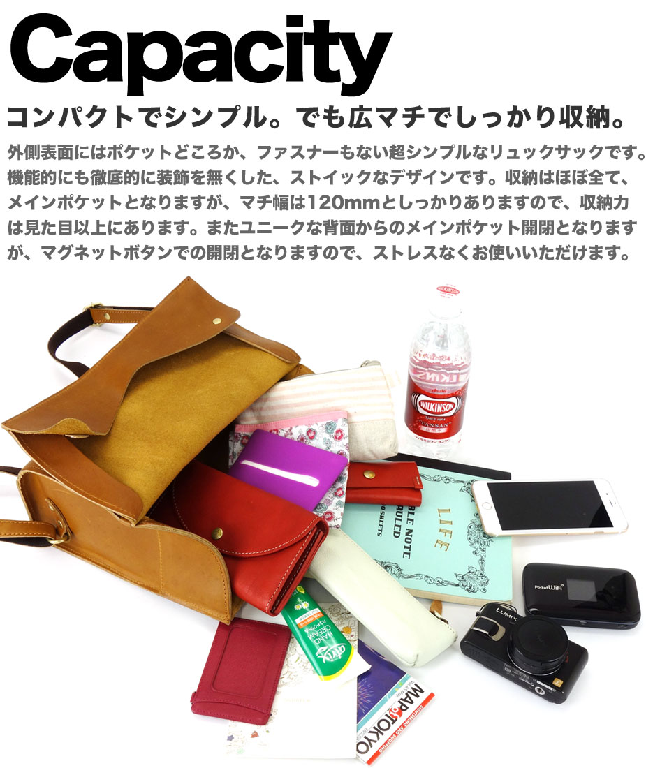横幅約280mm×高さ約230mmマチ幅約120mmの女性の背中にもぴったりなややコンパクトなサイズ感のアクティブなリュックサックです。外側表面にはポケットどころか、ファスナーもない超シンプルなリュックサックです。機能的にも徹底的に装飾を無くした、ストイックなデザインです。収納はほぼ全て、メインポケットとなりますが、マチ幅は120mmとしっかりありますので、収納力は見た目以上にあります。またユニークな背面からのメインポケット開閉となりますが、マグネットボタンでの開閉となりますので、ストレスなくお使いいただけます。背面にはメインポケット以外の唯一のポケットであるフリーポケットがあります。開閉にファスナーやボタンはありませんが、背面ですのでセキュリティは安心です。500mlのペットボトルを縦に入れても余裕のあるメインポケット。B5ノートもぴったり入りますので、汎用性高く使えます。内ポケットもなく、自由度高く使えます。