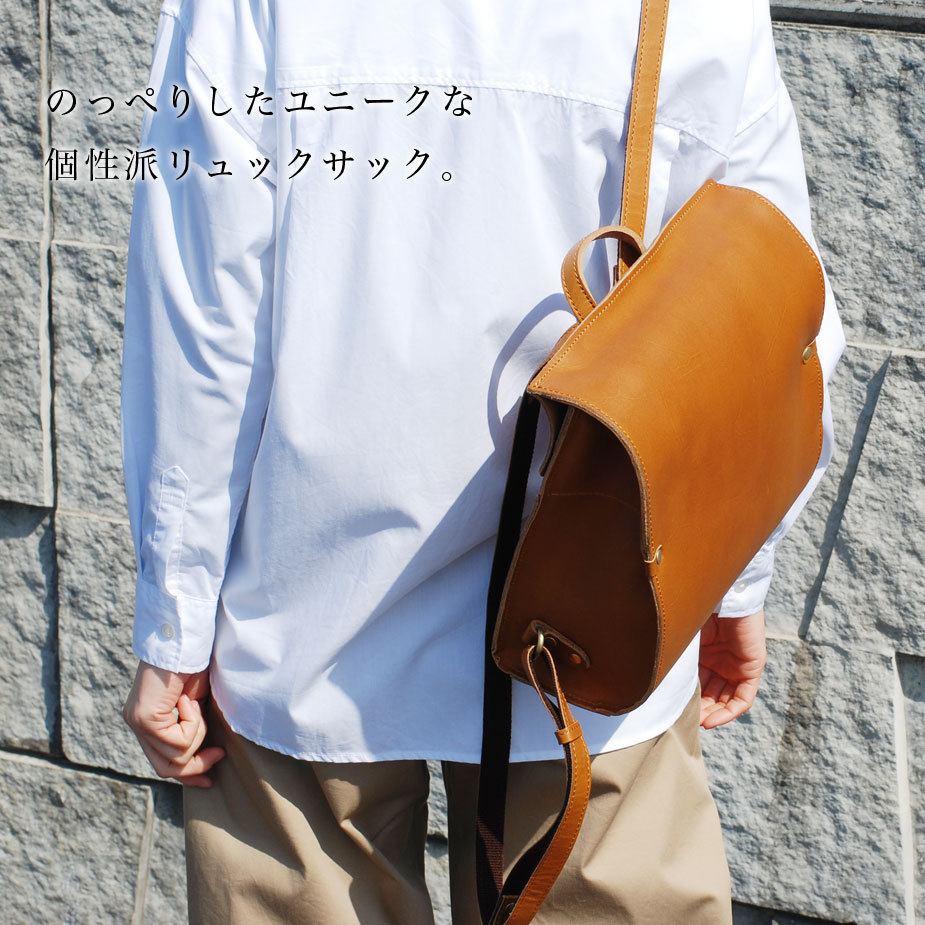 スクエア感と曲線美のコンビネーションが斬新なリュックサックです。あらゆる無駄を省いた潔いデザイン、メインポケットへの入り口さえフロント面には見せたくなかったデザインが、逆に個性的なフォルムに仕上がっています。本当に高品質なレザーを使用しておりますので、シンプルなデザインでも風格が漂っており、高級感を感じていただけます。ユニークなデザインですが、シンプルですので、意外にコーディネートを選ばず、毎日お使いいただけます。背面部分までオールレザーの贅沢仕様のリュックサックです。ショルダーベルトももちろん同じレザーで統一されております。ベルトの裏側にはクッションとしてのコットンが張られていますので、快適にお使いいただけます。レザーの結合部分にはカシメが多く使われており、独特なフォルムと相性バッチリです。