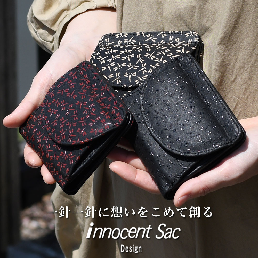 PR:innocent Sac イノセント・サック 丸越 甲州印伝 印伝 いんでん 印傳 鹿革 和柄 漆付け 漆 柄付け 軽い 軽量 丈夫 トンボ柄 とんぼ 蜻蛉 勝虫 勝ち虫 勝つ虫 吉祥柄 上原勇七 伝統 伝統工芸 二つ折り財布 コンパクトウォレット compact wallet ハーフウォレット half wallet ショート short Wallet mini ミニ財布 二つ折り札入れ 束入れ 札入れ ボックス型小銭入れ box ボックス型 カード入れ 極小財布 スモールウォレット おさいふやさん おさいふ 財布 さいふ サイフ Saifu Saihu 本革財布 Leather Wallet レザーウォレット 牛革 本革 皮革 国産牛革 ハンドメイド Hand Made ハンドクラフト Craft 日本製 メイドインジャパン Made in JAPAN ジャパンメイド 国産 国内生産 メンズ レディース 金運 風水 天赦日 一粒万倍日 寅の日 吉日 春財布 張る財布 秋財布 実り財布 新調 新年 正月 バレンタイン ホワイトデー 新生活 母の日 敬老の日 クリスマス プレゼント Present ギフト Gift 贈り物