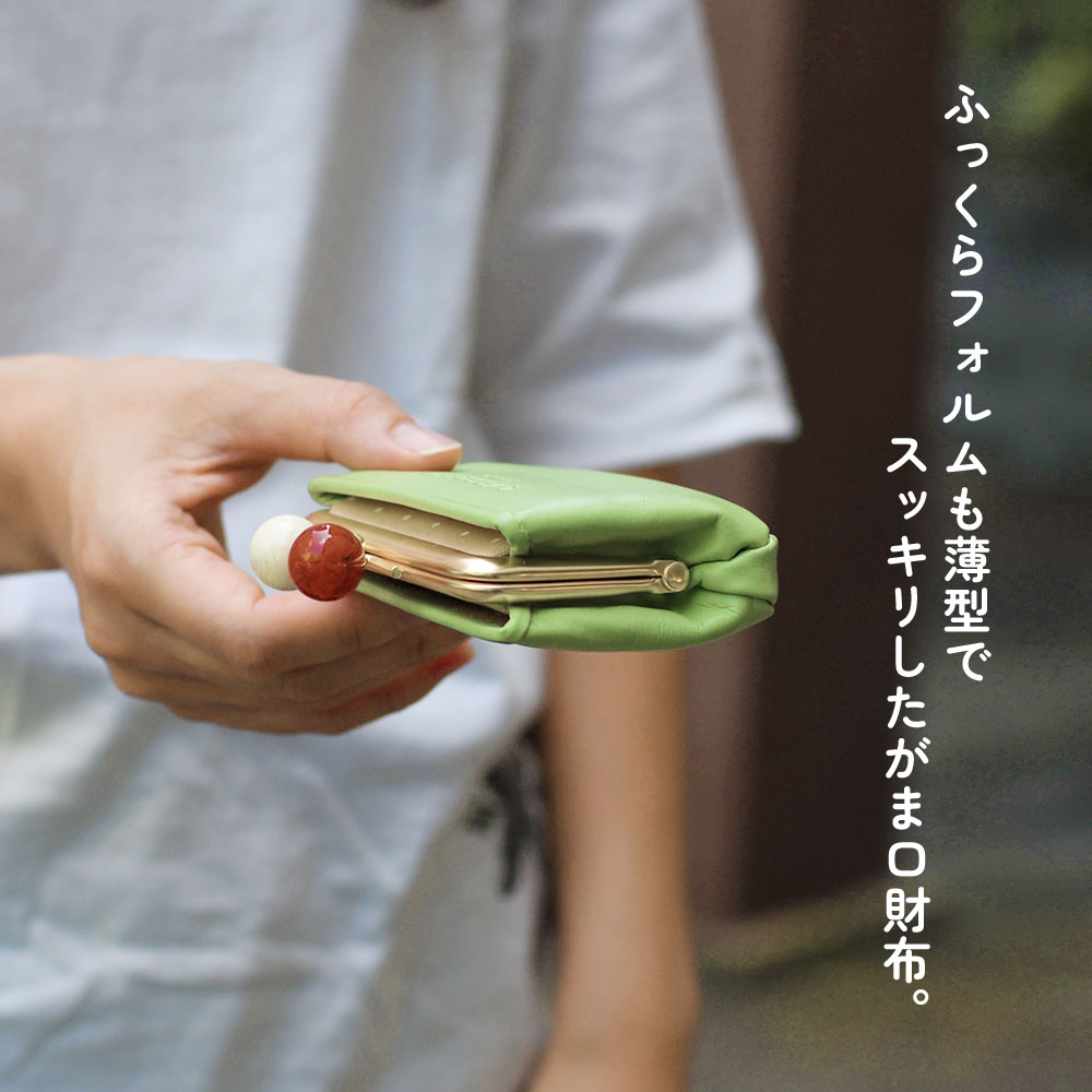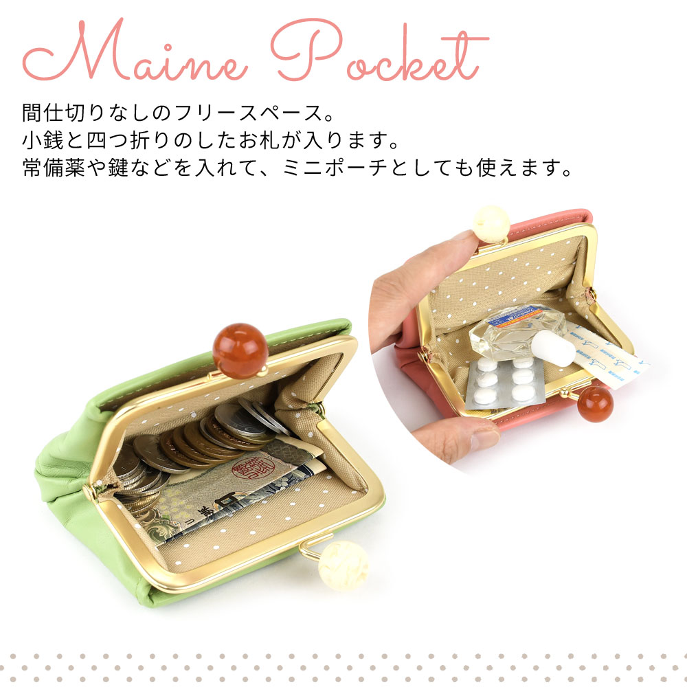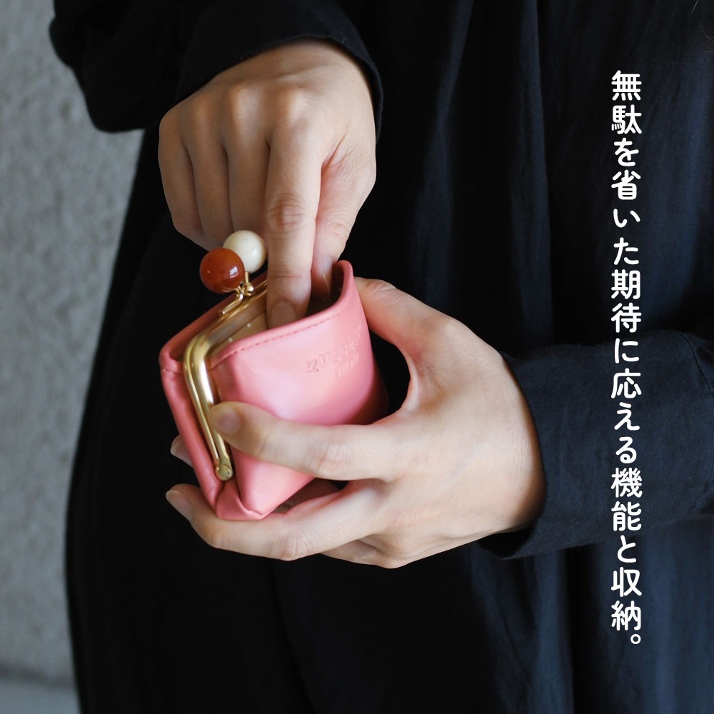 [アイテムについて] ツヤのあるマーブル調のアクリル玉の口金を使用し、見た目のアクセントになっています。通常の口金よりも持ち手が大きいため、開閉しやすくなっています。また、内装にはベージュの生地に白いドット柄のファブリックを使用。シンプルでエレガントなルックスながらも、内装はキュートで遊び心を感じさせてくれます。お財布を開いたときのインパクトだけでなく、お金やカードの視認性が高くなるというメリットもあります。 ふっくらとした丸みを持ちながらも、薄型でスッキリとした印象のミニ財布。かま口を開けなくてもアクセスできる前後のカードポケットには複数枚のカードが収納できます。メインポケットには小銭や折ったお札を収納することが可能です。ミニウォレットとしてはもちろんですが、鍵や常備薬を持ち歩くための小物入れなど、自由な使い方ができるマルチポーチとしても活躍します。