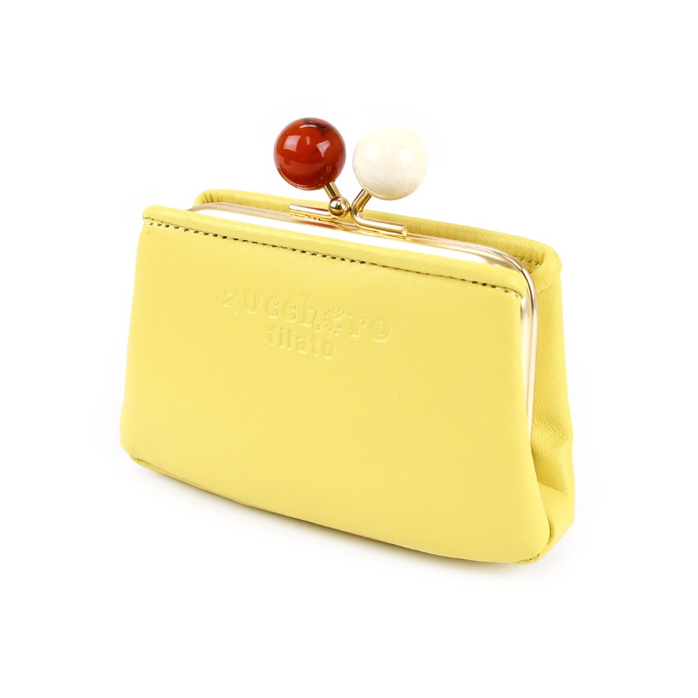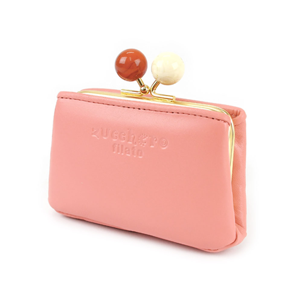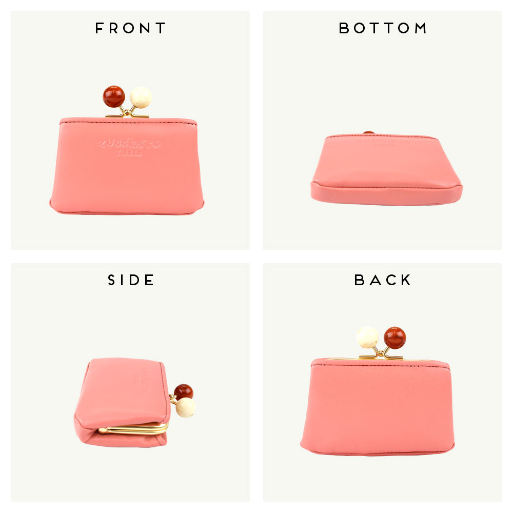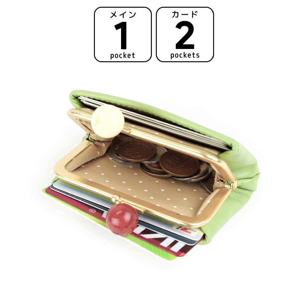 [アイテムについて] ツヤのあるマーブル調のアクリル玉の口金を使用し、見た目のアクセントになっています。通常の口金よりも持ち手が大きいため、開閉しやすくなっています。また、内装にはベージュの生地に白いドット柄のファブリックを使用。シンプルでエレガントなルックスながらも、内装はキュートで遊び心を感じさせてくれます。お財布を開いたときのインパクトだけでなく、お金やカードの視認性が高くなるというメリットもあります。 ふっくらとした丸みを持ちながらも、薄型でスッキリとした印象のミニ財布。かま口を開けなくてもアクセスできる前後のカードポケットには複数枚のカードが収納できます。メインポケットには小銭や折ったお札を収納することが可能です。ミニウォレットとしてはもちろんですが、鍵や常備薬を持ち歩くための小物入れなど、自由な使い方ができるマルチポーチとしても活躍します。