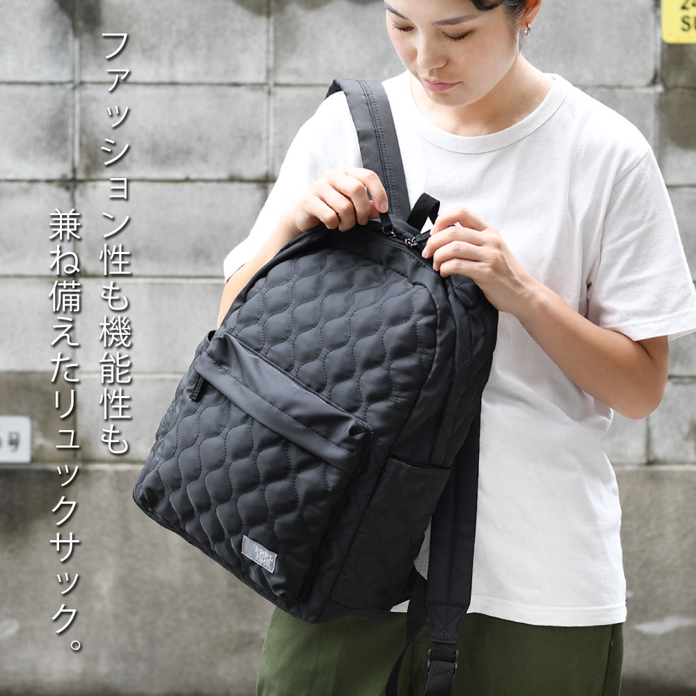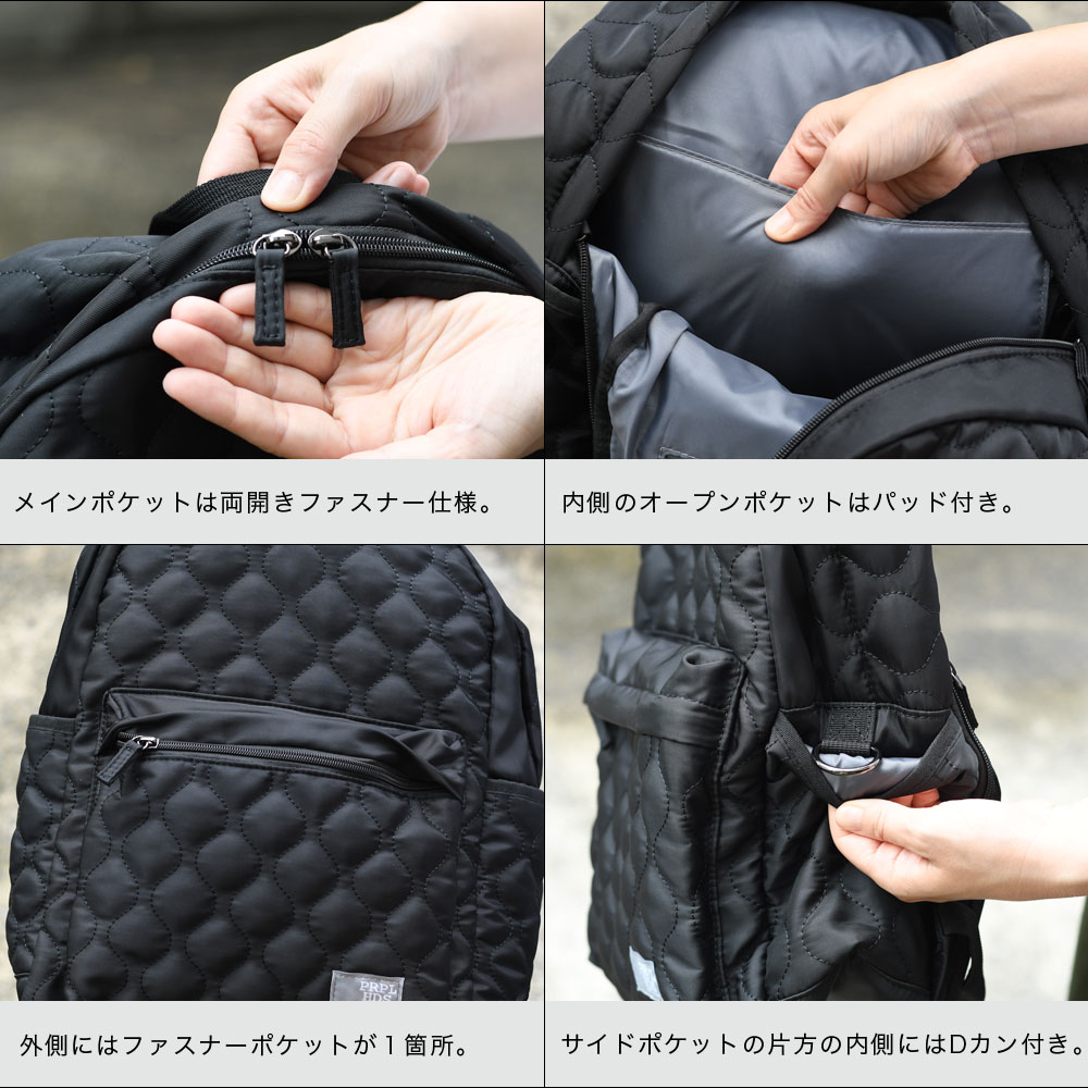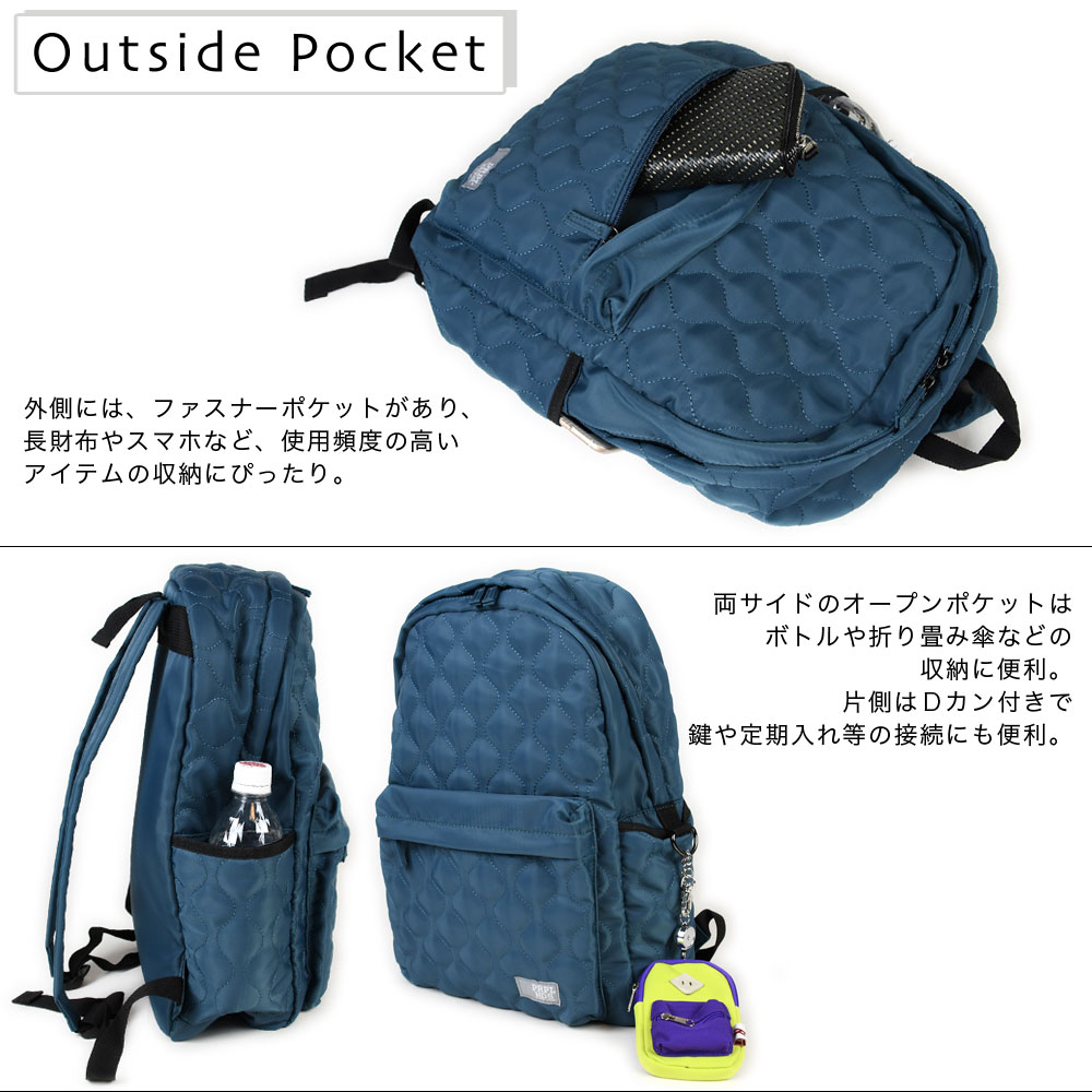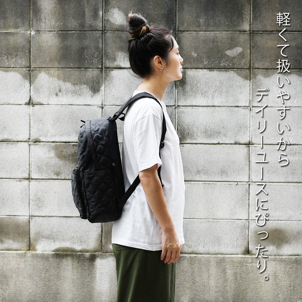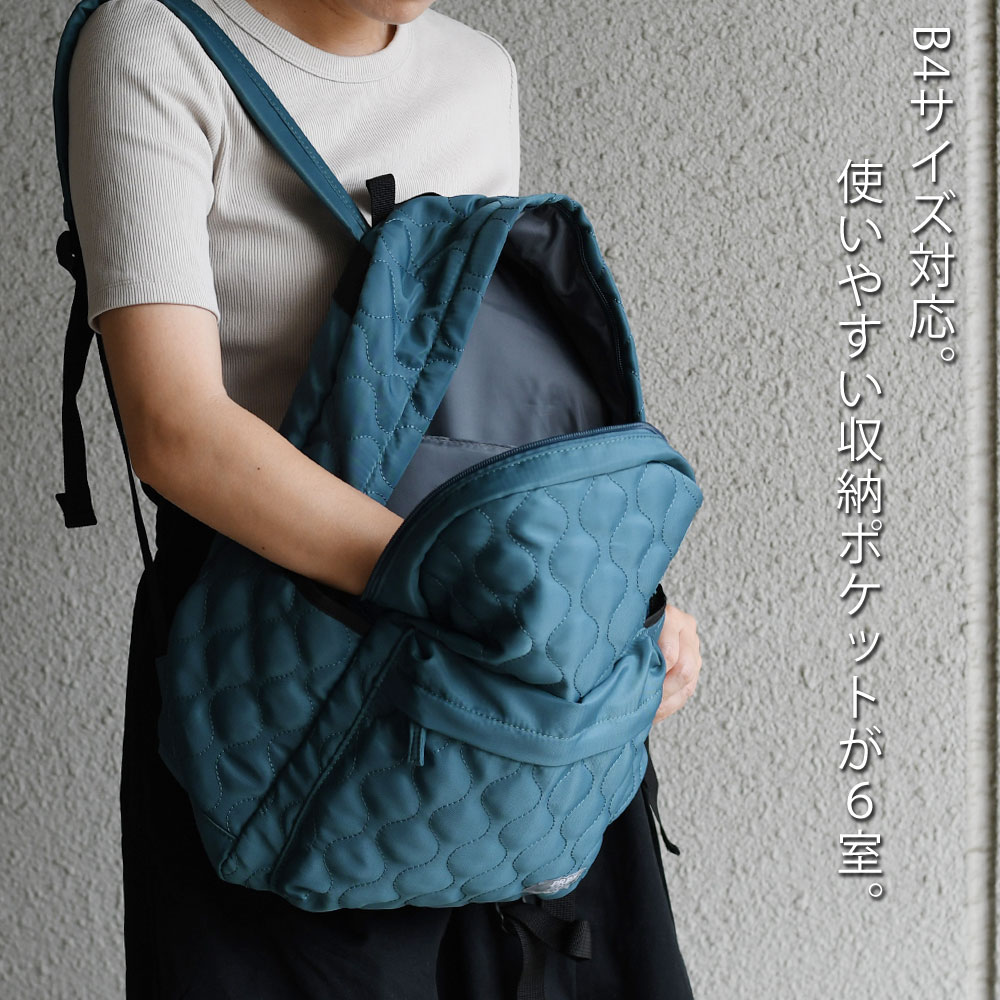 アイテムについて 軽量で扱いやすいポリエステル生地のキルティングリュックです。メインポケットは約13センチのマチがありB4サイズ対応可能になっています。メインポケット内にはノートPCやタブレットなども収納できるパッド付きオープンポケットと浅めのファスナーポケットがあります。外側には、ファスナーポケットがあり、長財布やスマホなど、使用頻度の高いアイテムの収納にぴったり。両サイドにはオープンポケットがあり、ボトルや折り畳み傘などの収納に便利。また片側は内側にDカンが付いていて、キーやパスケースなどと接続すれば取り出しもスムーズで紛失防止にもなります。背面にはメインポケットへの直通ファスナーがついていて、アイテムのサイズによりますが、中身を直接取り出せます。また、リュックのショルダーも長さ調節が可能。ファッション性も高く、十分な機能性も兼ね備えたデイパックは幅広いシーンでお使いいただけます。