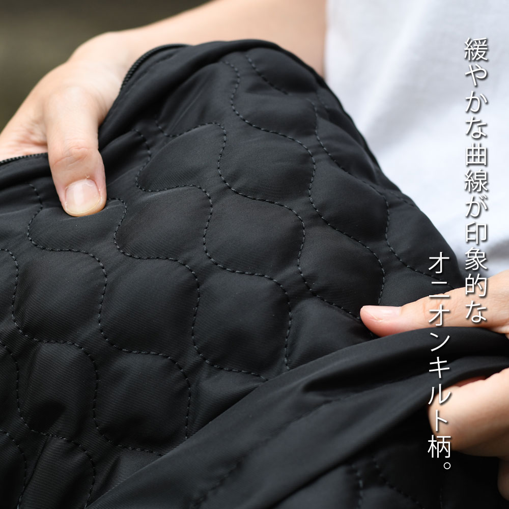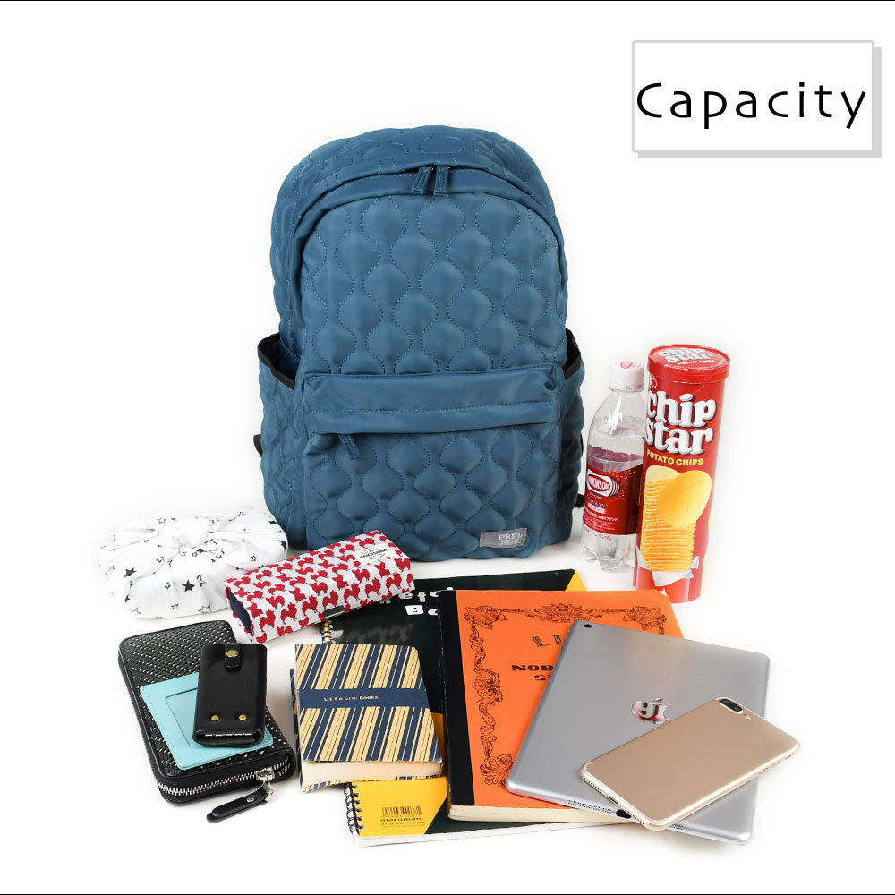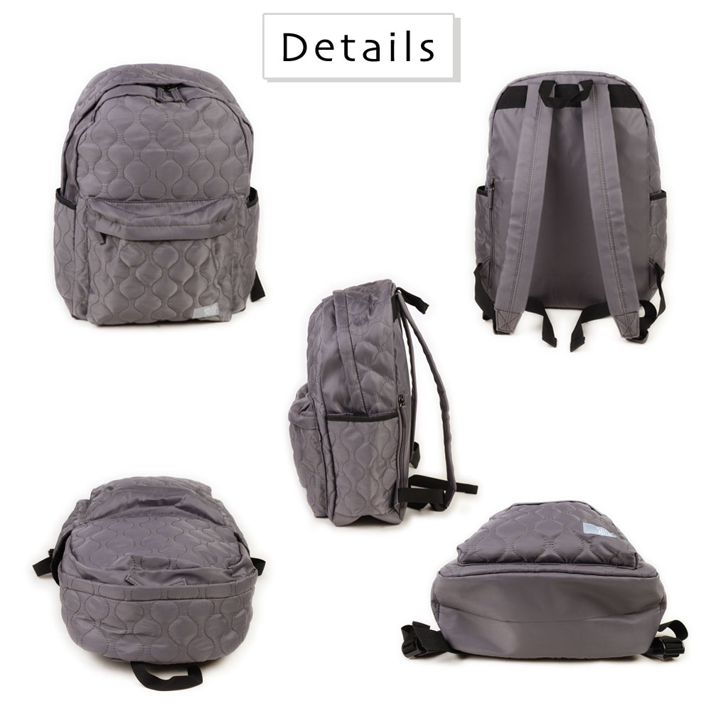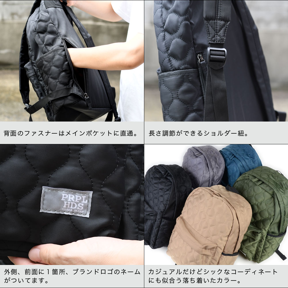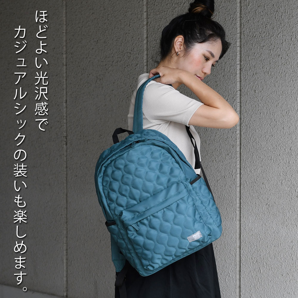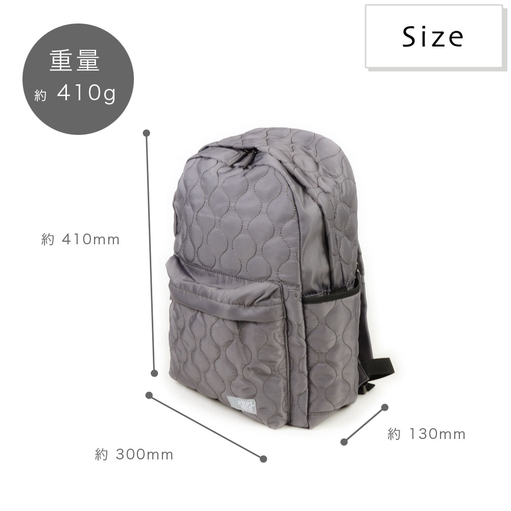アイテムについて 軽量で扱いやすいポリエステル生地のキルティングリュックです。メインポケットは約13センチのマチがありB4サイズ対応可能になっています。メインポケット内にはノートPCやタブレットなども収納できるパッド付きオープンポケットと浅めのファスナーポケットがあります。外側には、ファスナーポケットがあり、長財布やスマホなど、使用頻度の高いアイテムの収納にぴったり。両サイドにはオープンポケットがあり、ボトルや折り畳み傘などの収納に便利。また片側は内側にDカンが付いていて、キーやパスケースなどと接続すれば取り出しもスムーズで紛失防止にもなります。背面にはメインポケットへの直通ファスナーがついていて、アイテムのサイズによりますが、中身を直接取り出せます。また、リュックのショルダーも長さ調節が可能。ファッション性も高く、十分な機能性も兼ね備えたデイパックは幅広いシーンでお使いいただけます。