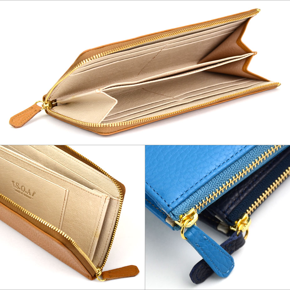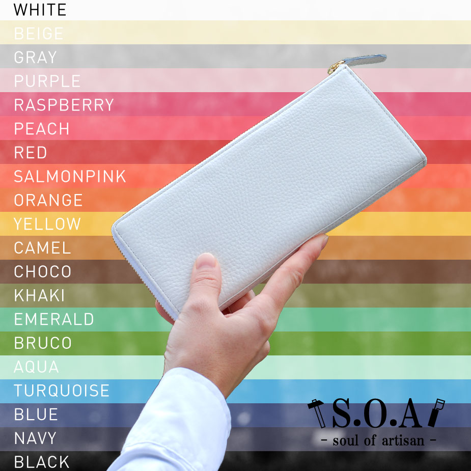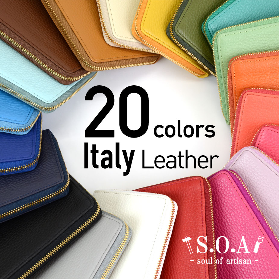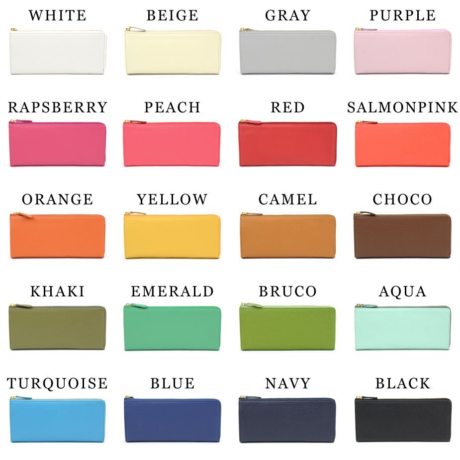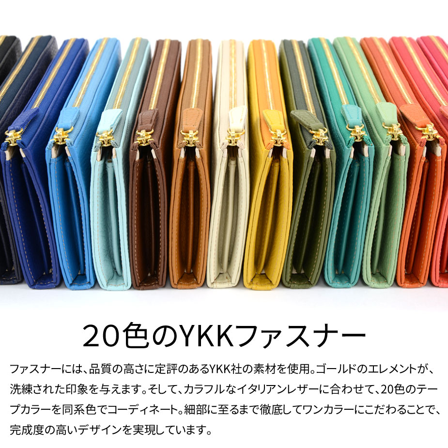 ファスナーには、品質の高さに定評のあるYKK社の素材を使用。ゴールドのエレメントが、洗練された印象を与えます。そして、カラフルなイタリアンレザーに合わせて、20色のテープカラーを同系色でコーディネート。細部に至るまで徹底してワンカラーにこだわることで、完成度の高いデザインを実現しています。