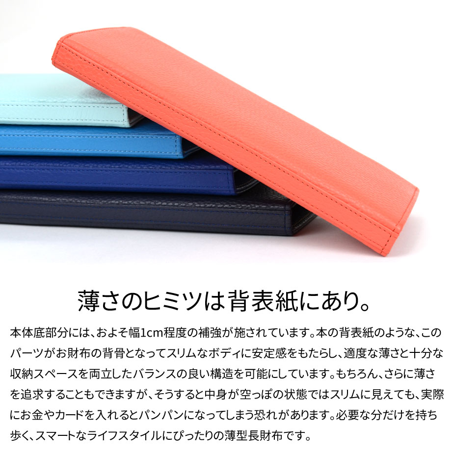 本体底部分には、およそ幅1cm程度の補強が施されています。本の背表紙のような、このパーツがお財布の背骨となってスリムなボディに安定感をもたらし、適度な薄さと十分な収納スペースを両立したバランスの良い構造を可能にしています。もちろん、さらに薄さを追求することもできますが、そうすると中身が空っぽの状態ではスリムに見えても、実際にお金やカードを入れるとパンパンになってしまう恐れがあります。必要な分だけを持ち歩く、スマートなライフスタイルにぴったりの薄型長財布です。