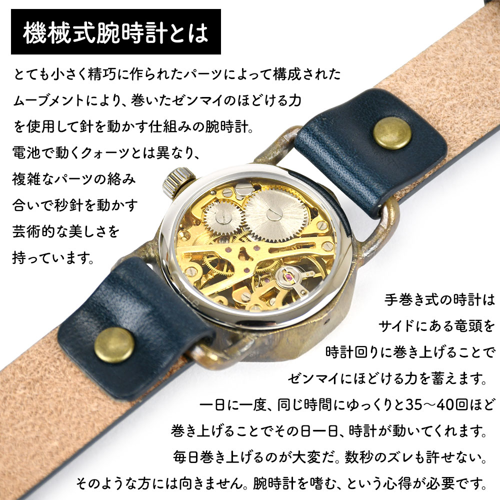 アイテムについて 機械式腕時計とはとても小さく精巧に作られたパーツによって構成されたムーブメントにより、巻いたゼンマイのほどける力を使用して針を動かす仕組みの腕時計です。電池で動くクォーツとは異なり、複雑なパーツの絡み合いで秒針を動かす芸術的な美しさを持っています。手巻き式の時計はサイドにある竜頭を時計回りに巻き上げることでゼンマイにほどける力を蓄えます。一日に一度、同じ時間にゆっくりと35~40回ほど巻き上げることでその日一日、時計が動いてくれます。毎日巻き上げるのが大変だ。数秒のズレも許せない。そのような方には向きません。腕時計を嗜む、という心得が必要です。