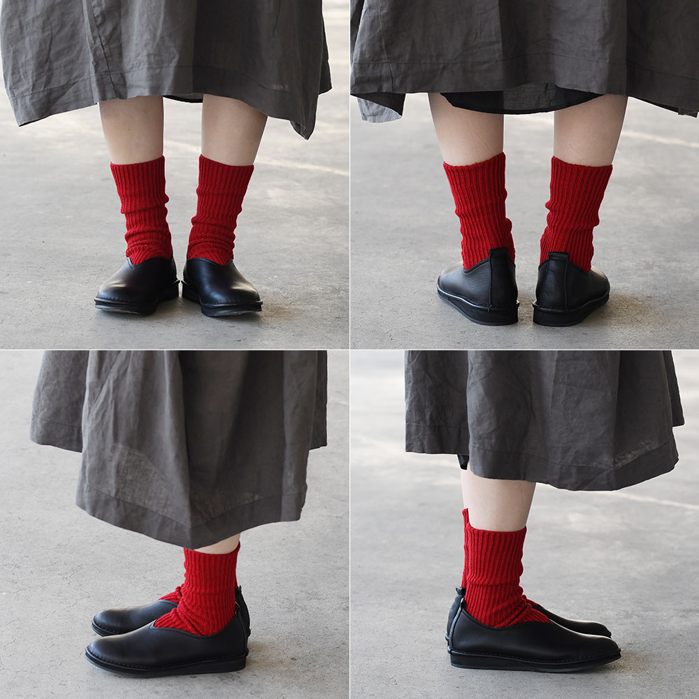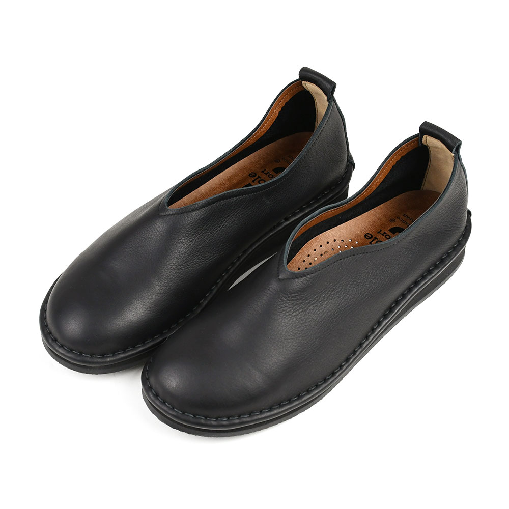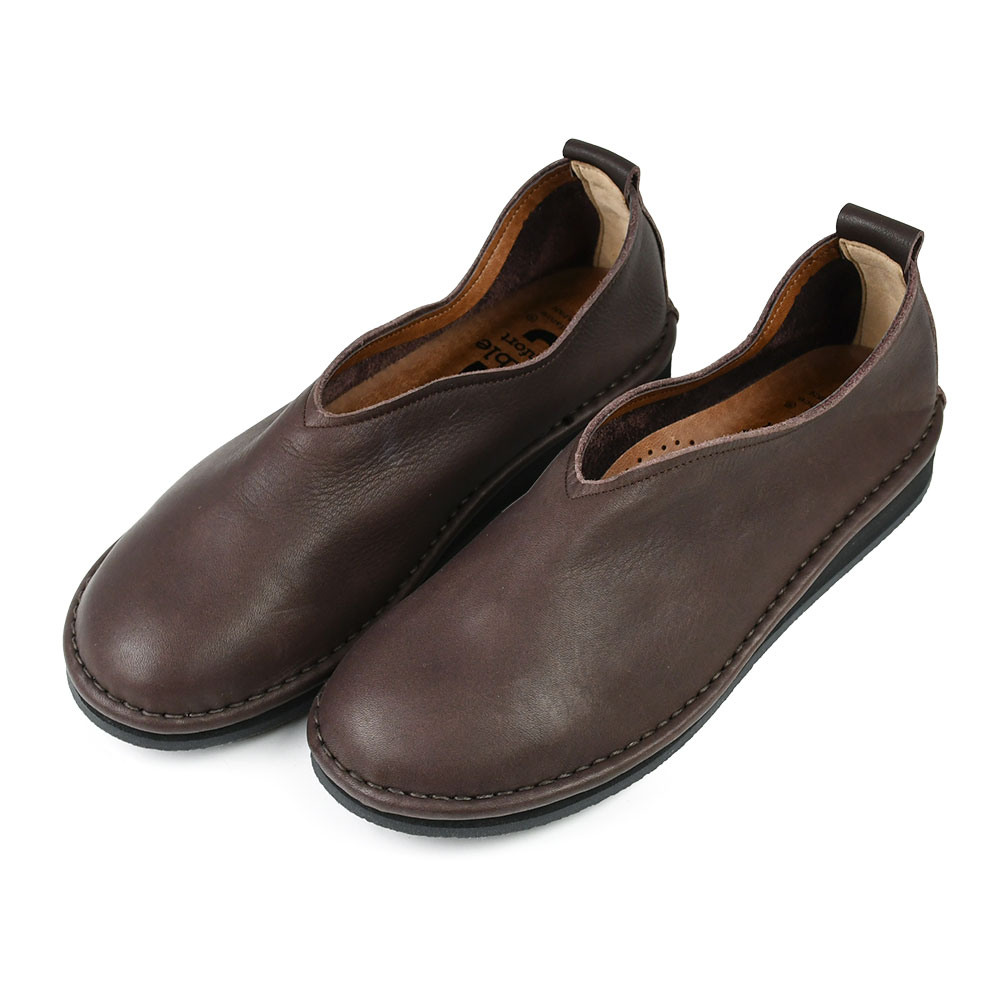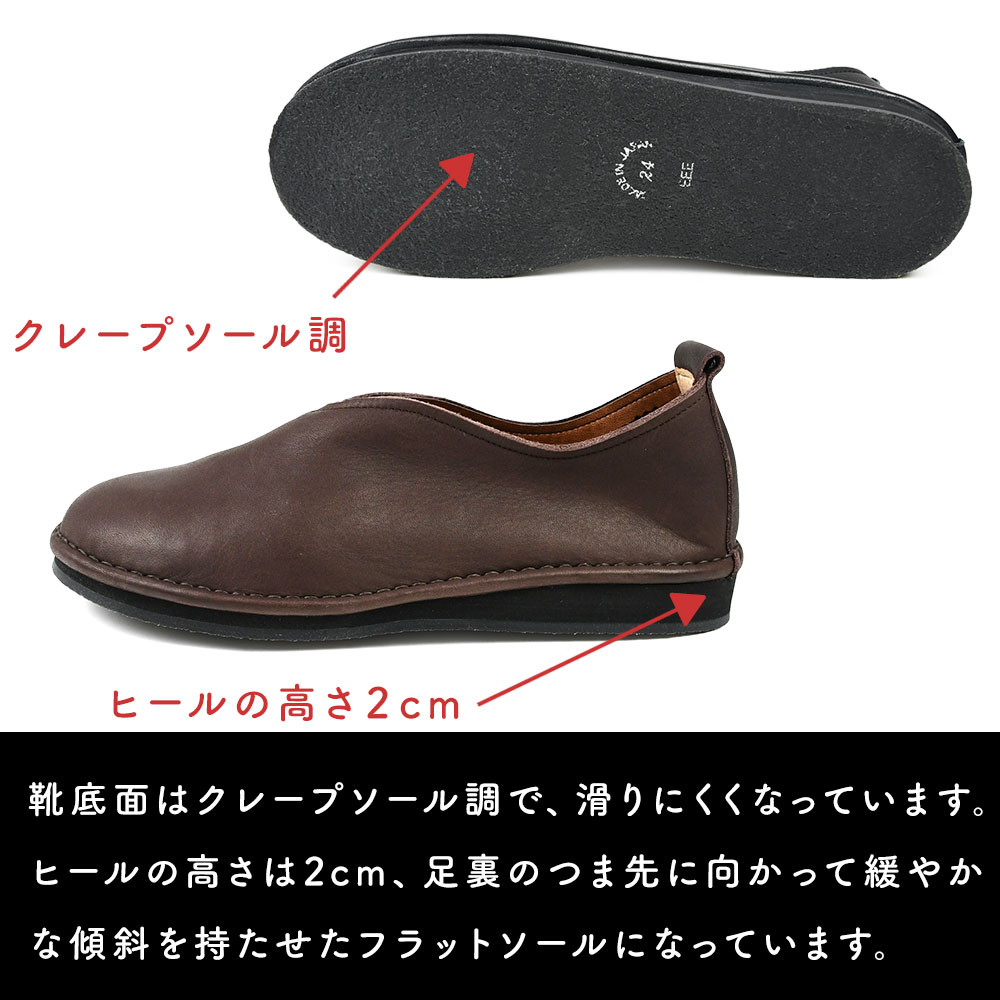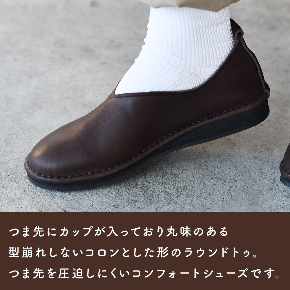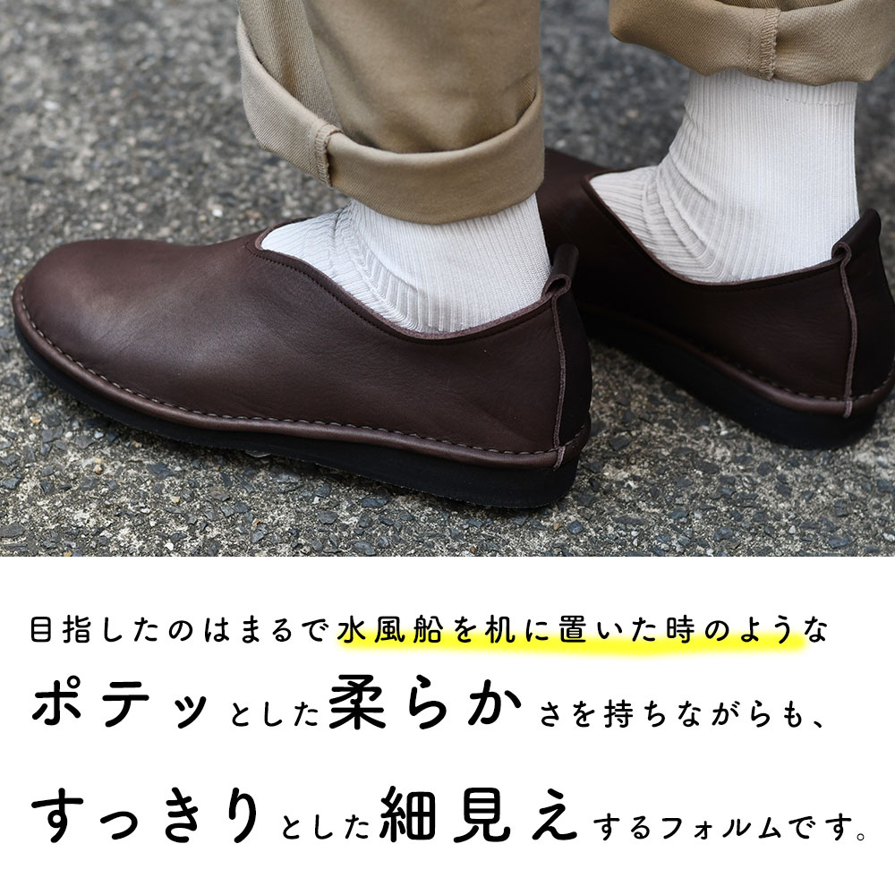[アイテムについて] トップラインが浅いV型のスリッポンシューズになります。まるで水風船を机に置いた時のようなポテッとした柔らかさを持ちながらも、すっきりとした細見えするフォルムを目指しました。 一枚の革を使いパーツの縫い合わせの少ないシームレスなデザインです。大部分に裏地を使用しないことにより、軽さと足馴染みの良さを実現しました。 ナチュラルな雰囲気のレザーを最大限に活かすために、アウトステッチを採用していますが、見た目が重たくなりすぎないようにデザインしました。 履き口はカットオフでシンプルなスタイルで足入れも良く、内縁は裏材を縫い付け、伸び止めとアクセントにもなっています。 つま先にはカップが入っており、丸味のあるコロンとした形のラウンドトゥになります。つま先を圧迫しにくいコンフォートシューズです。 インソールには低反発クッションを内蔵、ミッドソールにスポンジ素材を挟み衝撃を和らげ、軽量に仕上げました。底面はクレープソール調で滑りにくい仕様になっております。 ヒールの高さは2cm、足裏のつま先に向かって緩やかな傾斜を持たせたフラットソールになっています。