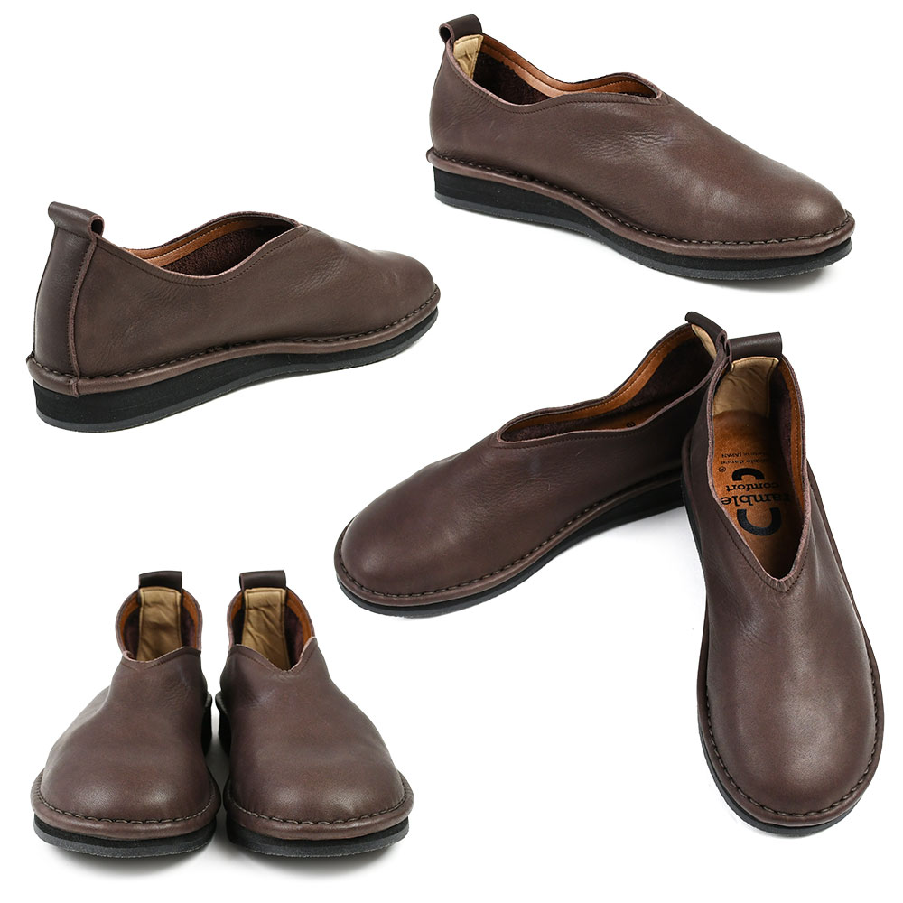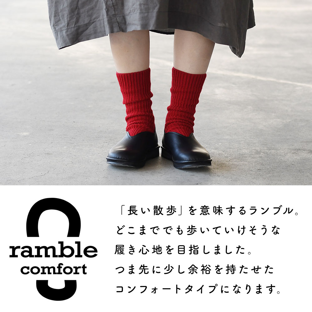 [rambleについて]ramble(ランブル)】は「長い散歩」を意味する英語です。 rambleは2010年に普段履きレザースニーカー的なバレーシューズをイメージした靴からスタートしました。 ブランド名に込めた想いのように、レザーシューズでありながらも軽さと足馴染みの良さ、歩きやすいソールを採用することにより、どこまででも歩いていけそうなはき心地を目指しました。 また、靴づくりの街として有名な兵庫県神戸エリアの靴工房で製作されたメイドインジャパンにもこだわっています。 [ramble comfort(ランブルコンフォート)]では、つま先に少し余裕を持たせてより楽に捌けるようにデザインしました。 オイルレザーやソフトシュリンクレザーを使用し、ナチュラルな雰囲気を演出しました。