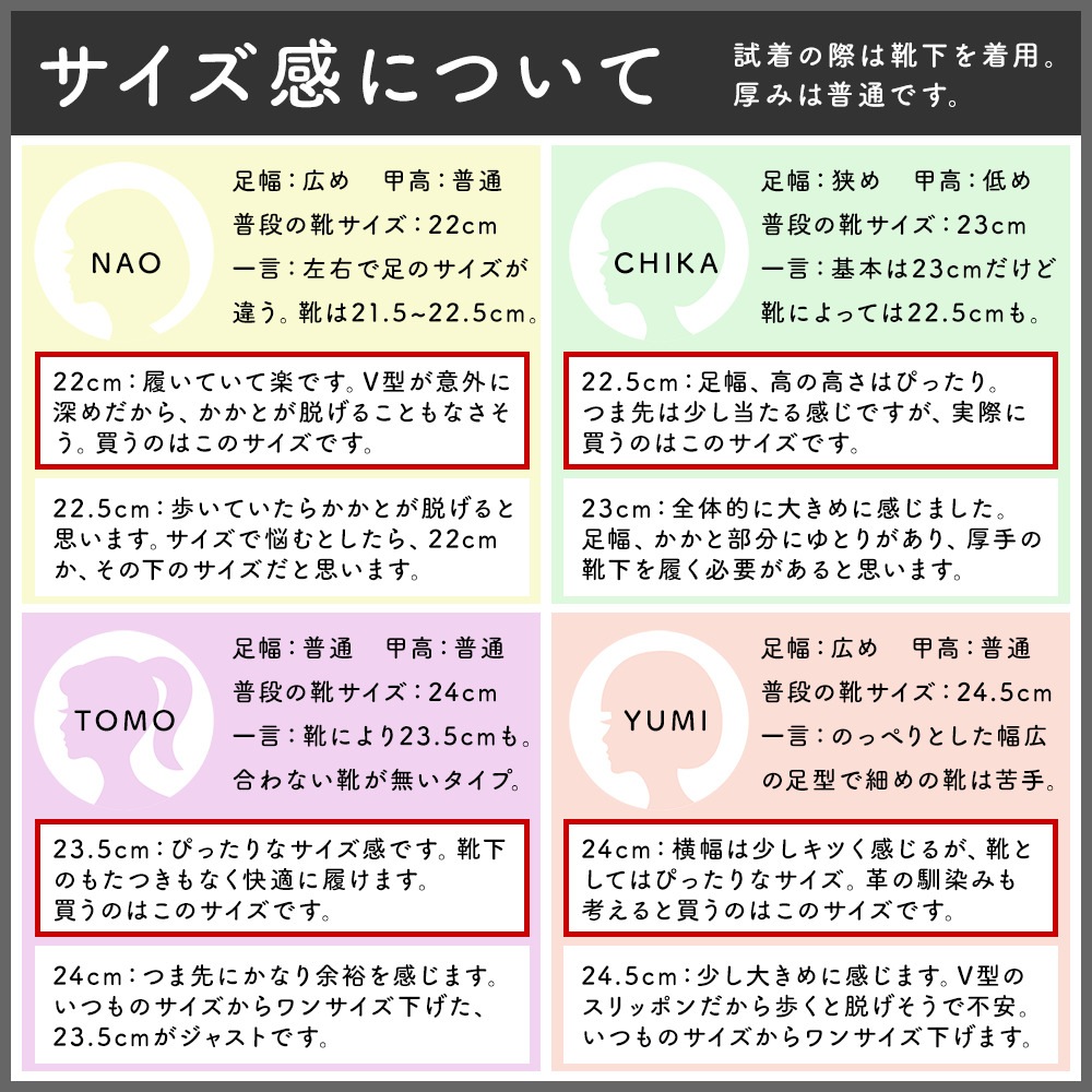 [サイズ感について] コンフォートタイプで3Eの幅広デザインのため、ワンサイズ落とした方がしっくりくるかと思われます。普段の靴と同じサイズをご注文の場合は、厚手のソックスなどで調整いただく必要があるかと思われます。