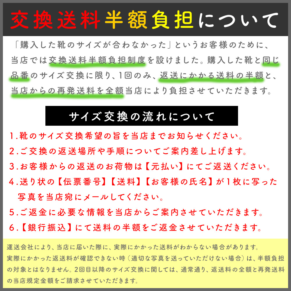 [交換送料半額負担について] 「購入した靴のサイズが合わなかった」というお客様のために、当店では交換送料半額負担制度を設けました。 購入した靴と同じ品番のサイズ交換に限り、1回のみ、返送にかかる送料の半額と、当店からの再発送料を全額当店により負担させていただきます。 1.靴のサイズ交換を希望の旨を当店にお知らせください。 2.ご交換の流れを追ってご案内差し上げます。 3.お客様からの返送時のお荷物は【元払い】にてご返送ください。 4.送り状の【伝票番号】【送料】【お客様の氏名】が1枚に写った写真を当店宛にメールしてください。 5.ご返金に必要な情報を当店からご案内させていただきます。 6.【銀行振込】にて送料の半額をご返金させていただきます。 運送会社により、当店に届いた際に、実際にかかった送料がいくらなのかわからない場合があります。返送料の確認が実際に確認できないとき(適切な写真を送っていただけない場合)は、半額負担の対象とはなりません。 2回目以降のサイズ交換に関しては、通常通り、返送料の全額と再発送料の当店規定金額をご請求させていただきます。 返送時の当店負担金額は最大840円(税込み)とさせていただきます。 沖縄・離島への再発送料金は別途1450円かかります。