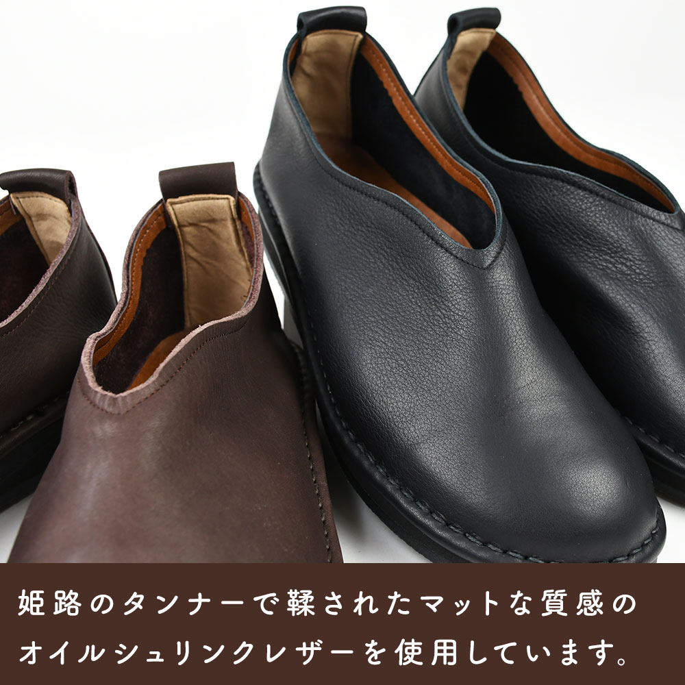 [素材について] ・国産オイルシュリンクレザー 日本の革の一大産地である兵庫県姫路エリアのタンナーで鞣されたレザーをしようしております。 たっぷりのオイルを含ませた天然のシボを活かしたシュリンクレザーは、柔らかで足馴染みが早いのが特徴です。 ツヤ感を抑えたマットな質感の素上げ調レザーは気取らないナチュラル感をコーディネートにプラスしてくれます。
