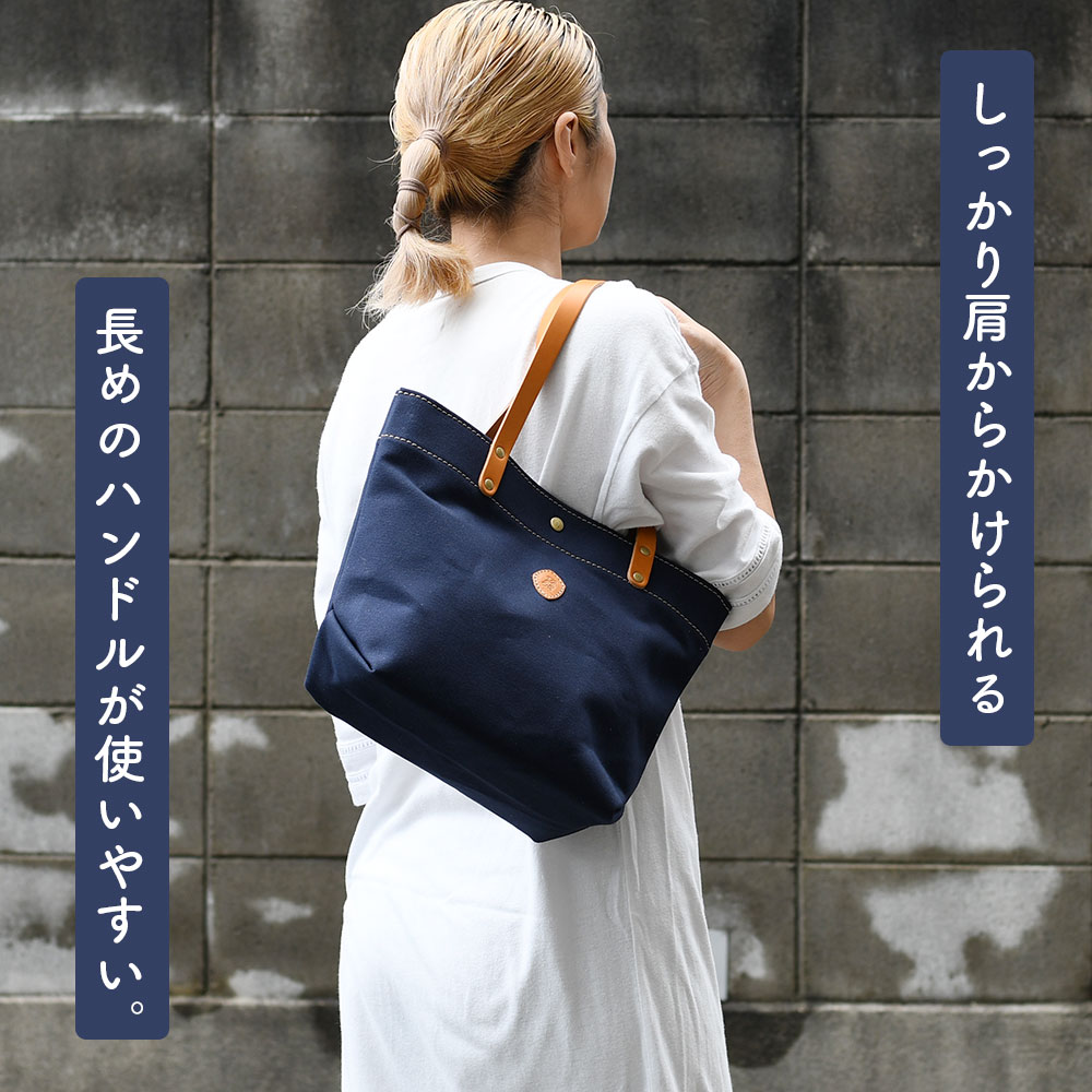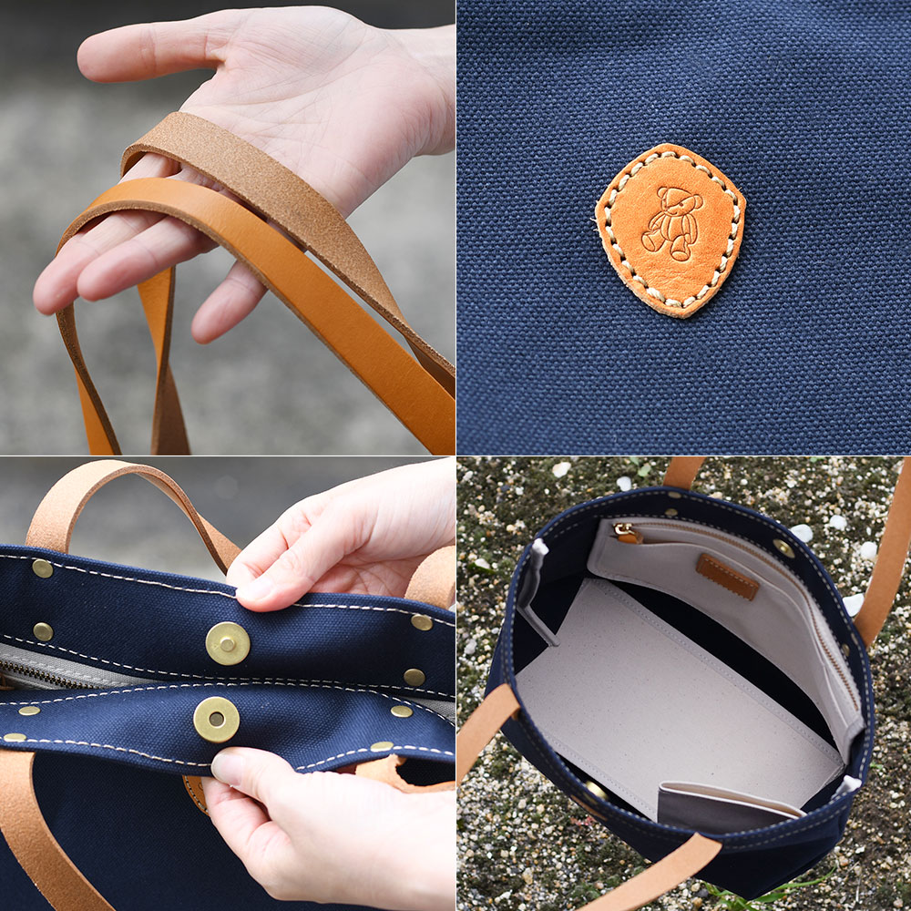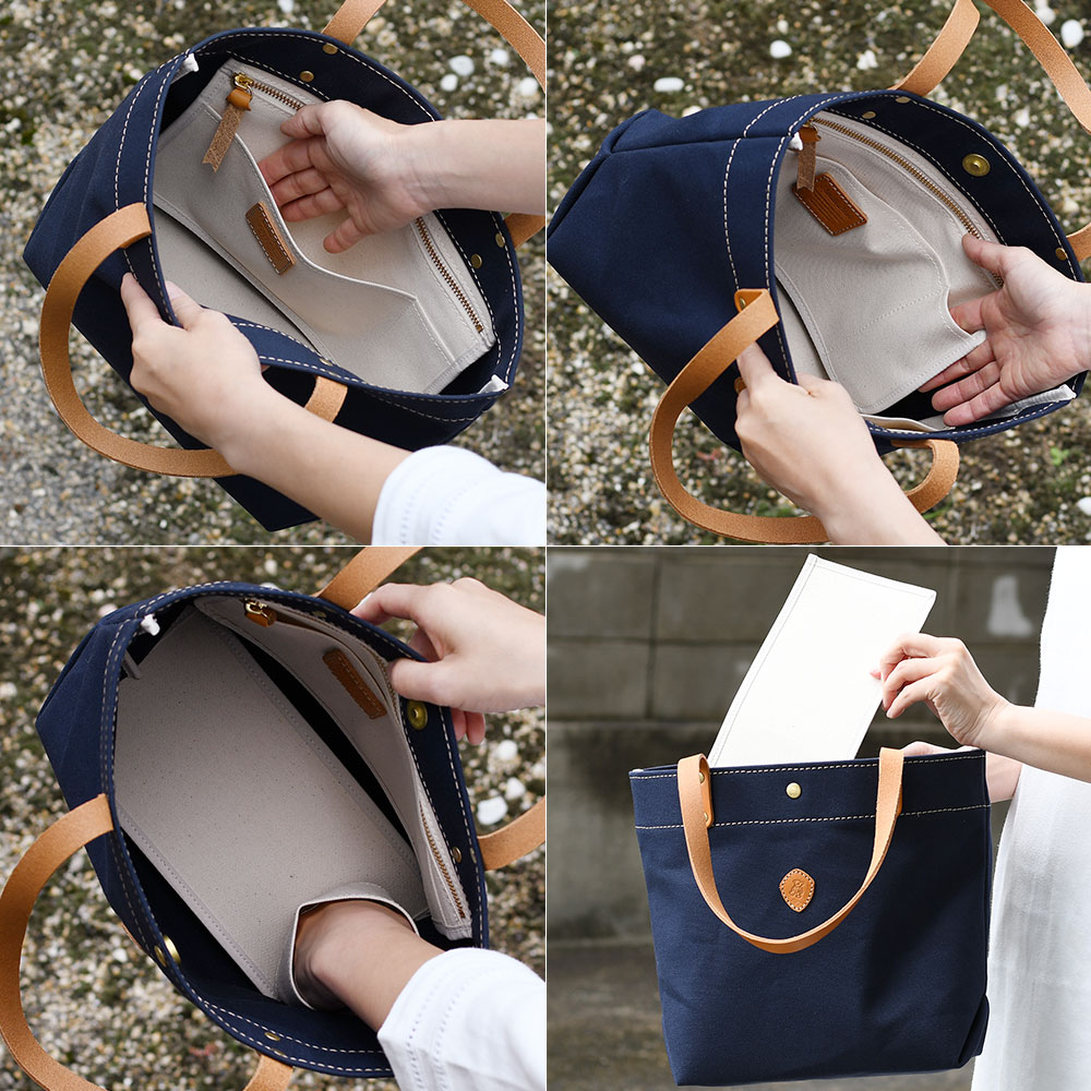 [アイテムについて] 落ち着きと発色の良さを兼ね備えた国産6号帆布と、栃木ピットヌメレザーをコンビに合わせたA4サイズ対応トートバッグ:Mサイズになります。メインポケットはマグネットボタンによる開閉で、中身に容易にアクセスが可能です。メインポケット内には、側面にファスナーポケットが1つとフリーポケットが1つ、さらに2~3本のペンを挿せるペンポケットが1つ付いています。またペットボトルホルダーも据え付けられておりますので、便利にお使いいただけます。大きすぎず小さすぎないちょうどいいサイズ感のバッグは、底板が取り外しできますので、荷物の多さやサイズ感に合わせてマチ幅をコントロールできます。ハンドル持ち手はしっかり長めですので、肘にかけても肩にかけてもお持ちいただけます。