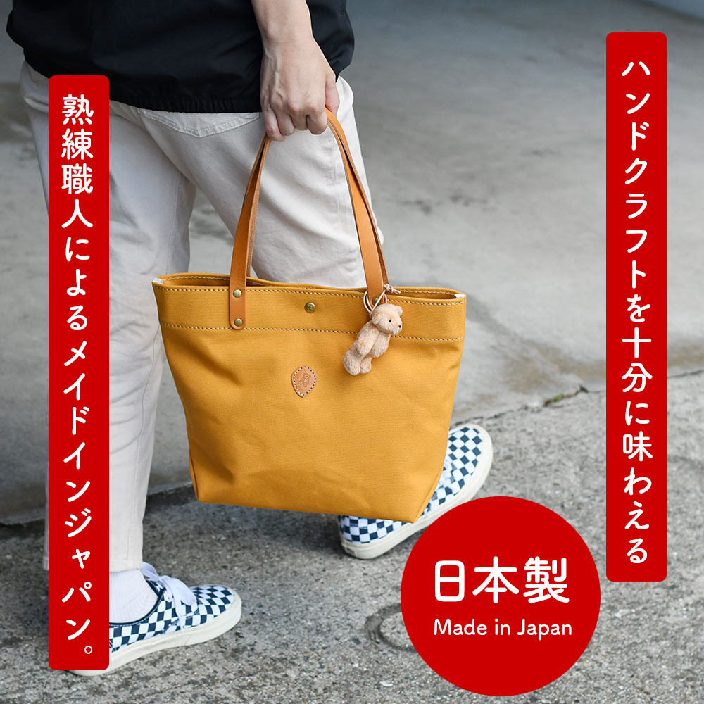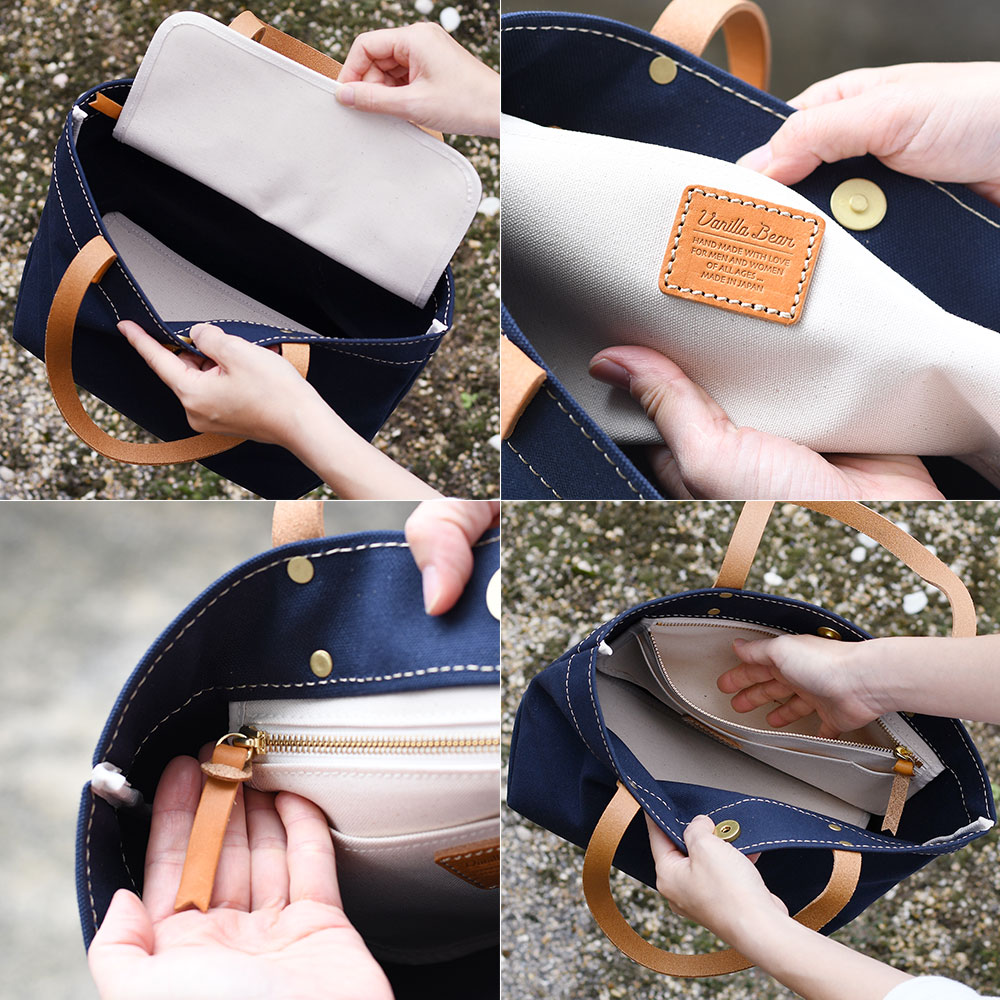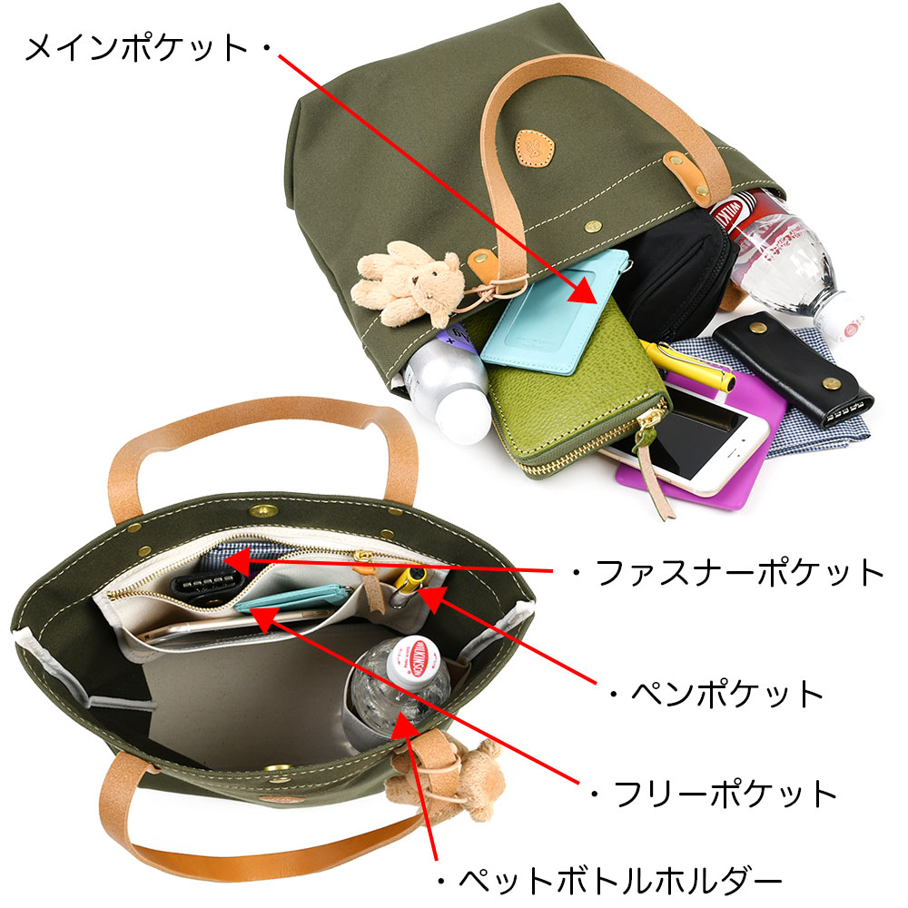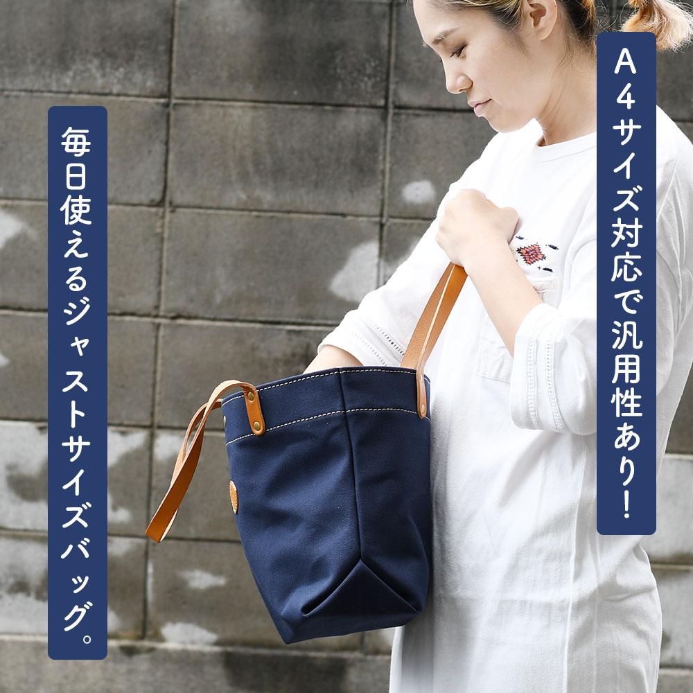 [アイテムについて] 落ち着きと発色の良さを兼ね備えた国産6号帆布と、栃木ピットヌメレザーをコンビに合わせたA4サイズ対応トートバッグ:Mサイズになります。メインポケットはマグネットボタンによる開閉で、中身に容易にアクセスが可能です。メインポケット内には、側面にファスナーポケットが1つとフリーポケットが1つ、さらに2~3本のペンを挿せるペンポケットが1つ付いています。またペットボトルホルダーも据え付けられておりますので、便利にお使いいただけます。大きすぎず小さすぎないちょうどいいサイズ感のバッグは、底板が取り外しできますので、荷物の多さやサイズ感に合わせてマチ幅をコントロールできます。ハンドル持ち手はしっかり長めですので、肘にかけても肩にかけてもお持ちいただけます。