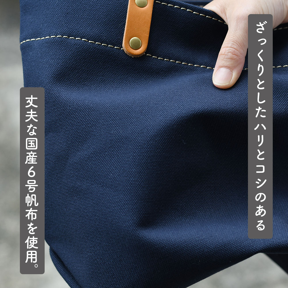 [素材について] ・国産6号帆布 ざっくりとした風合いと強めのハリ感とコシを持つ、国産6号帆布をメインに使用しております。しっかりと肉厚な6号帆布はコットン100%で丈夫で永くご愛用いただけます。また使い込むほどに繊維が解け、馴染みが良くなりますので、付属のレザーと共に経年変化をお楽しみいただけます。 ・栃木ピットヌメレザー 負荷のかかるパーツやアクセントとしての付属パーツには、日本を代表するタンナーである、栃木レザーのピットヌメを使用しております。ピットにより長い時間を掛けてじっくりとタンニンを浸透させておりますので、繊維がしっかりと詰まっており、伸びにくくなっておりますので、負荷のかかるパーツに最適です。