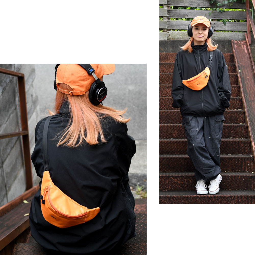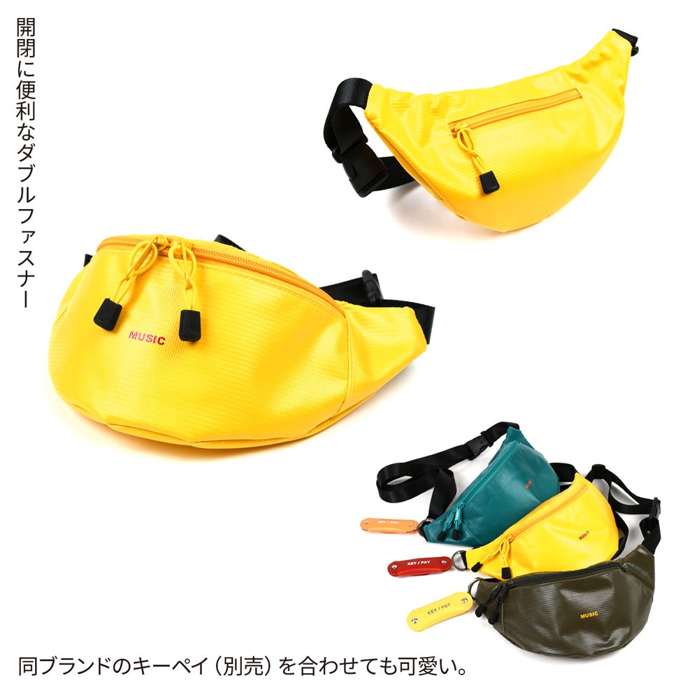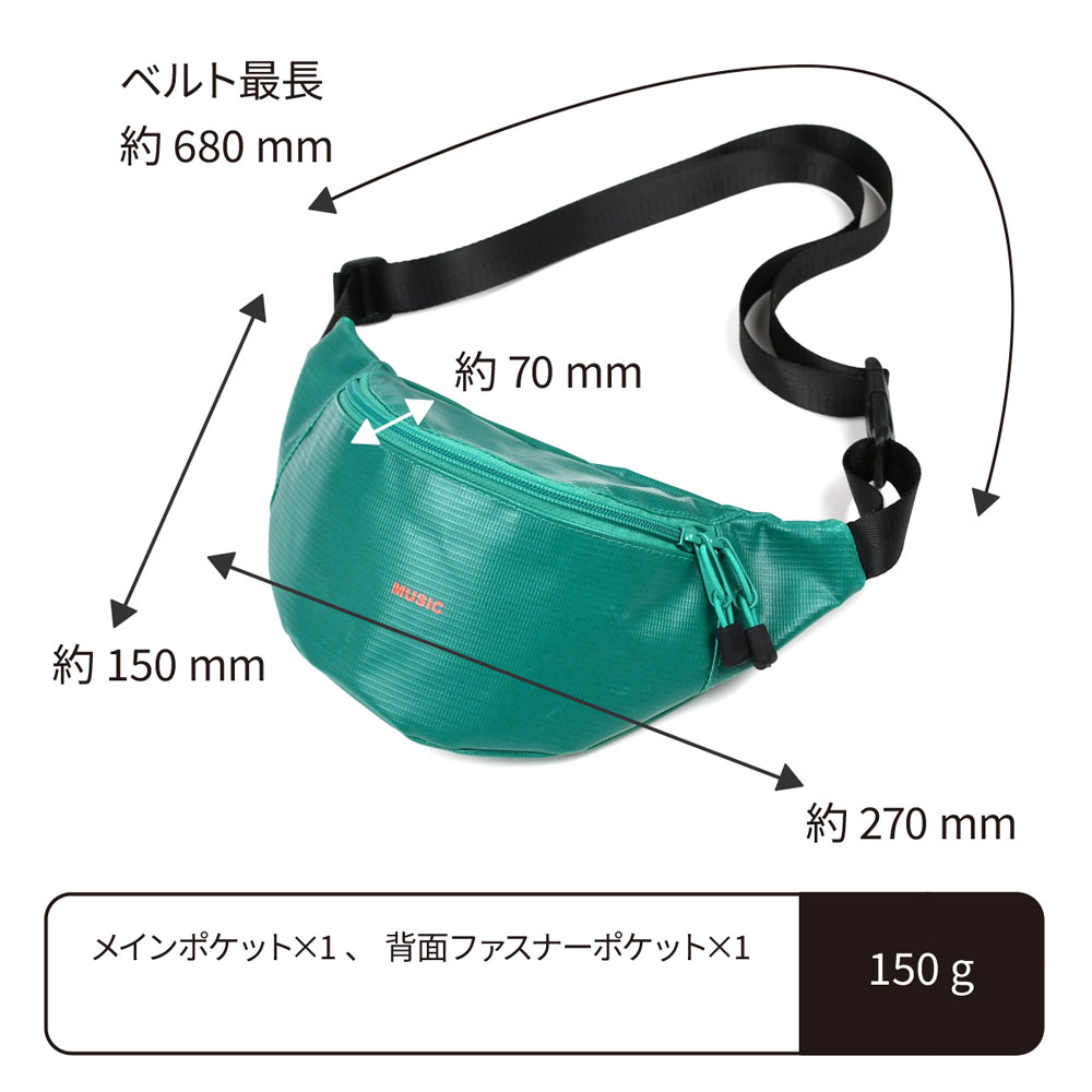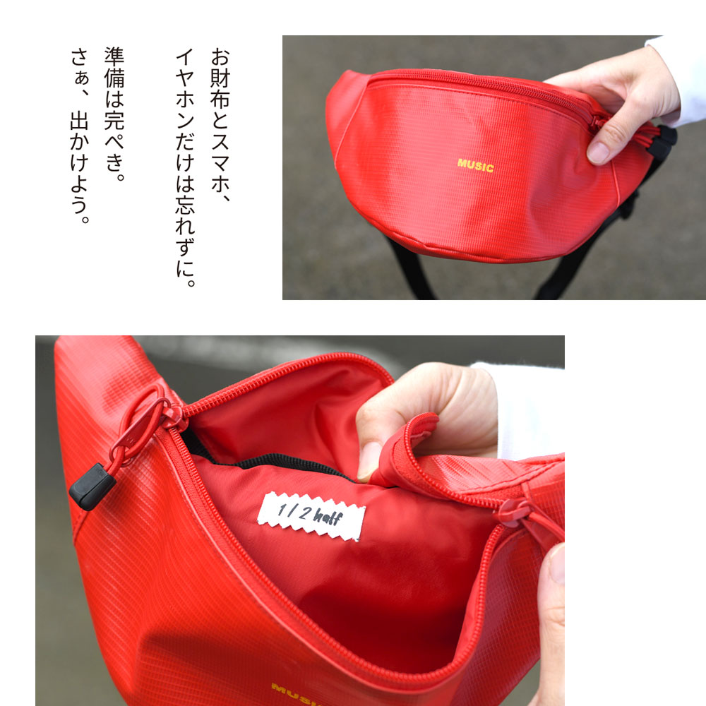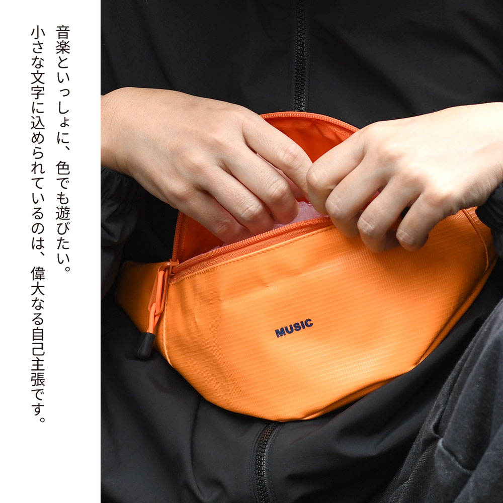 アイテムについて ハーフのミニウェストバッグは、お出かけに必要なお財布・スマホ(携帯)・イヤホンなどの小物を収納できる、コンパクトサイズのお手軽バッグです。腰巻きでウェストポーチとしてはもちろん、ベルトの長さを調整することで、斜めがけのボディバッグとしても使えます。前面にあるMUSICの文字は、デザイナーの「ちょっとくらいなら濡れたり、汚れたりしても平気なフェスバッグをつくりたいい」というメッセージをプリントしたもの。本体カラーとの配色が可愛いところも、ブランドのポップなイメージにぴったりです。収納面は、身の回りの持ち物が必要最低限で入る、というコンパクトなサイズ感。メインポケットの収納目安は、一般的な二つ折り財布とスマホに小物が少し、といったところ。ペットボトルなら、350ミリがジャストサイズ。ダブルファスナー仕様になっているので、開け閉めがスムーズで便利です。背面にあるファスナーポケットは、開口部がおよそ14センチと小さめですが、イヤホンやパスケースをはじめ、小さなものならスマートフォンを仕舞うこともできます。