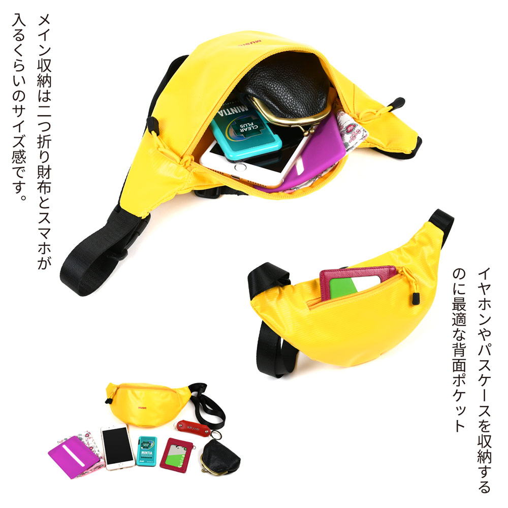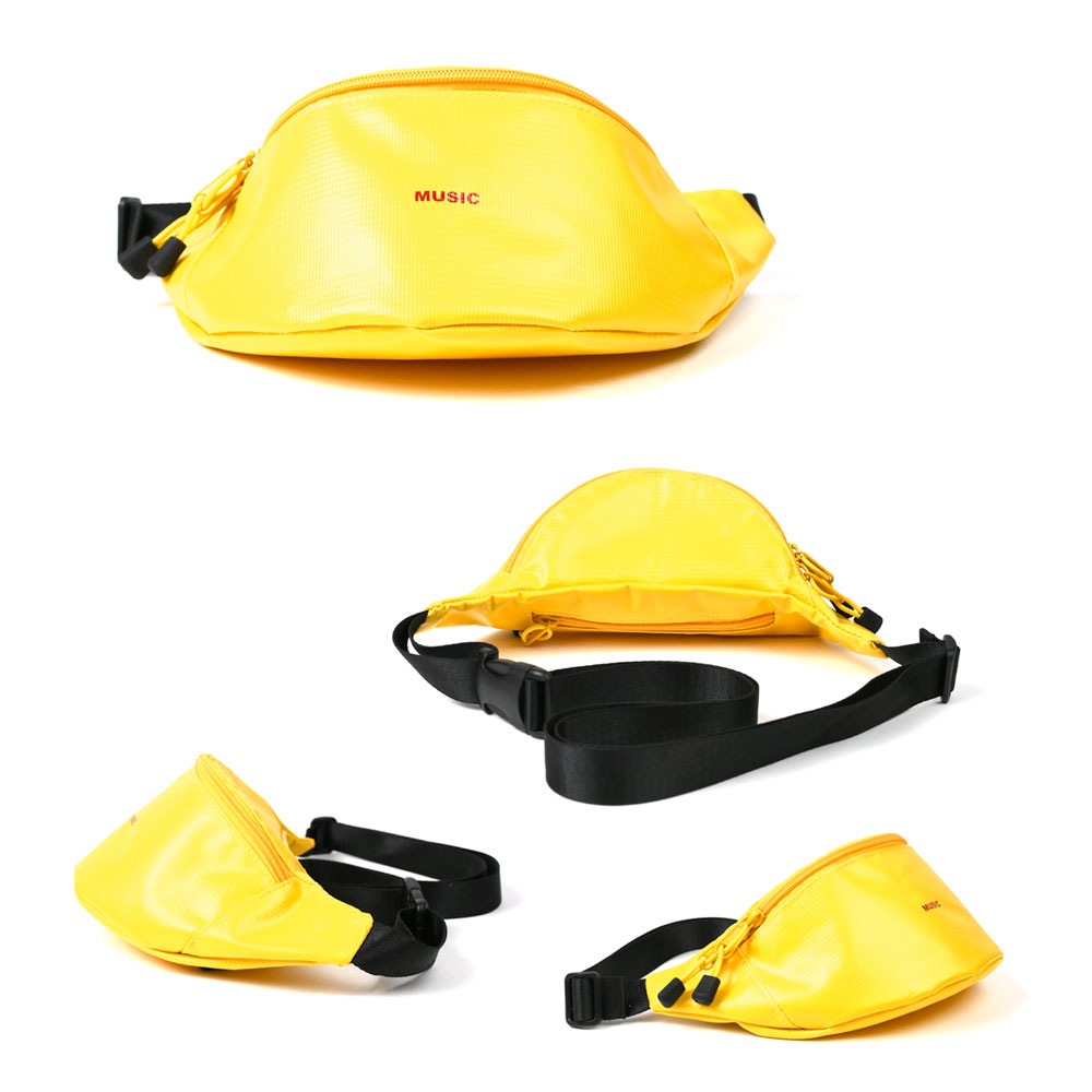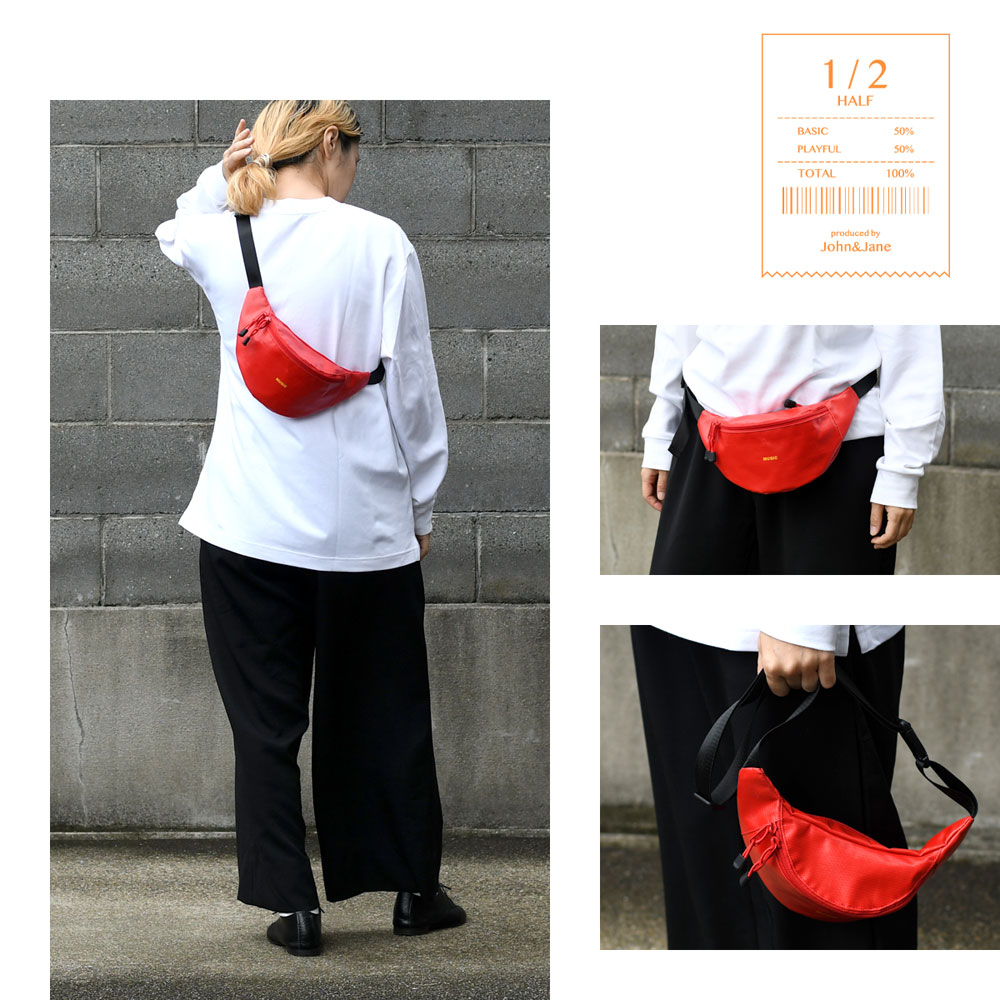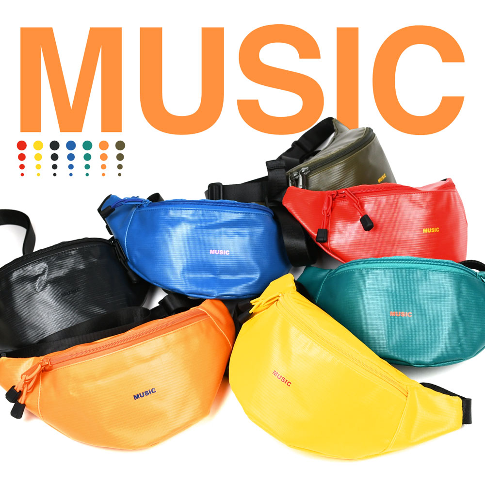 アイテムについて ハーフのミニウェストバッグは、お出かけに必要なお財布・スマホ(携帯)・イヤホンなどの小物を収納できる、コンパクトサイズのお手軽バッグです。腰巻きでウェストポーチとしてはもちろん、ベルトの長さを調整することで、斜めがけのボディバッグとしても使えます。前面にあるMUSICの文字は、デザイナーの「ちょっとくらいなら濡れたり、汚れたりしても平気なフェスバッグをつくりたいい」というメッセージをプリントしたもの。本体カラーとの配色が可愛いところも、ブランドのポップなイメージにぴったりです。収納面は、身の回りの持ち物が必要最低限で入る、というコンパクトなサイズ感。メインポケットの収納目安は、一般的な二つ折り財布とスマホに小物が少し、といったところ。ペットボトルなら、350ミリがジャストサイズ。ダブルファスナー仕様になっているので、開け閉めがスムーズで便利です。背面にあるファスナーポケットは、開口部がおよそ14センチと小さめですが、イヤホンやパスケースをはじめ、小さなものならスマートフォンを仕舞うこともできます。