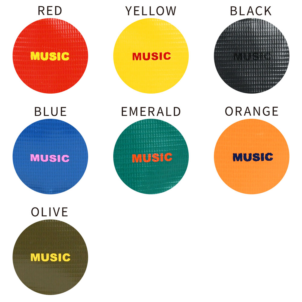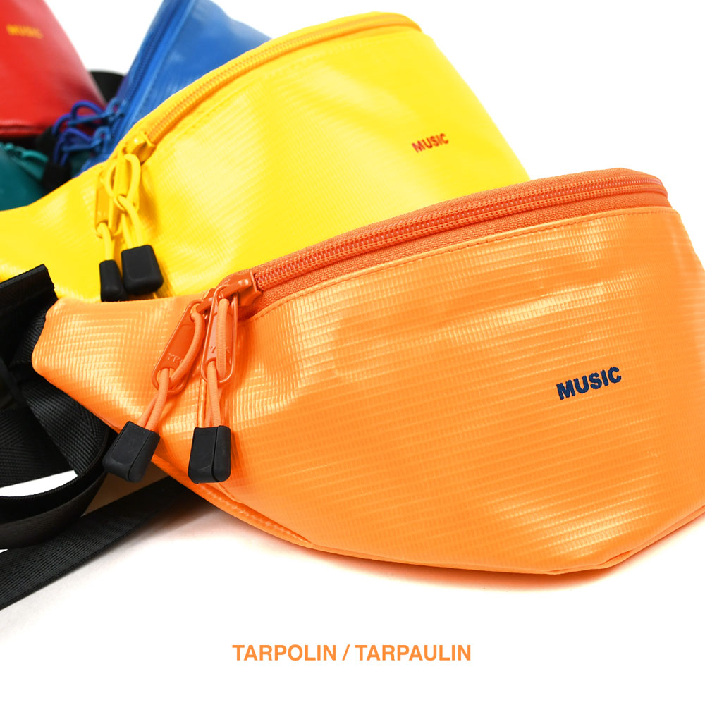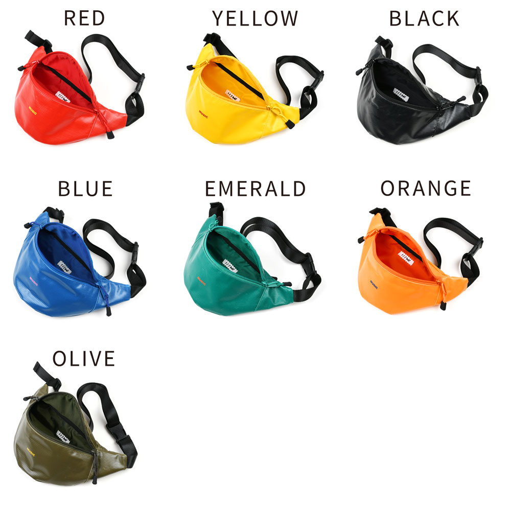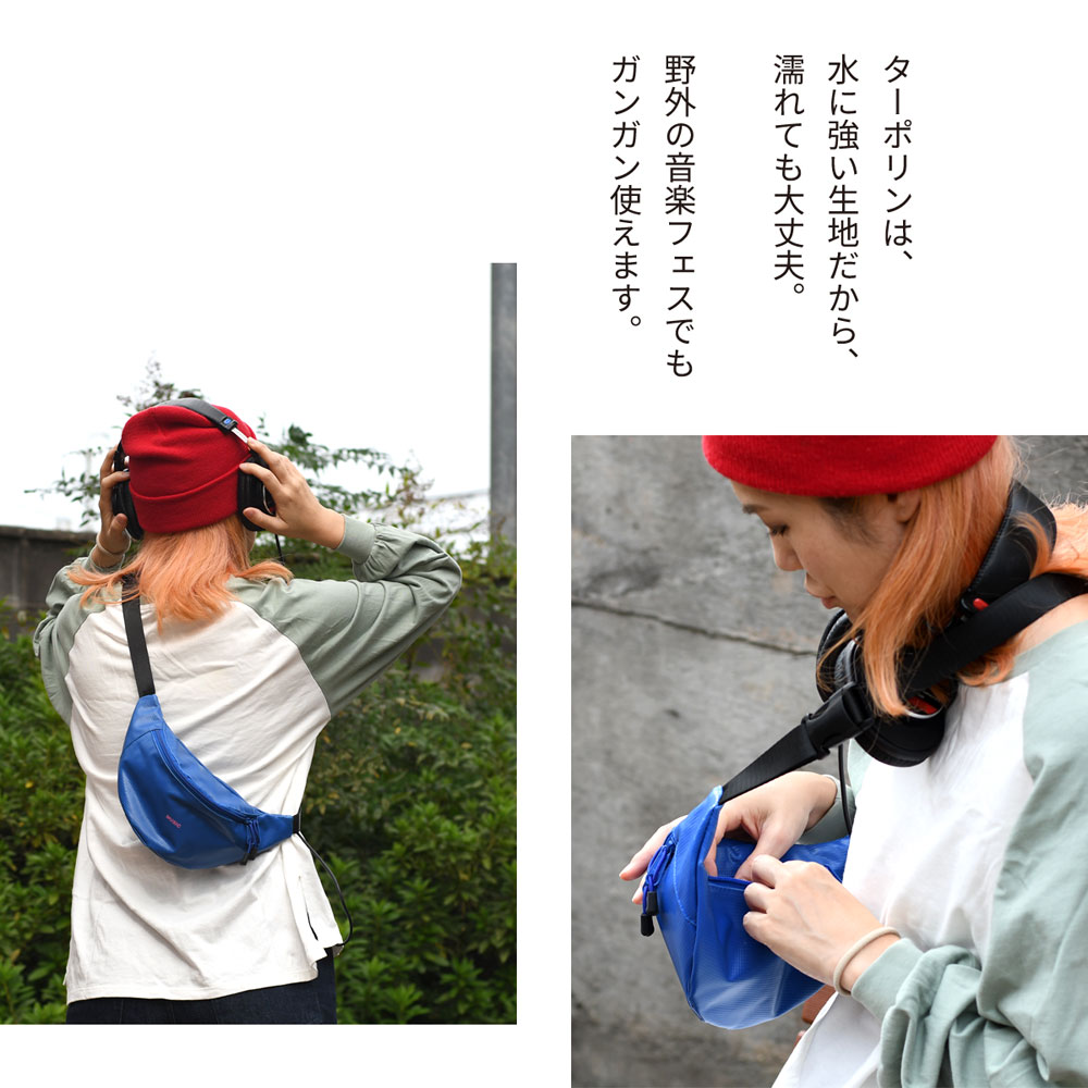 素材について 防水性に優れたターポリン素材を使用。ターポリンとは、ポリエステル繊維を合成樹脂フィルムで加工したシートのこと。耐久性にも優れているので、テントやタープをじはじめ、屋外や船上でも使われることが多い素材です。生地そのものが水に強いので、野外の音楽フェス・海や山などのレジャーでも、少しくらいの雨なら濡れても問題ありません。カラーは、定番のブラック、ターポリンならではの発色が魅力のレッド・イエロー・ブルー・オレンジ、ブルーグリーンな印象のエメラルド、ミリタリーっぽさも感じるオリーブの7色展開です。(※完全防水設計ではないため、中に水が入ってしまう可能性もあります。あくまでも、日常生活において水濡れに強いターポリンバッグとお考え下さい。)
