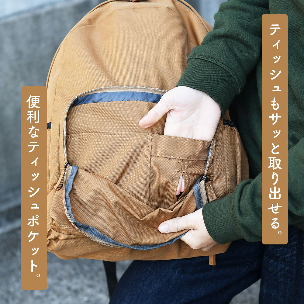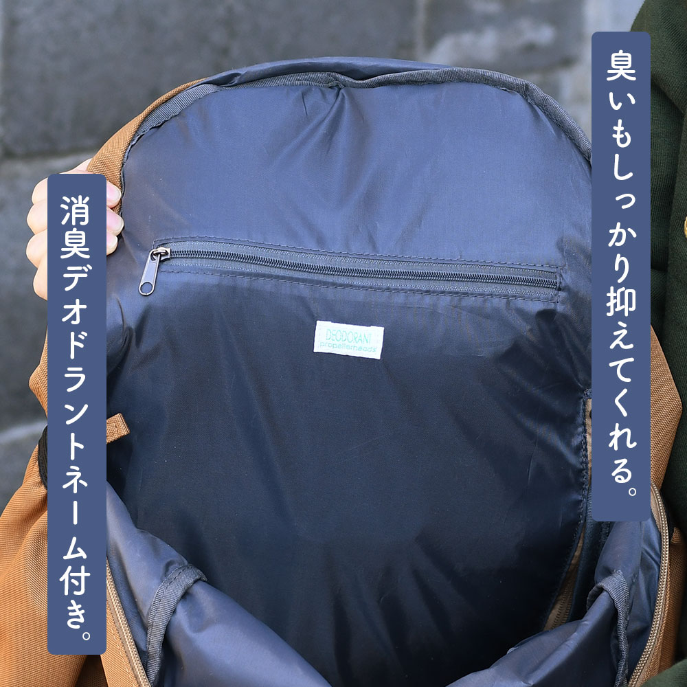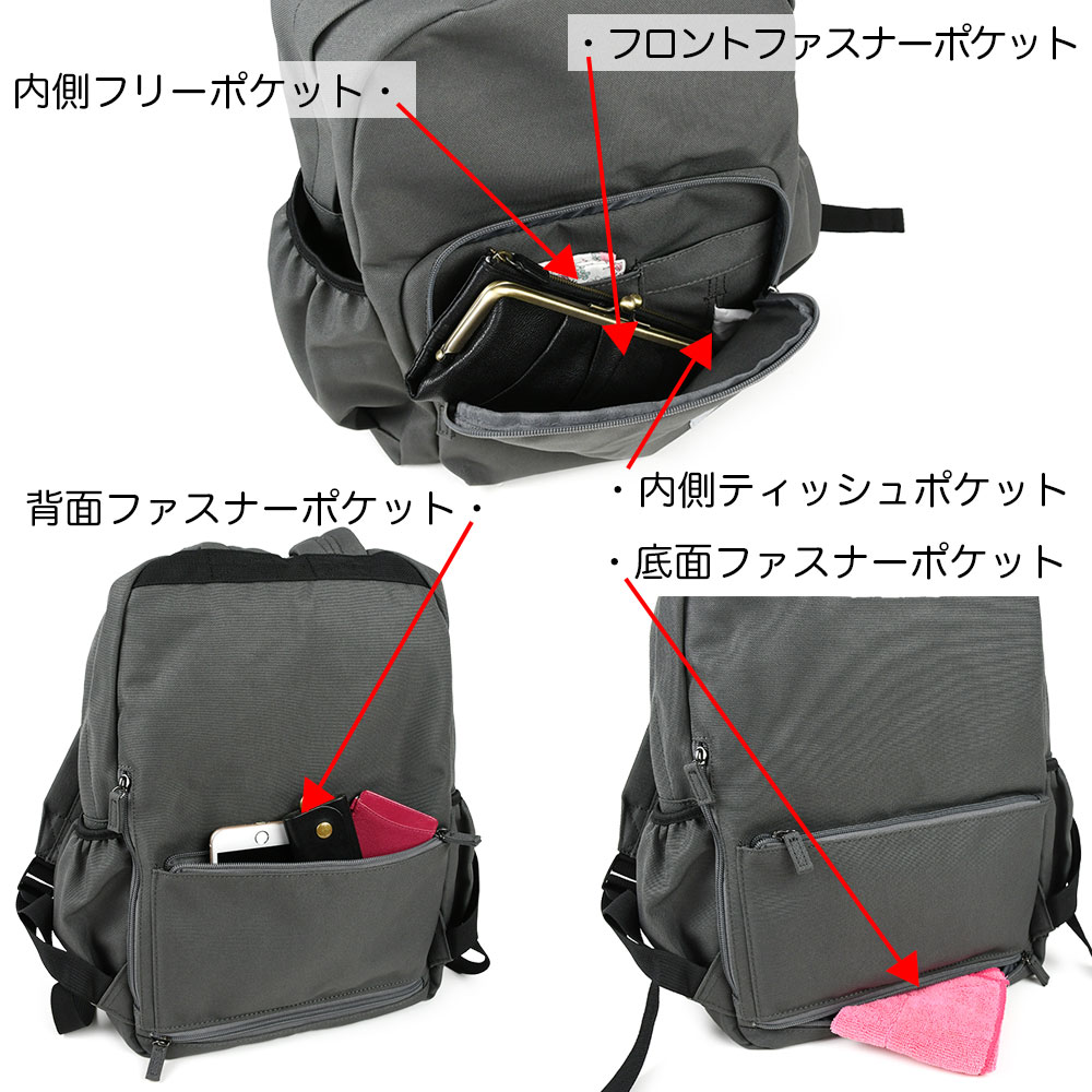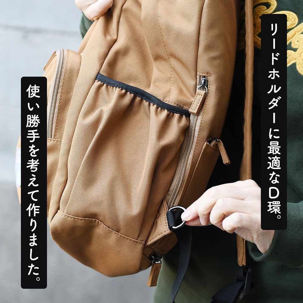 [アイテムについて] 撥水加工の施された軽量ポリエステルを使用したA4サイズ対応のリュックサック/バックパックになります。 メインポケットはWファスナー開閉で左右どちらにも開けられて、便利にお使いいただけます。 メインポケット内には、ファスナーポケットが1つだけのシンプルで自由度の高い設計となっております。 背面サイドにはメインポケットへのショートカットファスナーがあり、クイックなアクセスにも対応します。 外側フロントにはファスナーポケットがあり、内側にばフリーポケットが1つとティッシュケースホルダーが設置されています。 背面にはファスナーポケットが1つあり、長財布なども収納可能です。 底面背面側にもファスナーポケットがあります。こちらのポケットはメインポケット内を生地によって仕切られた形となっております。底面ポケットにはメインポケットには一緒に入れたくない汚れものなどを収納して、底にキープすることができます。 両サイドにはサイドポケットがそれぞれあり、ペットの排泄後の清掃用の水と、ご自身の水分補給用の水などを分けて持ち運ぶことができます。 ベビーカーやショッピングカート、ペット用のカートなどに直接吊り下げられる、カート用ホルダーが2本ついており、上部のD環を使用してぶら下げることができます。 また、ショルダーベルト下部付け根あたりには両サイドにD環がついており、ペット用のリードをつなげるのに最適です。 メインポケット内には消臭機能を持つデオドラントネームが縫い付けられております。 デオドラントネームはニオイの元になるアンモニアなどを多量に吸収し、消臭効果を発揮します。活性炭などの従来の吸着剤に比べ、5~20倍の吸着能力を持っています。また通常の消臭繊維製品に比べて即効性にも優れています。