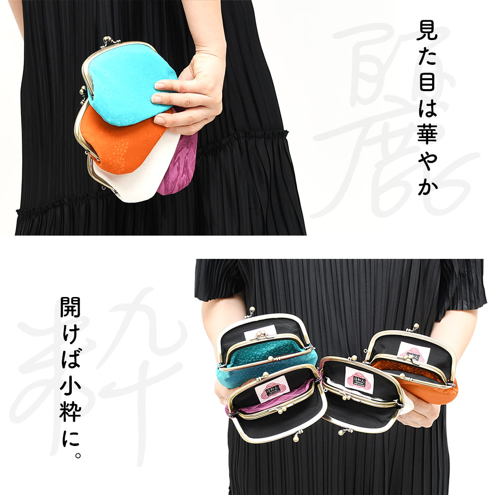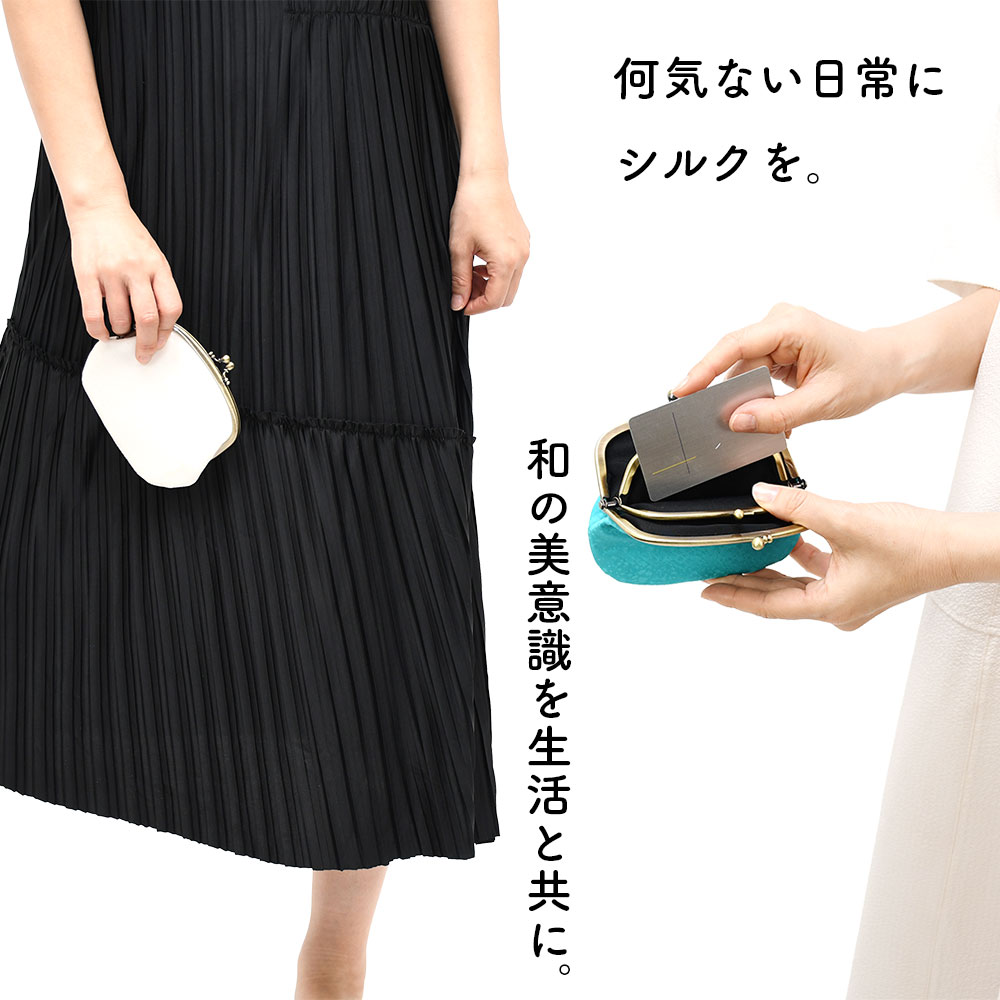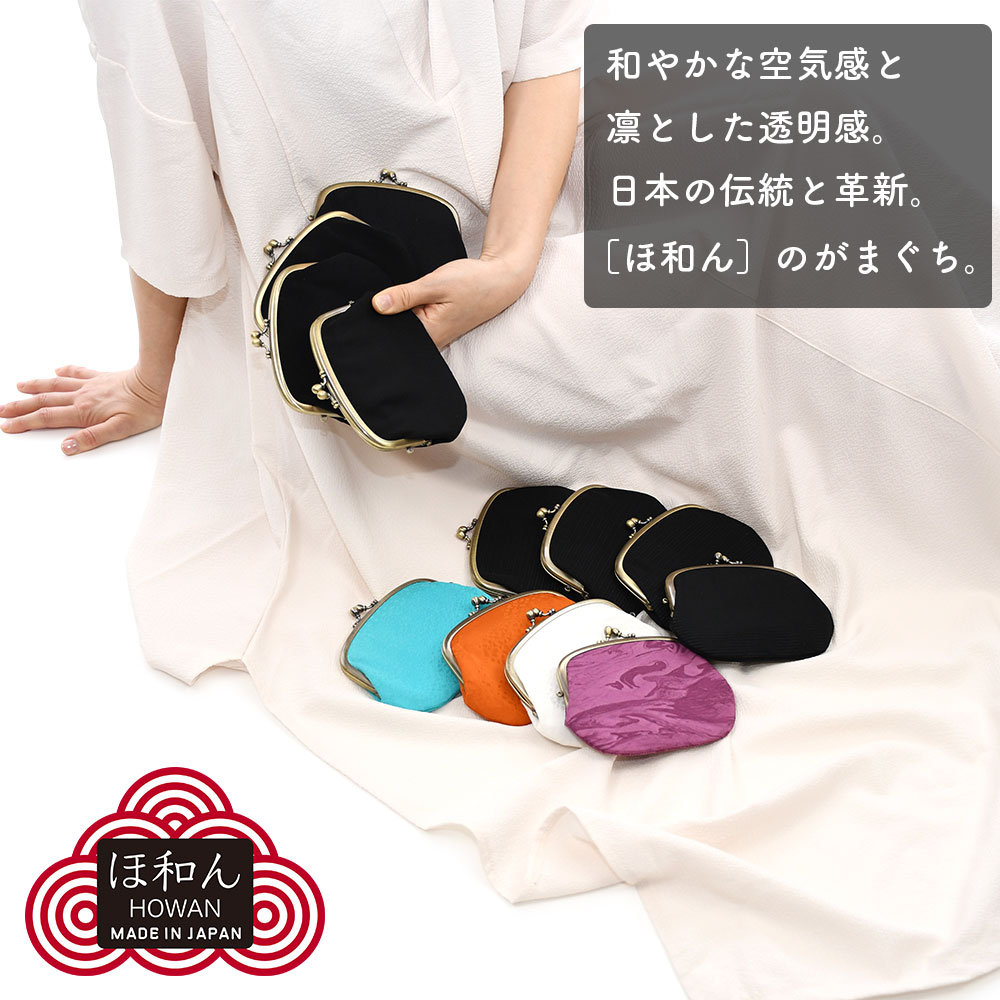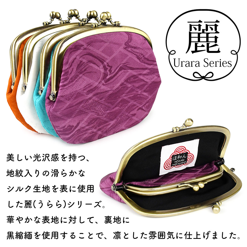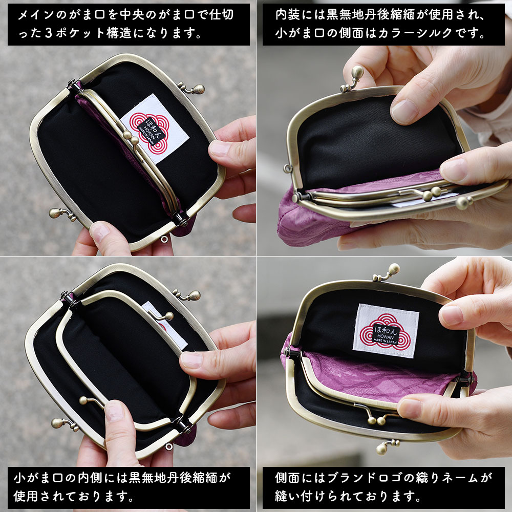[ブランドについて] 「ほ和ん」は、がま口の持つレトロでモダンな雰囲気と、丸みのあるカーブラインの柔らかな印象にちなんだ“がまぐち専門”ブランドです。 一般的ながま口はポリエステルなど化学繊維製が多いですが、ほ和んでは日本製の最高級正絹(丹後ちりめんなど)を使用。 シルクの持つ奇跡のような天然繊維の上質さを日常に溶け込ませるものづくりを心がけています。